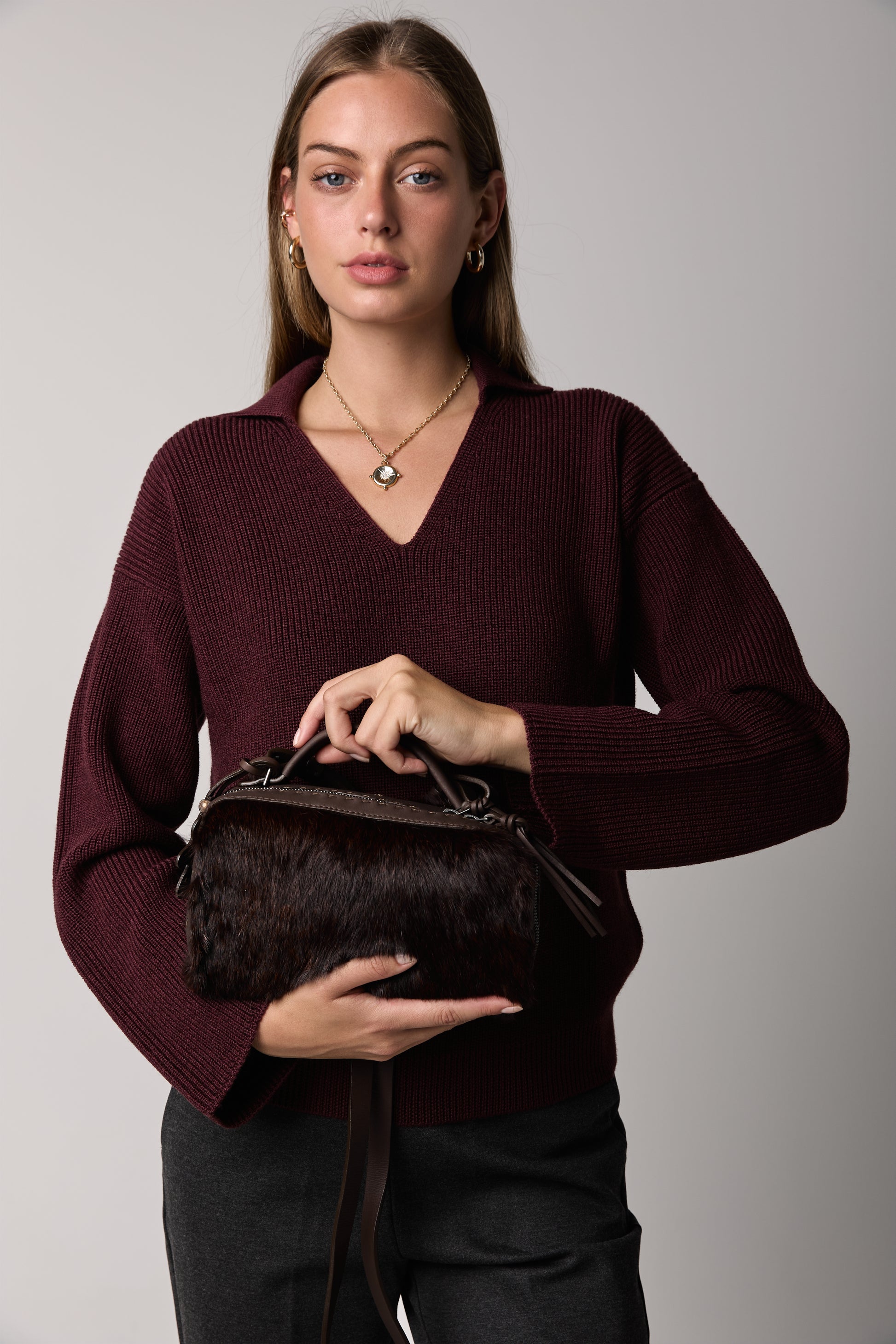 The MAX MARA Acceso Wool Sweater in Bordeaux is crafted in 100% virgin wool, using the finest Filato Pura Lana 2/30 yarn for a soft, lightweight, and luxurious feel. Its modern design features a deep V-neckline with a sleek collar, blending relaxed elegance with timeless sophistication. A versatile wardrobe essential, it transitions effortlessly from elevated daywear to elegant evening settings.