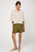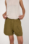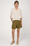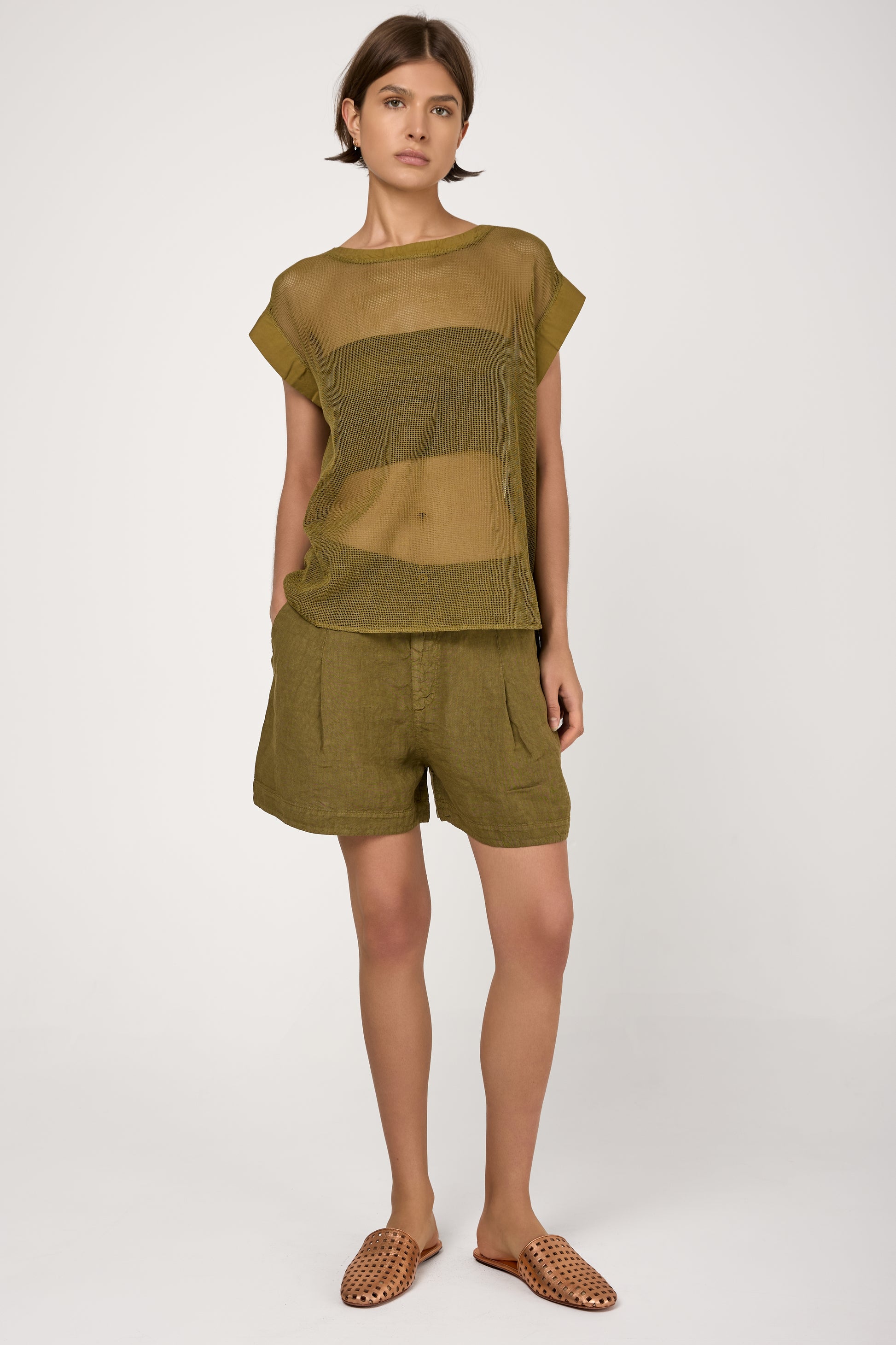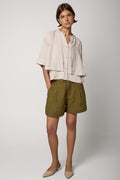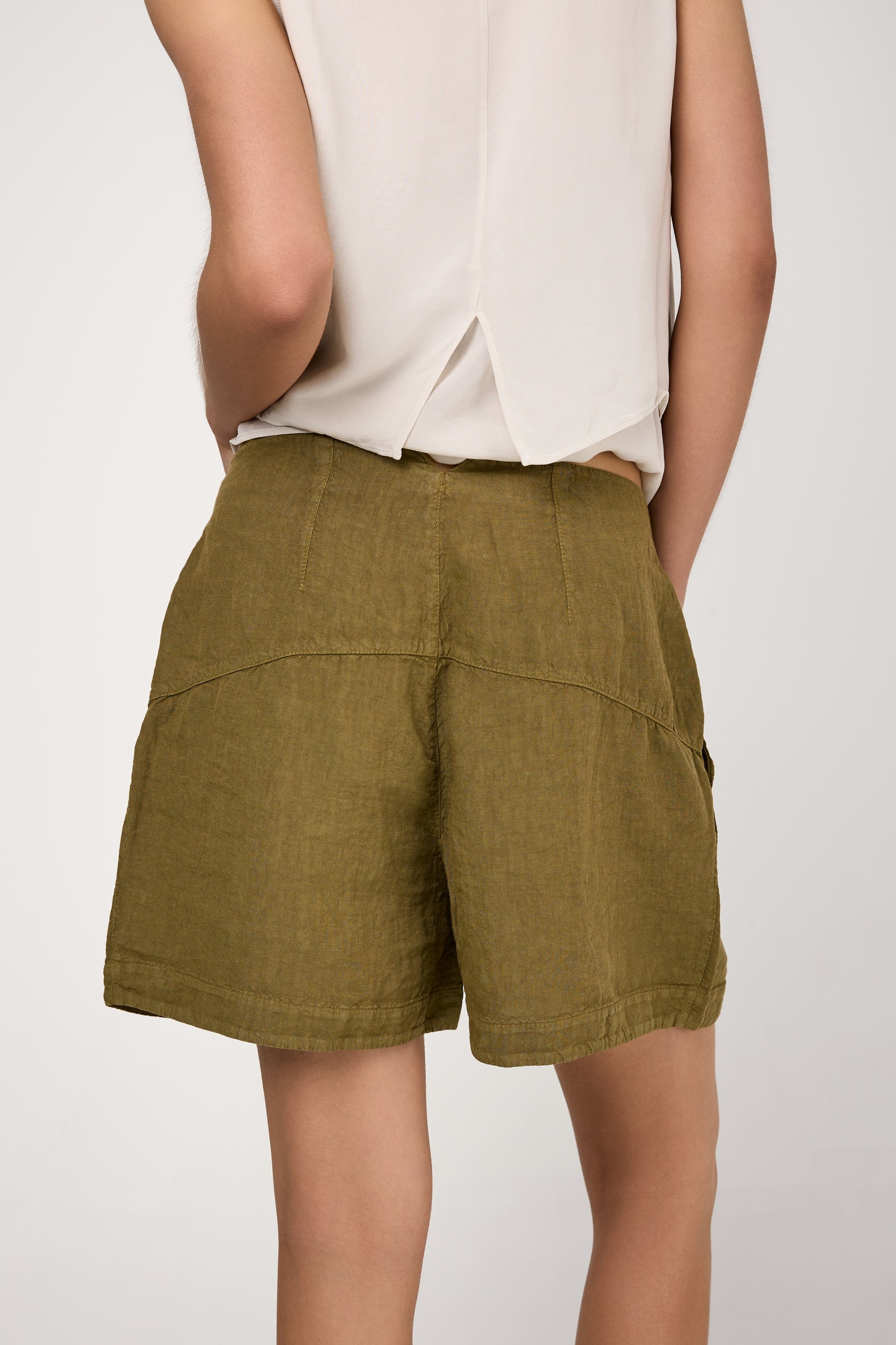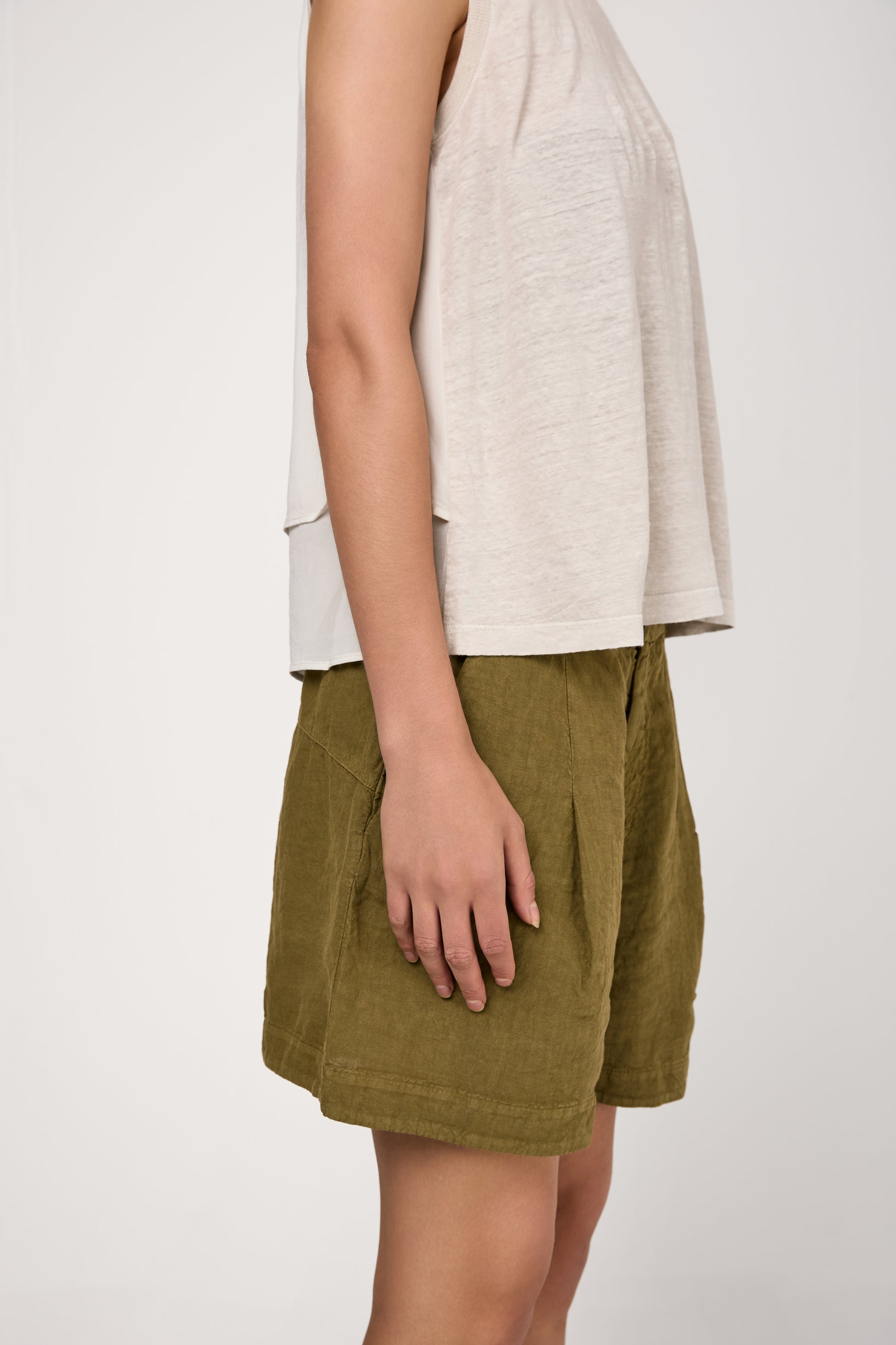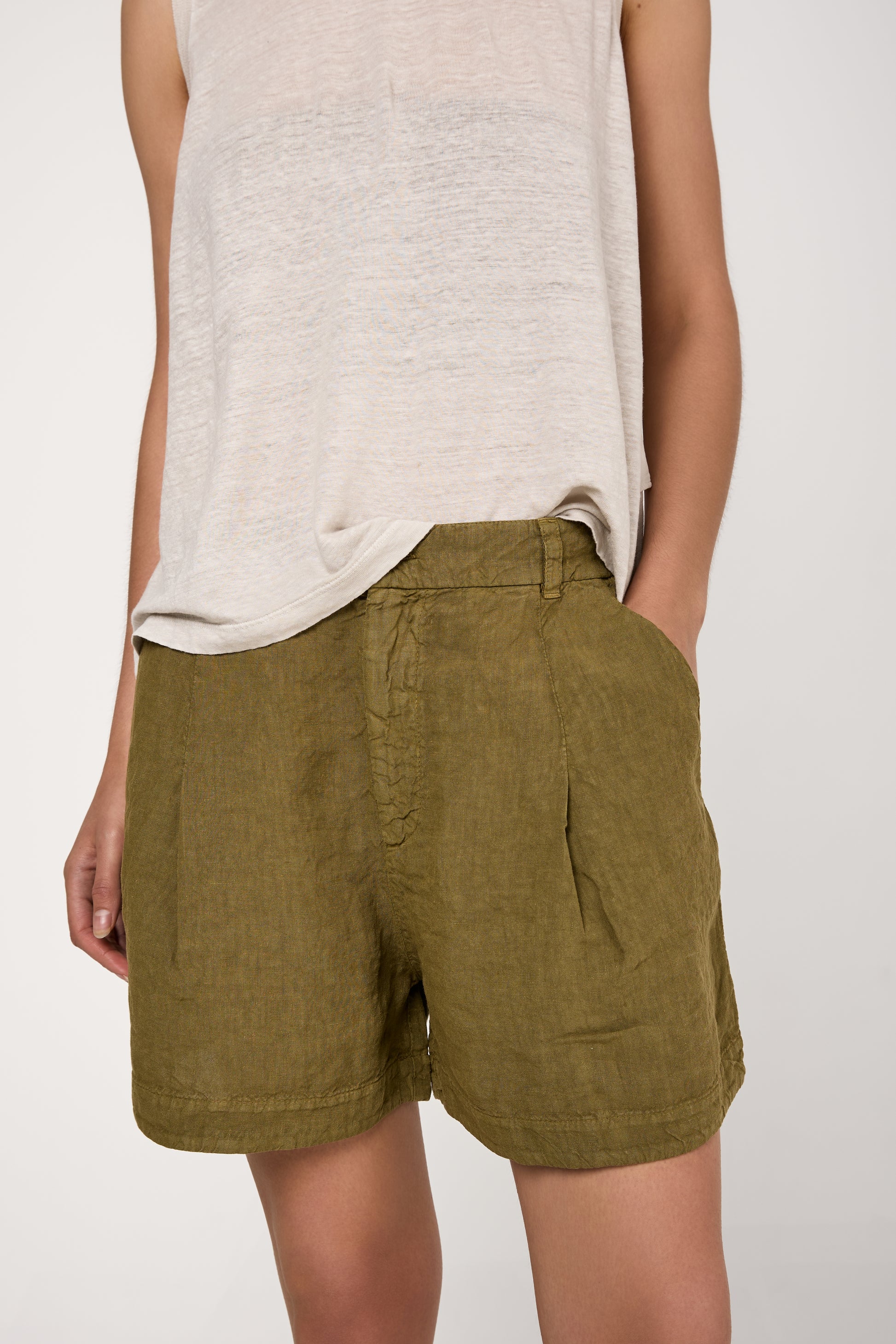 The TANDEM Linen Bermuda Shorts in Leaf are crafted in Italy from lightweight linen in a fresh leaf green tone. These shorts are designed with a flattering mid-rise and a fluid, straight-leg silhouette that drapes effortlessly. The design is finished with side pockets and a smooth front closure, balancing functionality with refined simplicity.