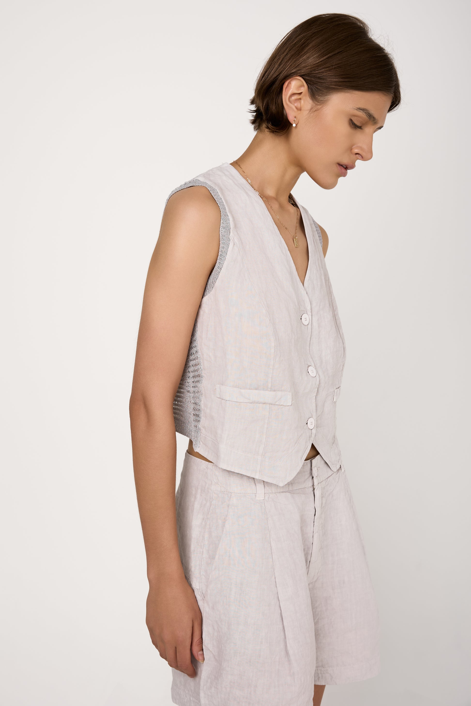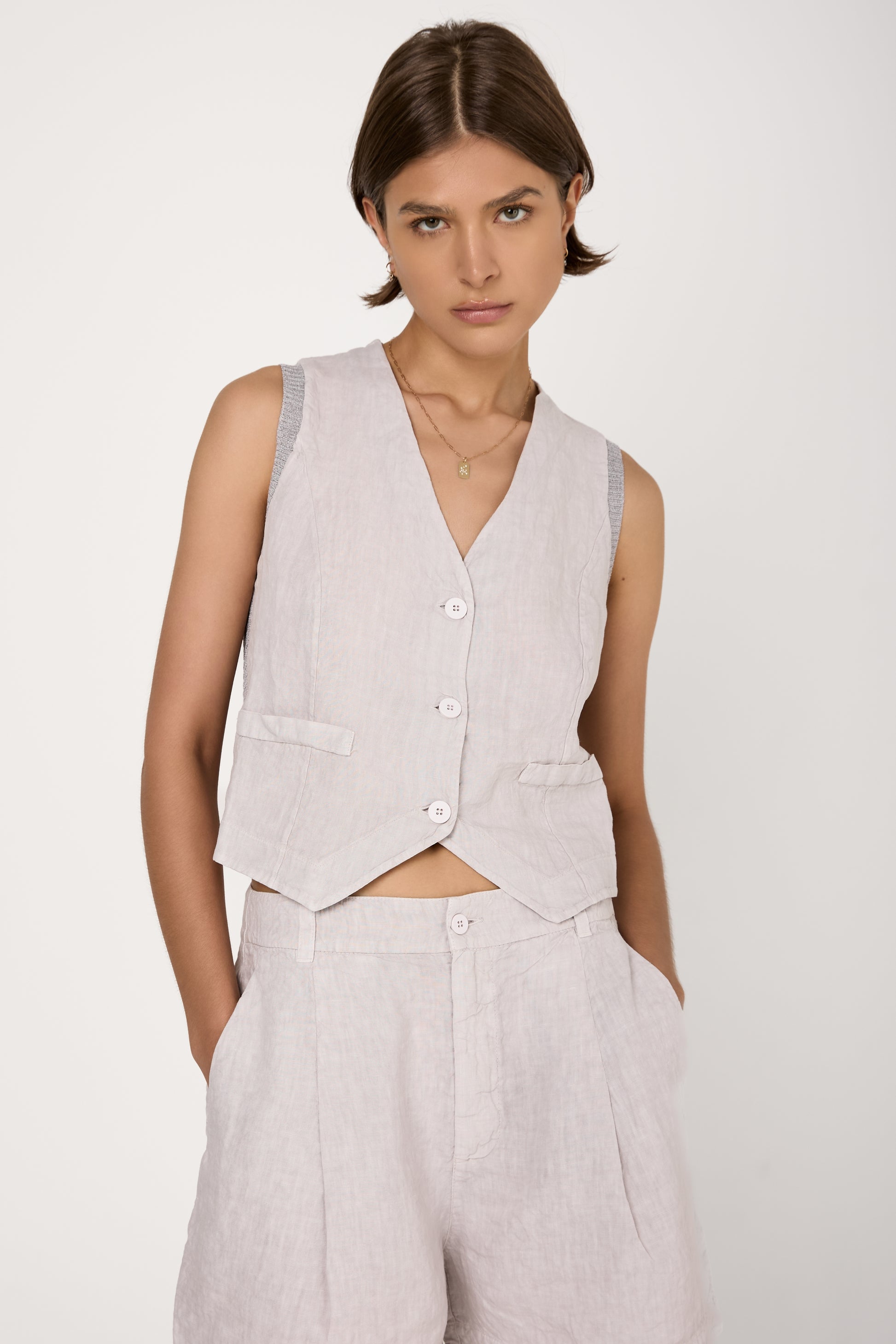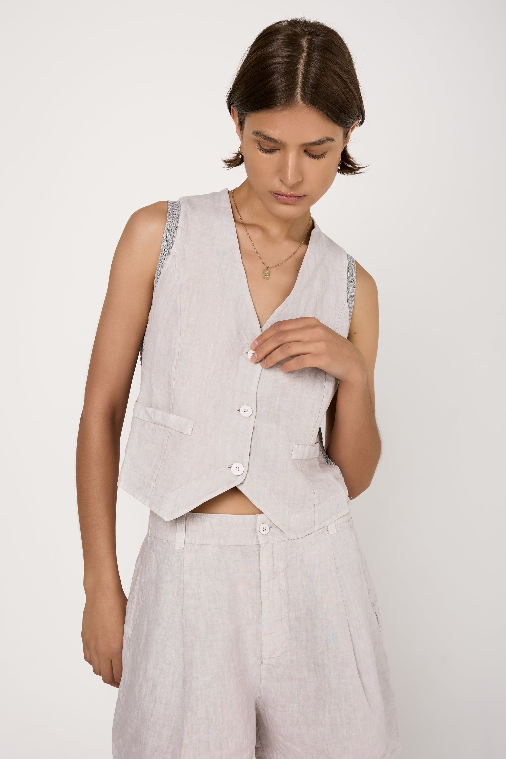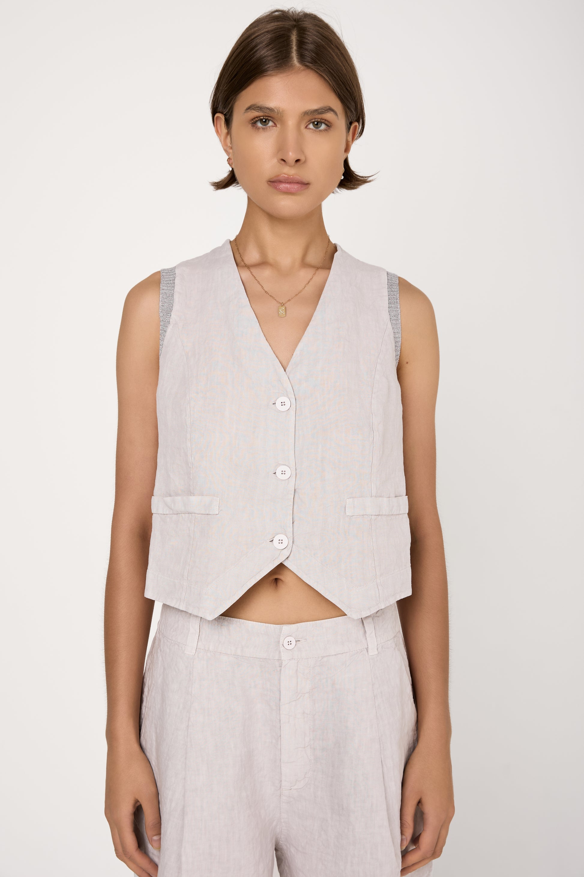The TANDEM Linen Button-Down Vest in Ice is cut from pure linen in a refined ice shade and features a deep V-neckline, a sharp pointed hem, and a delicate button-down front. Designed to skim the waist and flatter the silhouette, it includes subtle darting for added shape.