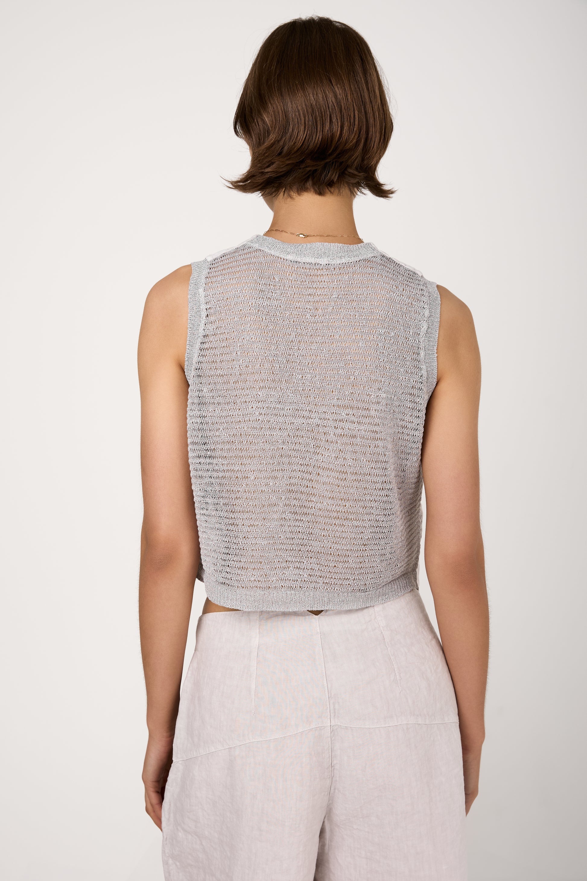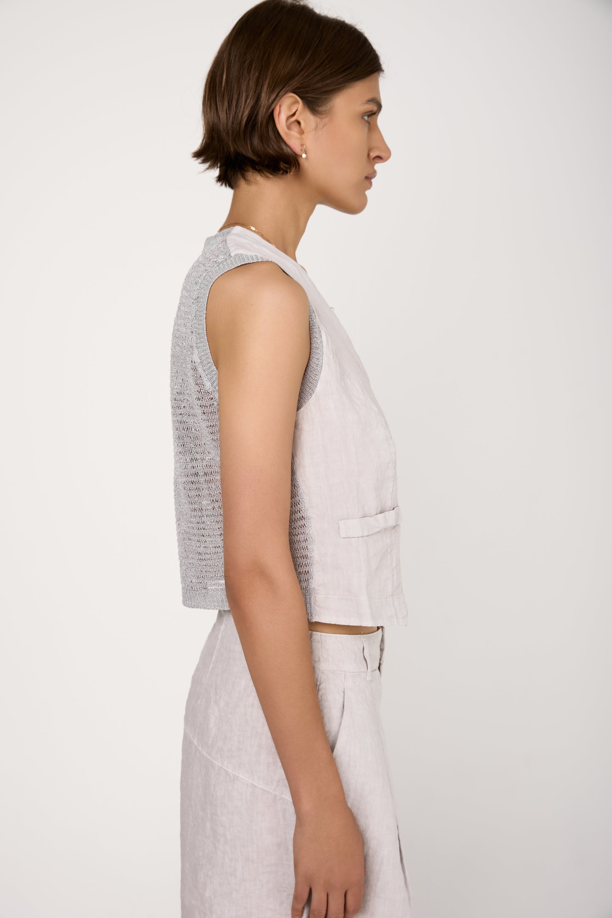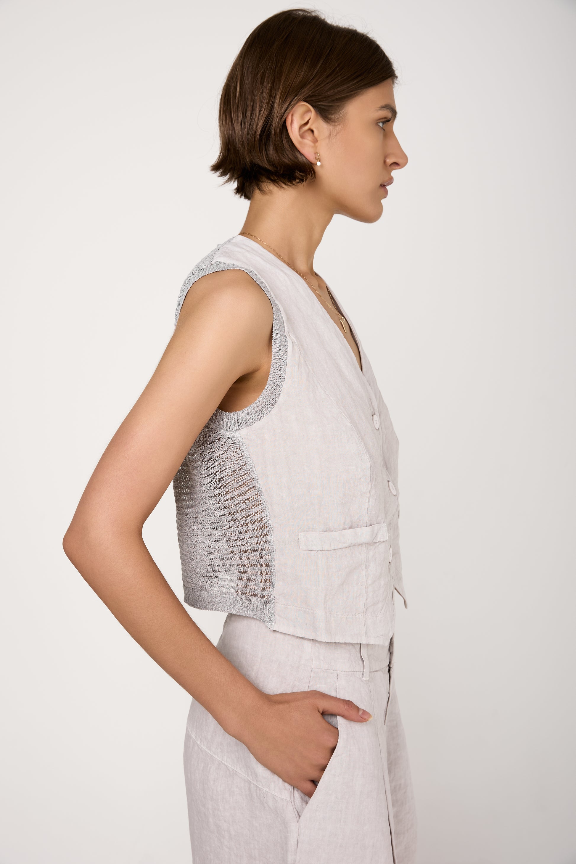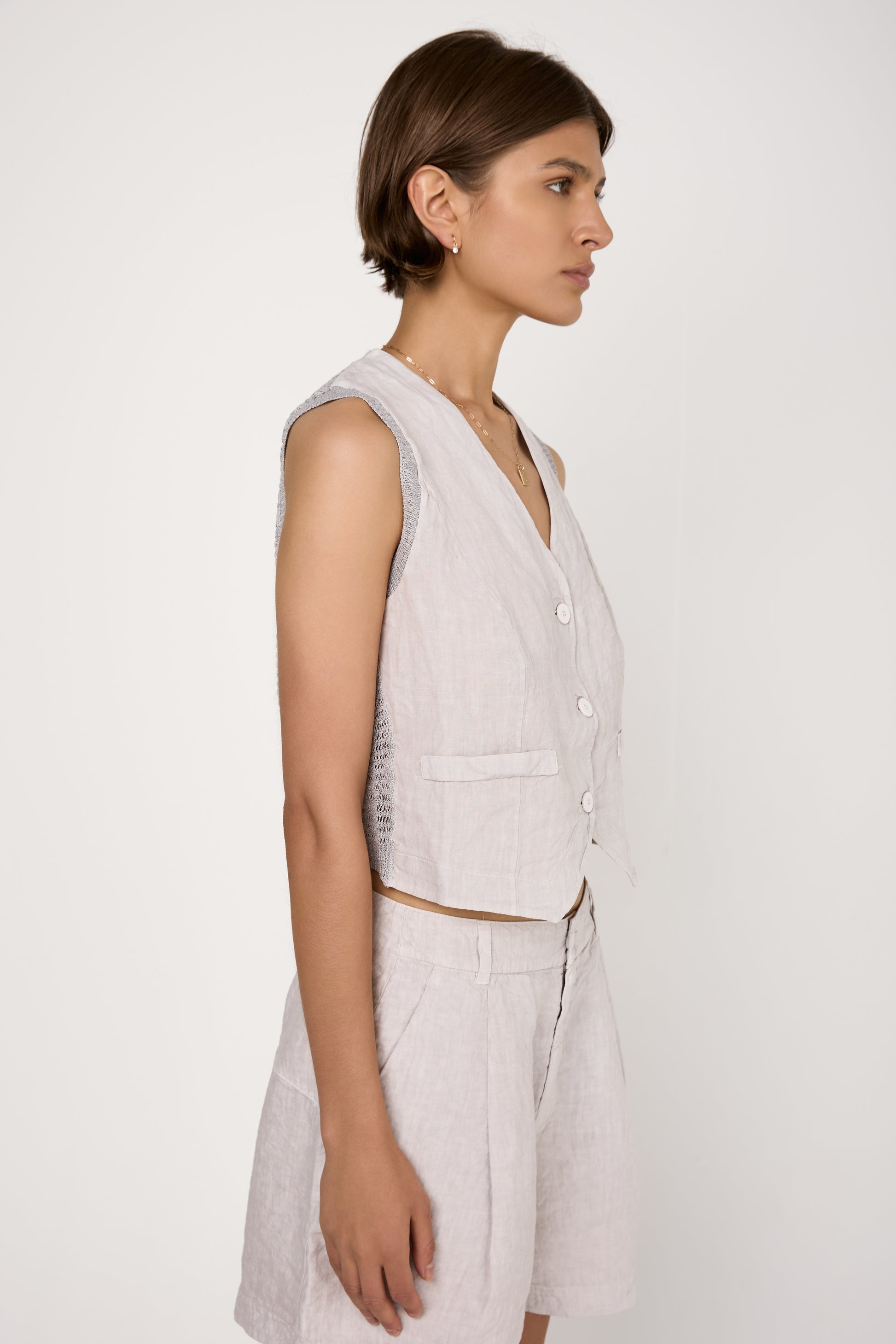 The TANDEM Linen Button-Down Vest in Ice is cut from pure linen in a refined ice shade and features a deep V-neckline, a sharp pointed hem, and a delicate button-down front. Designed to skim the waist and flatter the silhouette, it includes subtle darting for added shape.