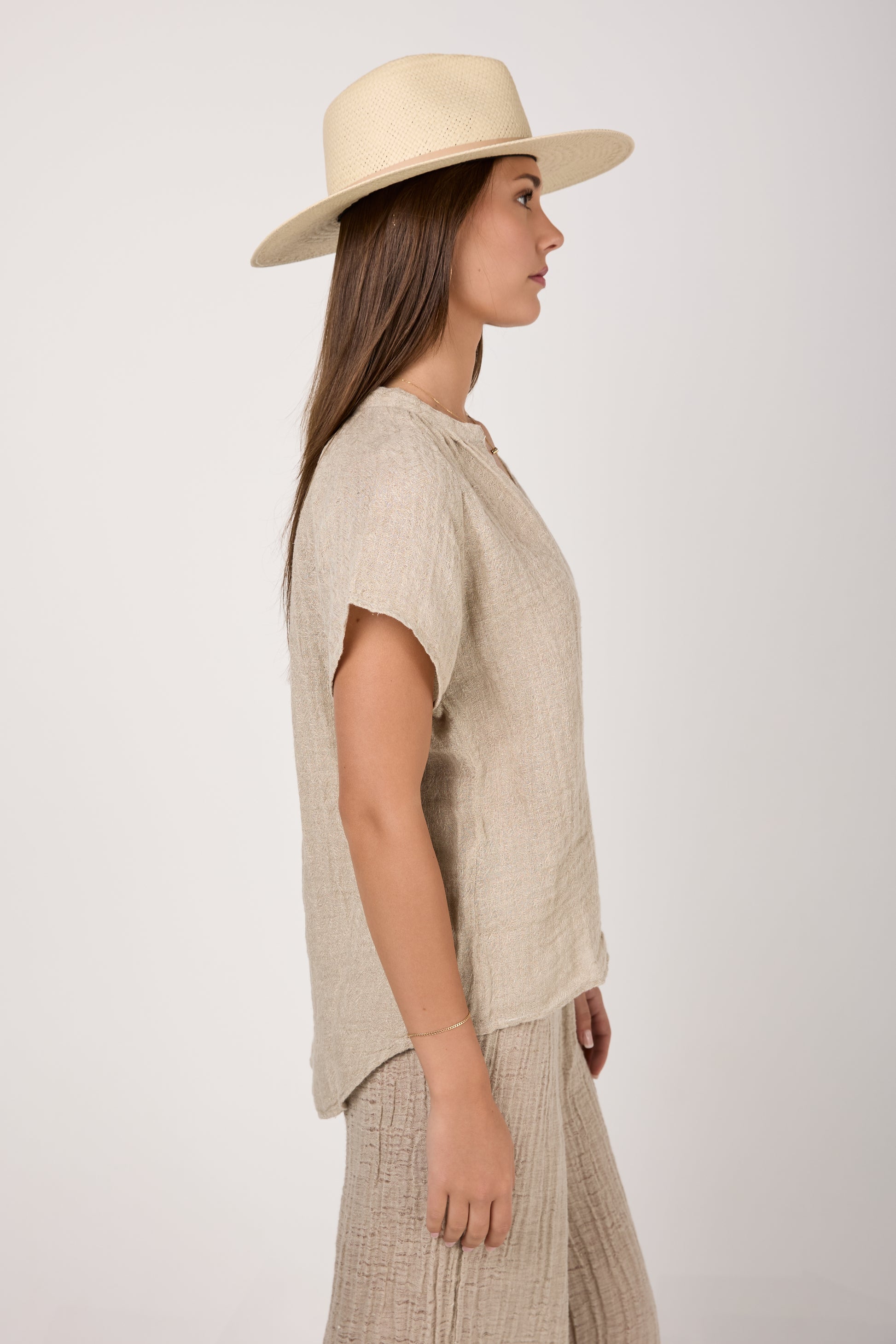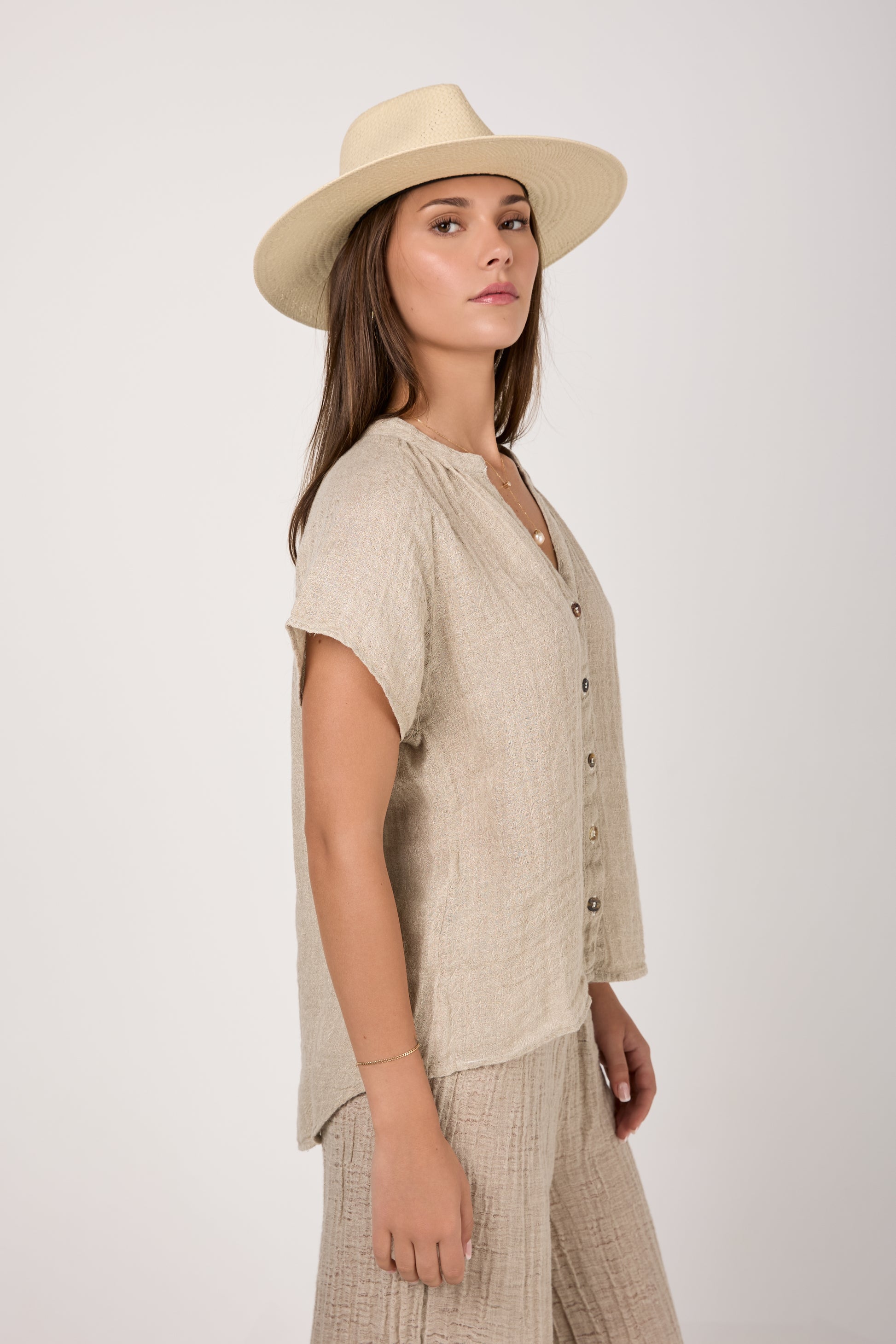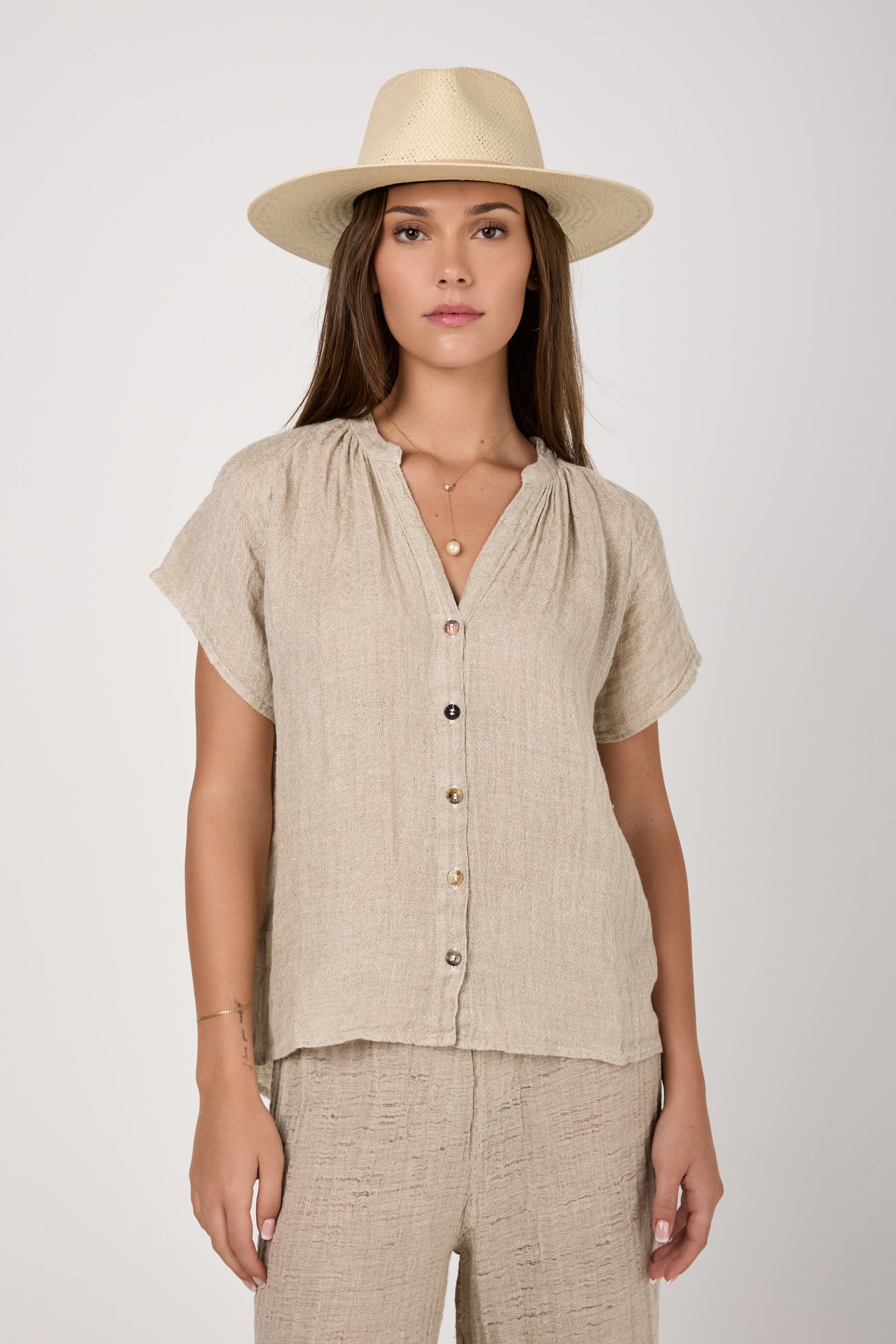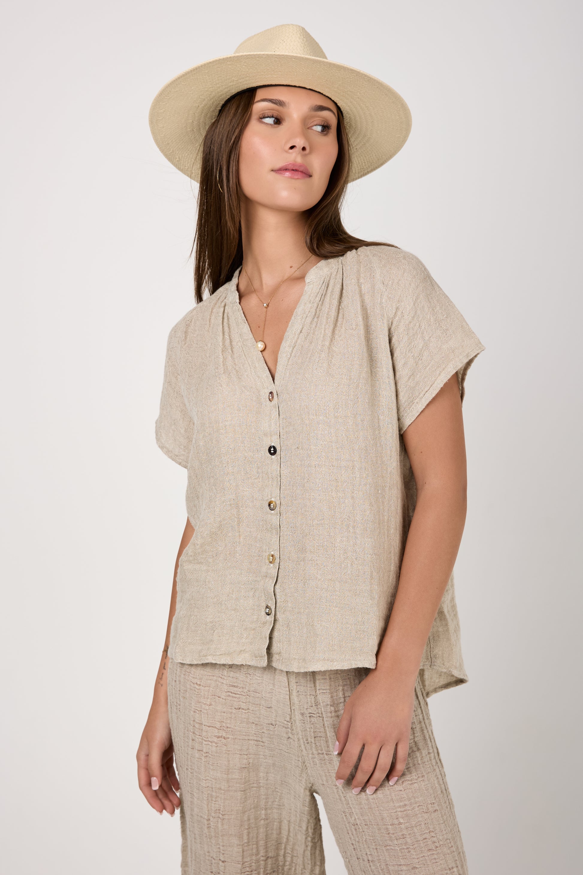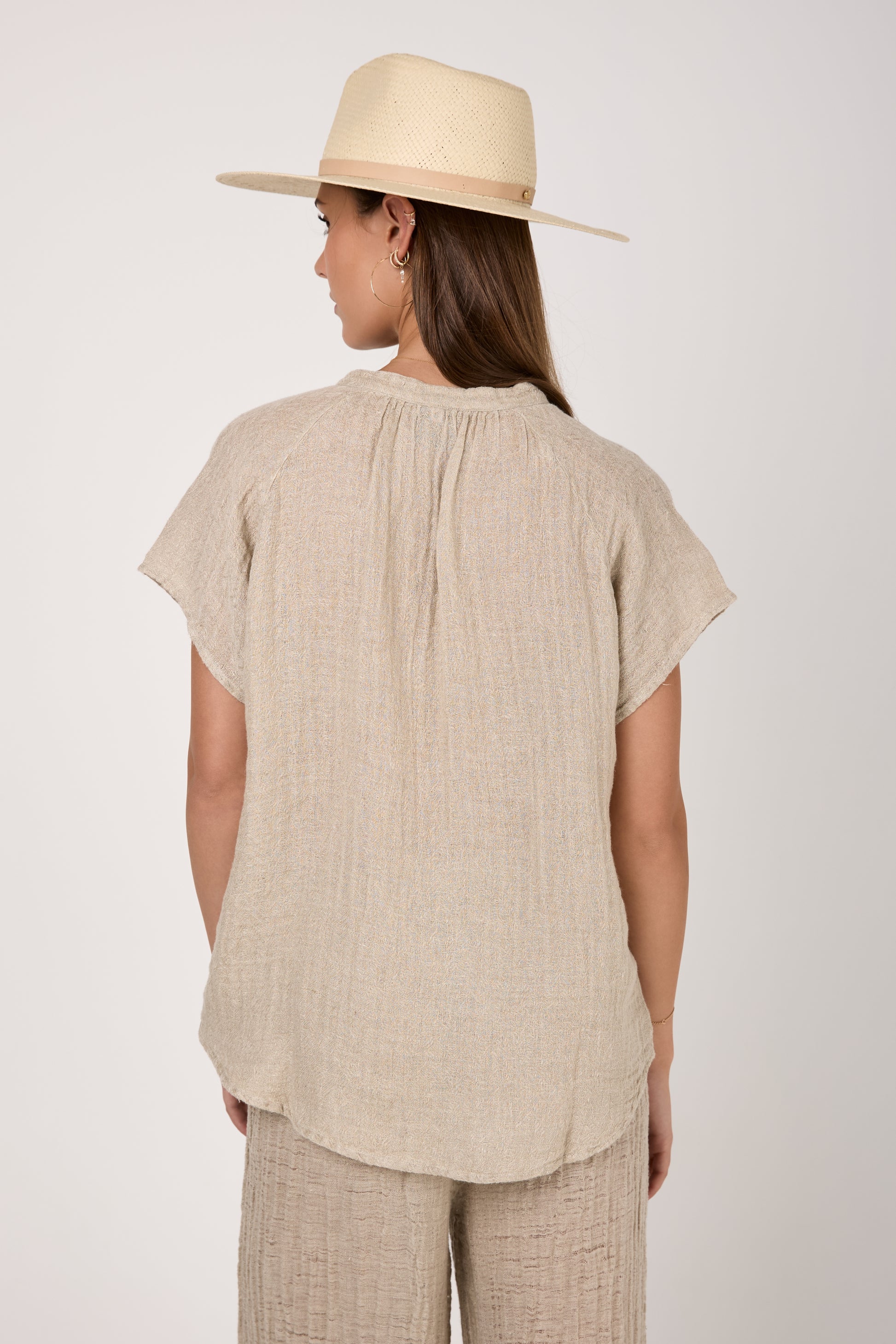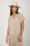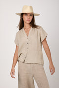BOTTEGA DI BRUNELLA Camicia Primavera Increspato. Linen Shirt in Naturale. Timeless button-down shirt design featuring short raglan sleeves, a V neckline, mother of pearl buttons, and a slightly longer shirttail hem at the back. Crafted with lightweight and breathable linen fabric with a subtle crinkled effect for a nonchalantly casual look.