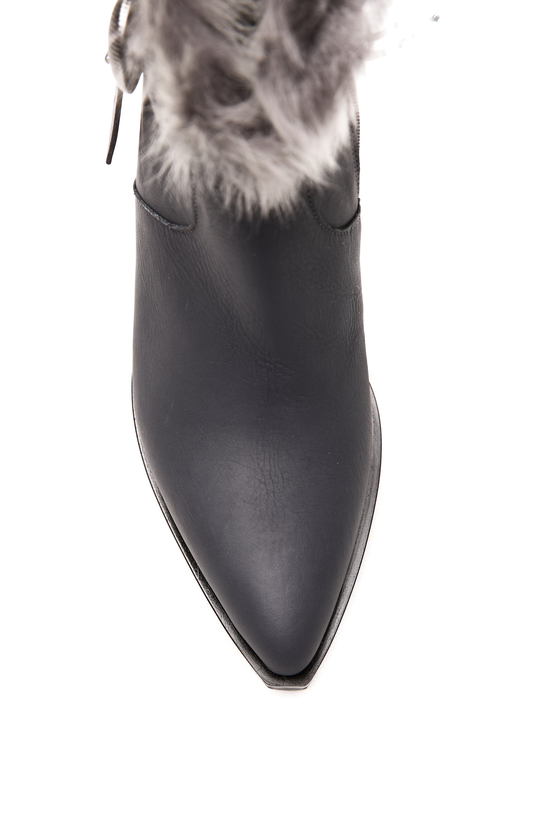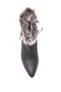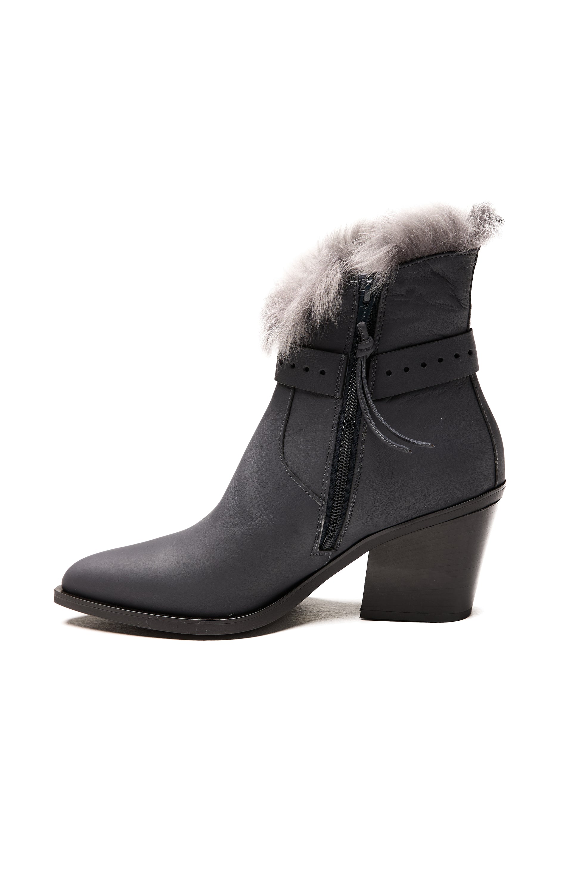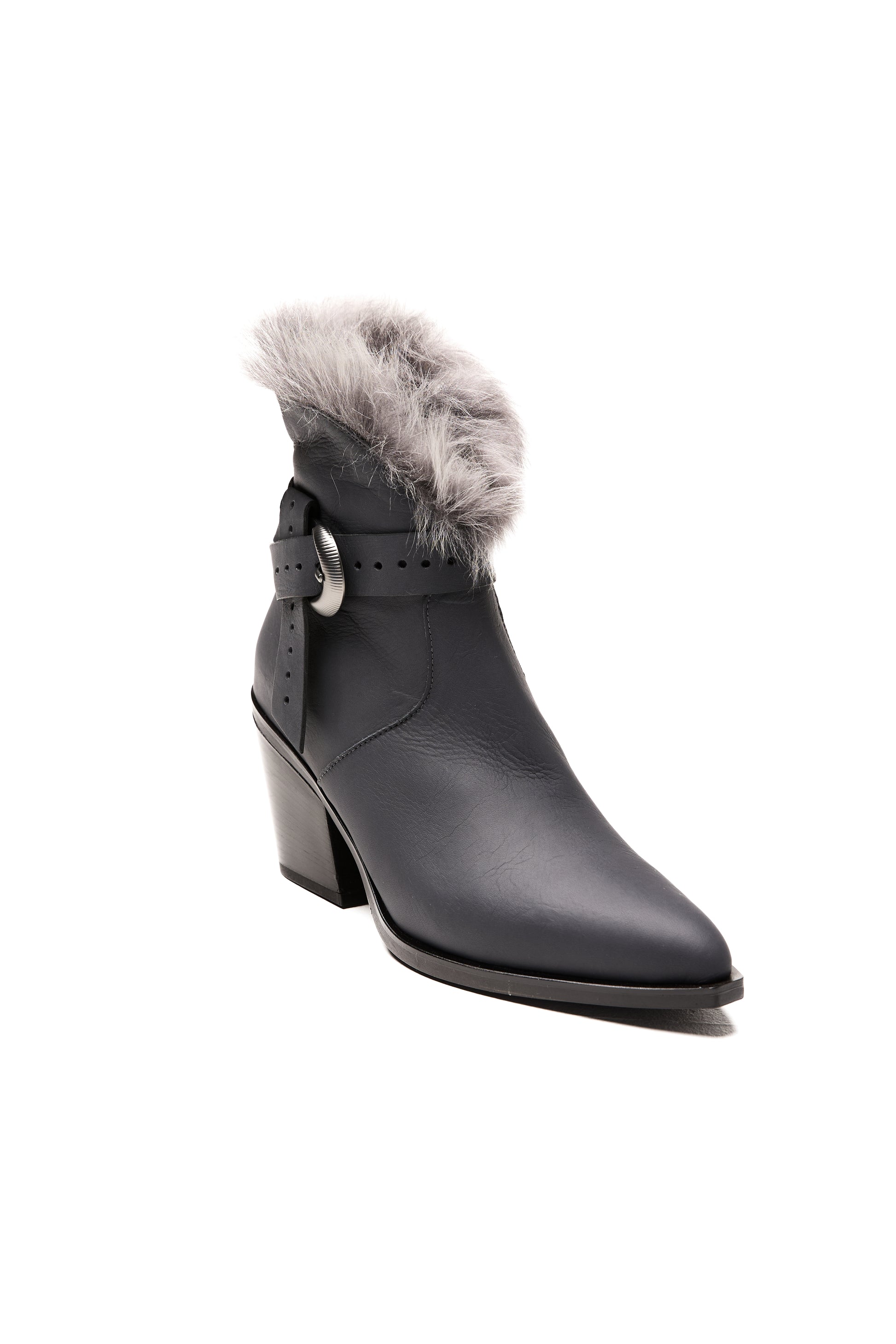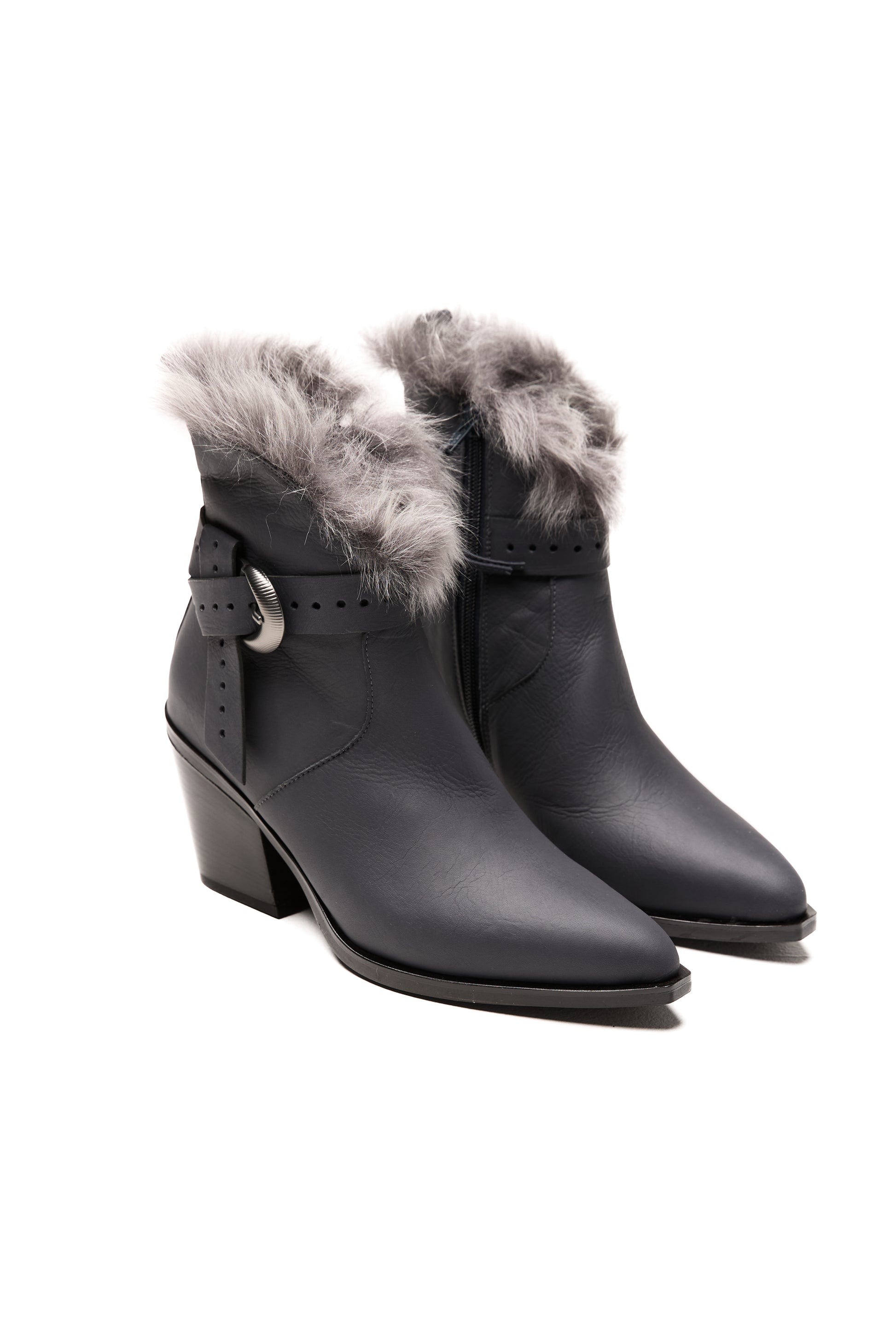 The HENRY BEGUELIN Norton Toscana Leather Ankle Boot in Notte and Brisa Antracite is handcrafted in Italy from supple leather in rich tones of notte and brisa antracite. This Texan-inspired silhouette features a refined side zipper for effortless wear and a decorative leather strap with a statement buckle for a touch of modern edge. A plush Toscana fur trim crowns the design, adding warmth and luxurious texture.