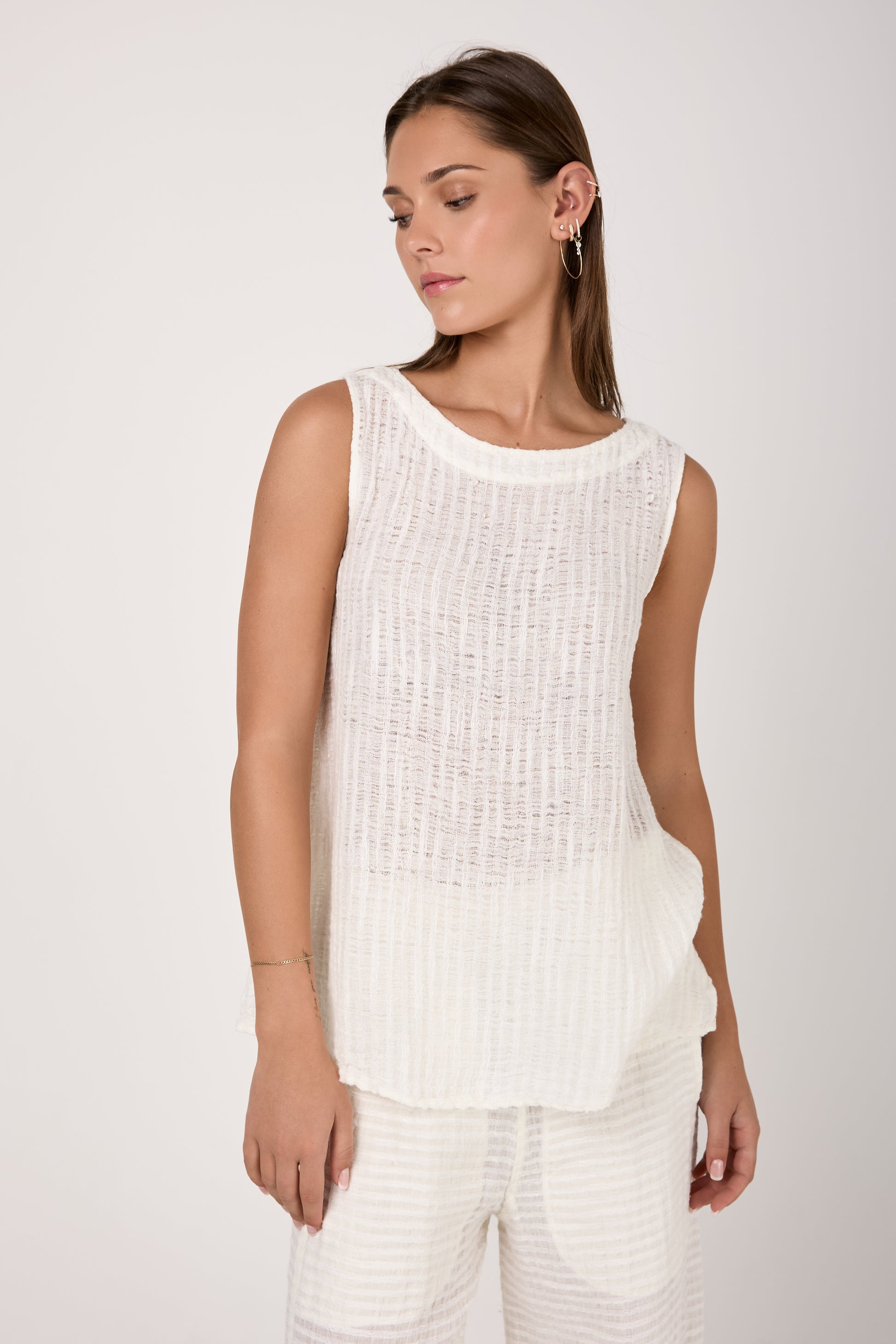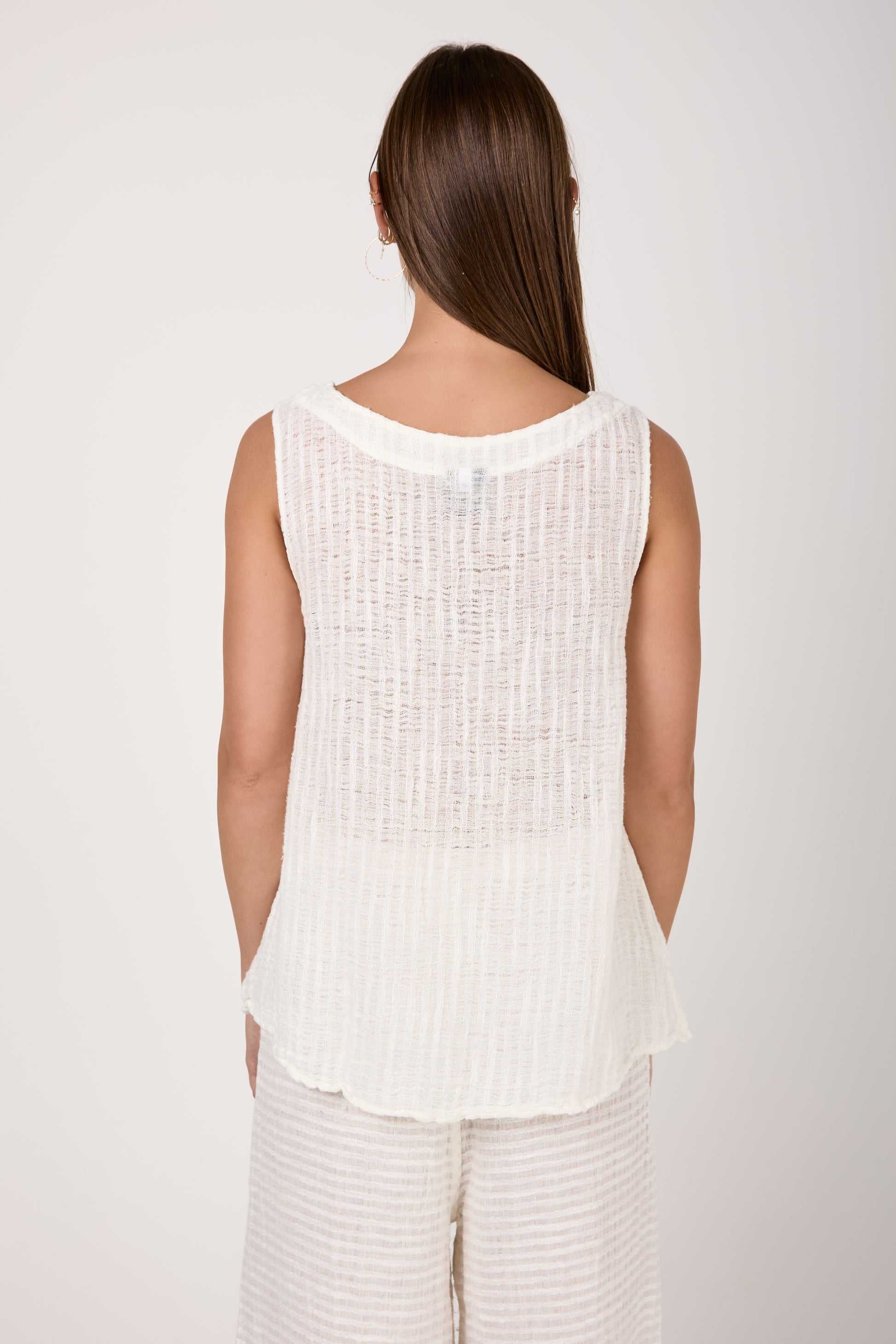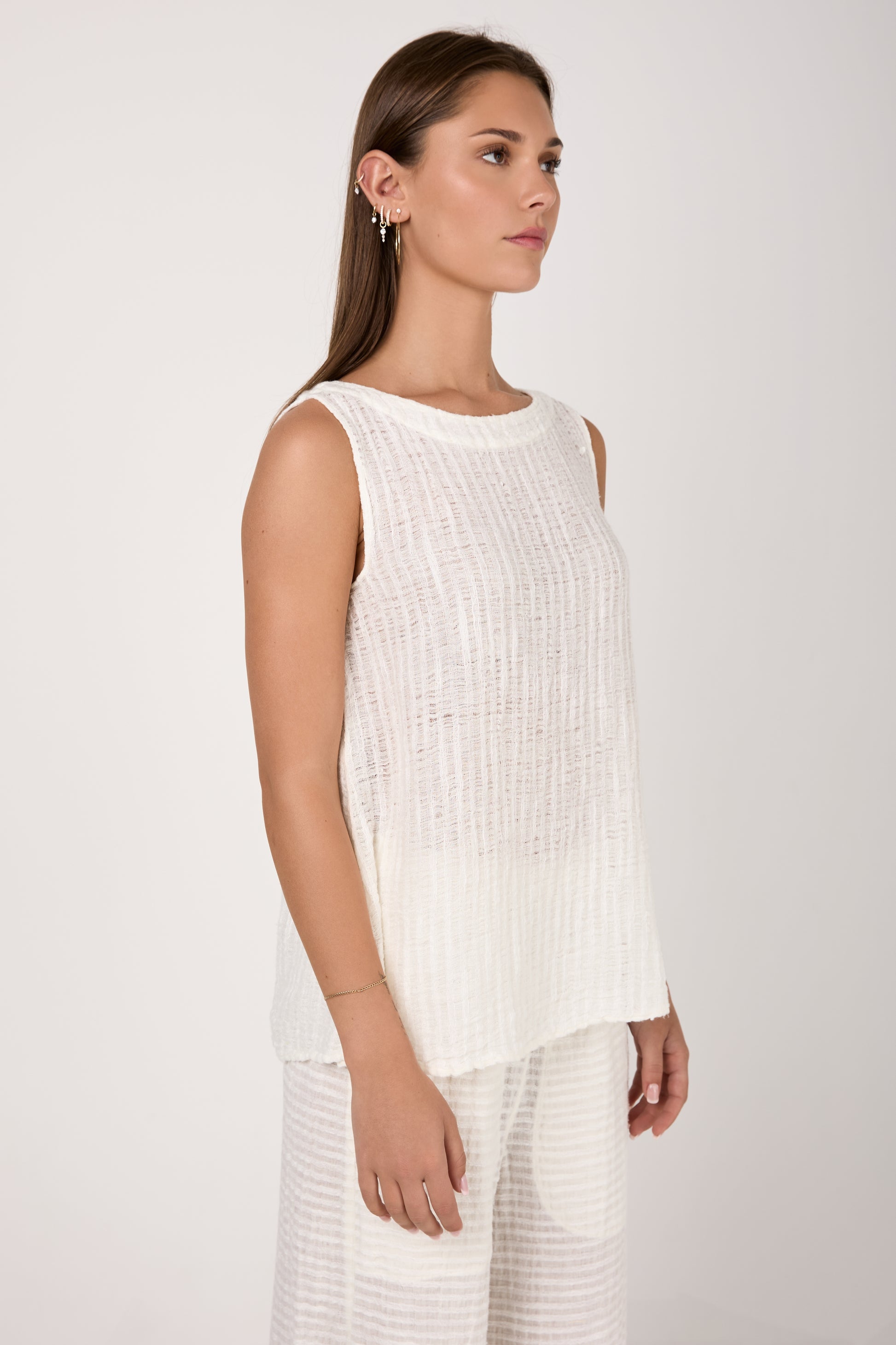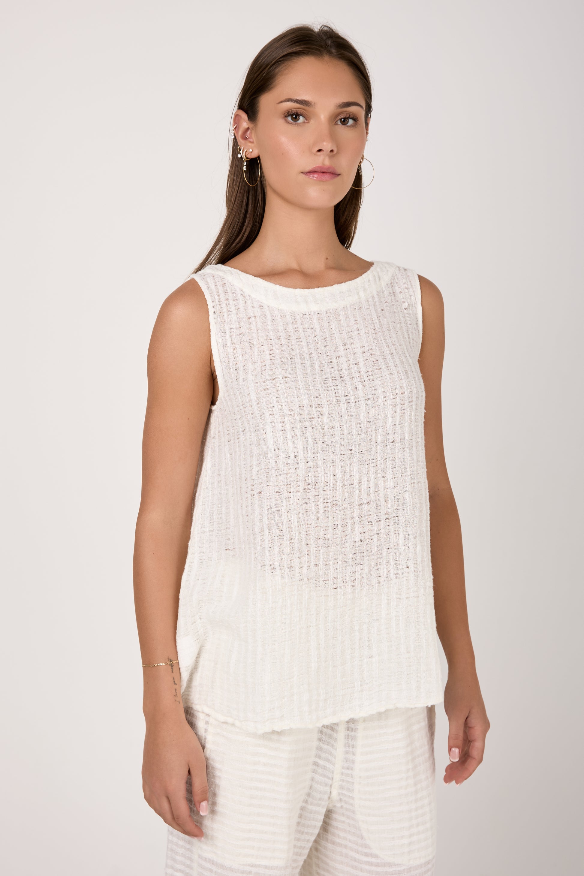 BOTTEGA DI BRUNELLA Canotta Cenacolo Garza Uffizi Linen Tank Top in Latte. Effortless design crafted from lightweight biodegradable linen fabric with a soft texture. Featuring a slightly flared, loose-fitting silhouette offering absolute comfort and style.