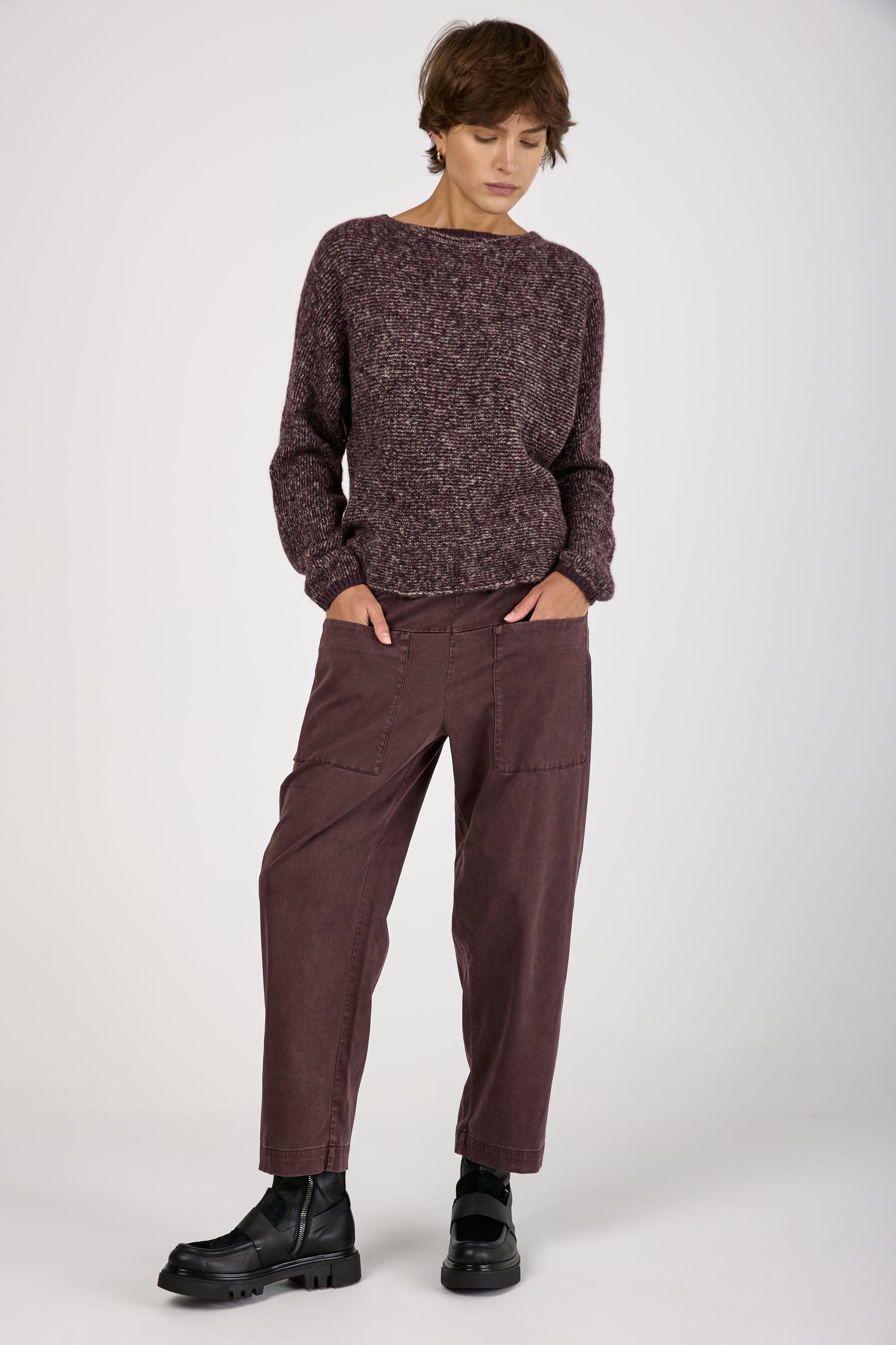 TRANSIT Comfort Viscose Cotton Stretch Trousers in Aubergine. Comfort fit pant in viscose and cotton stretch. These Stretch pants come with an elastic waistband and have a horizontal cut in line with the front pockets. On the back, there are two mock pockets with a flap and button. Made in Italy.