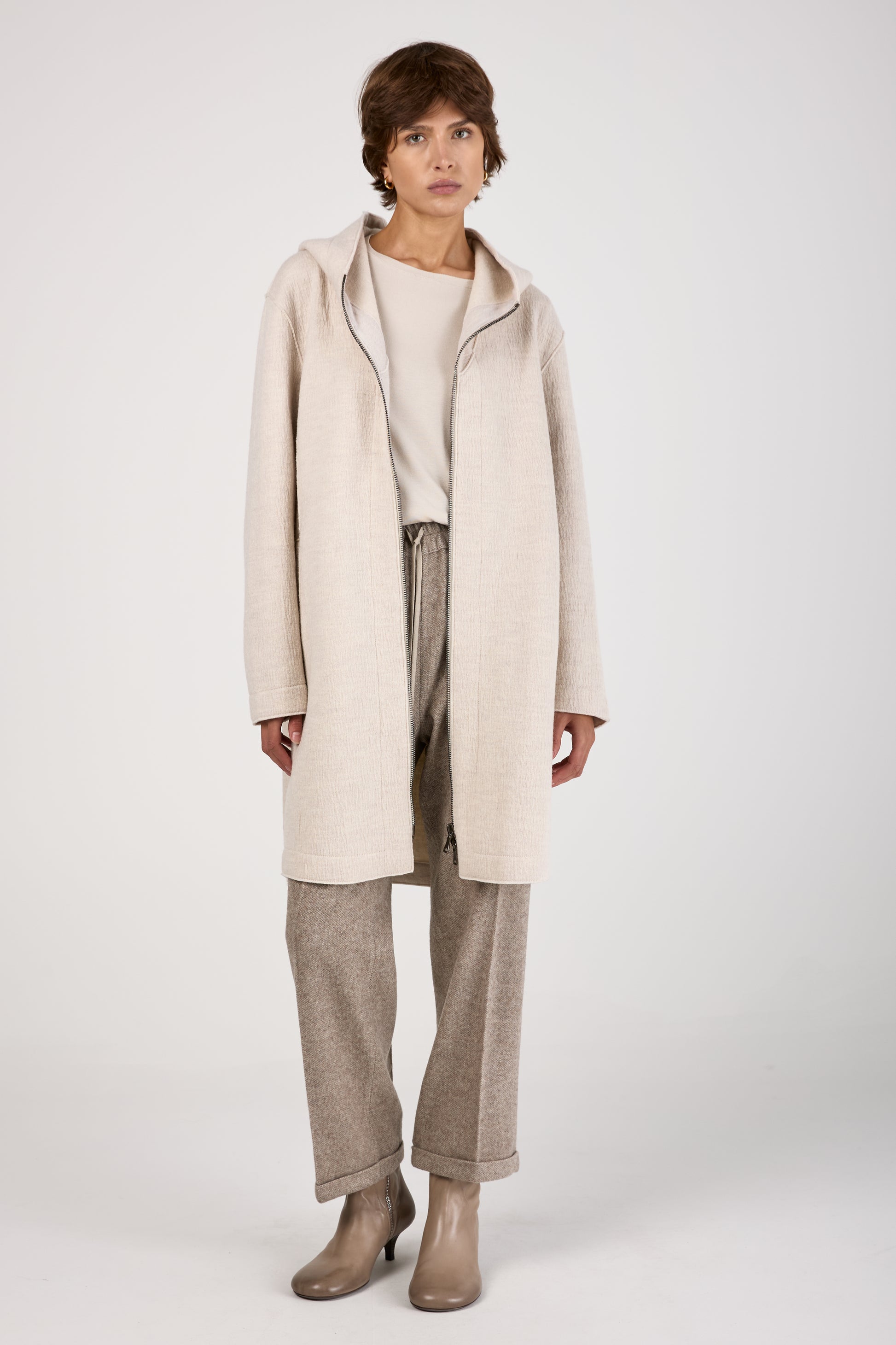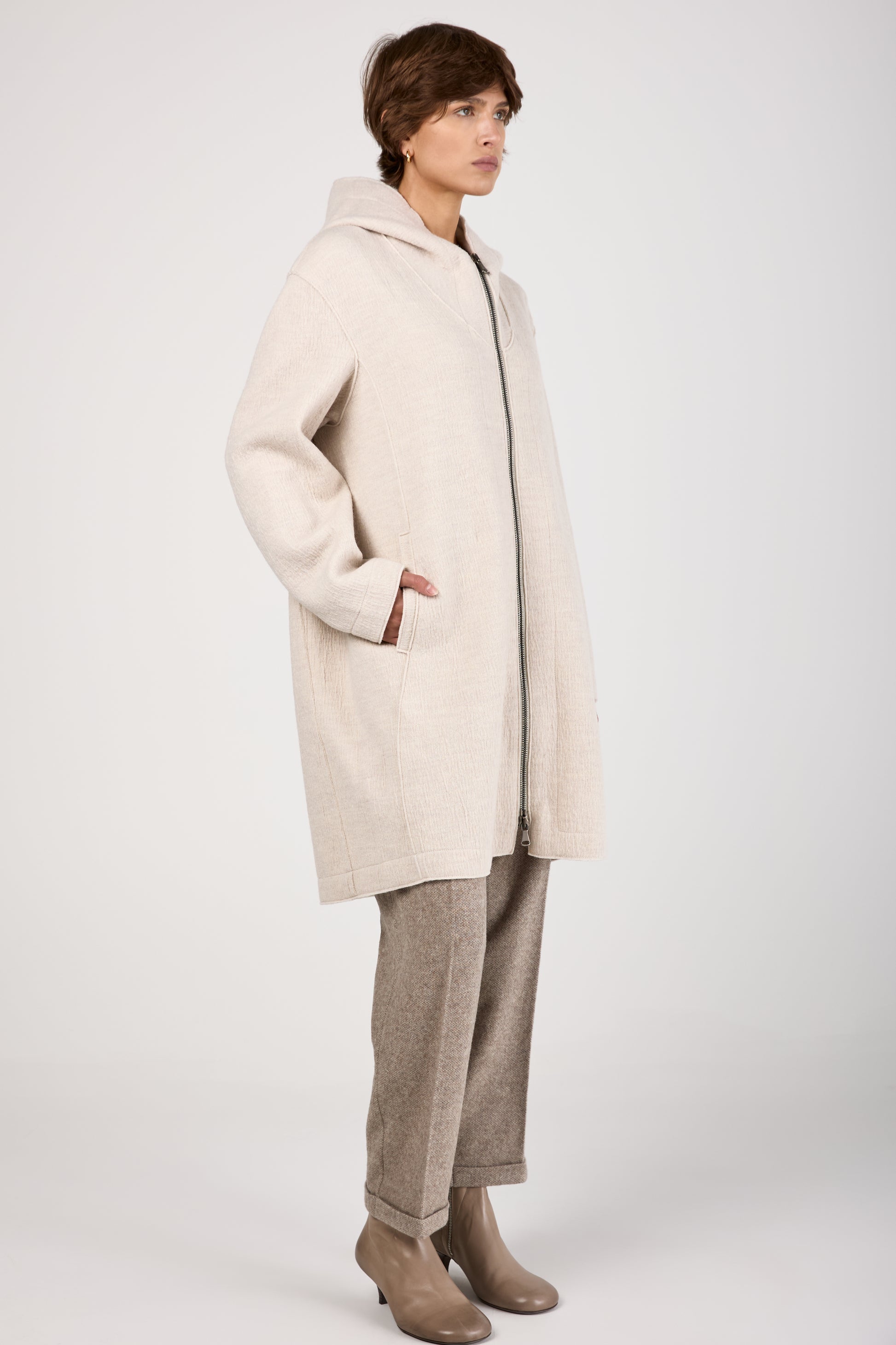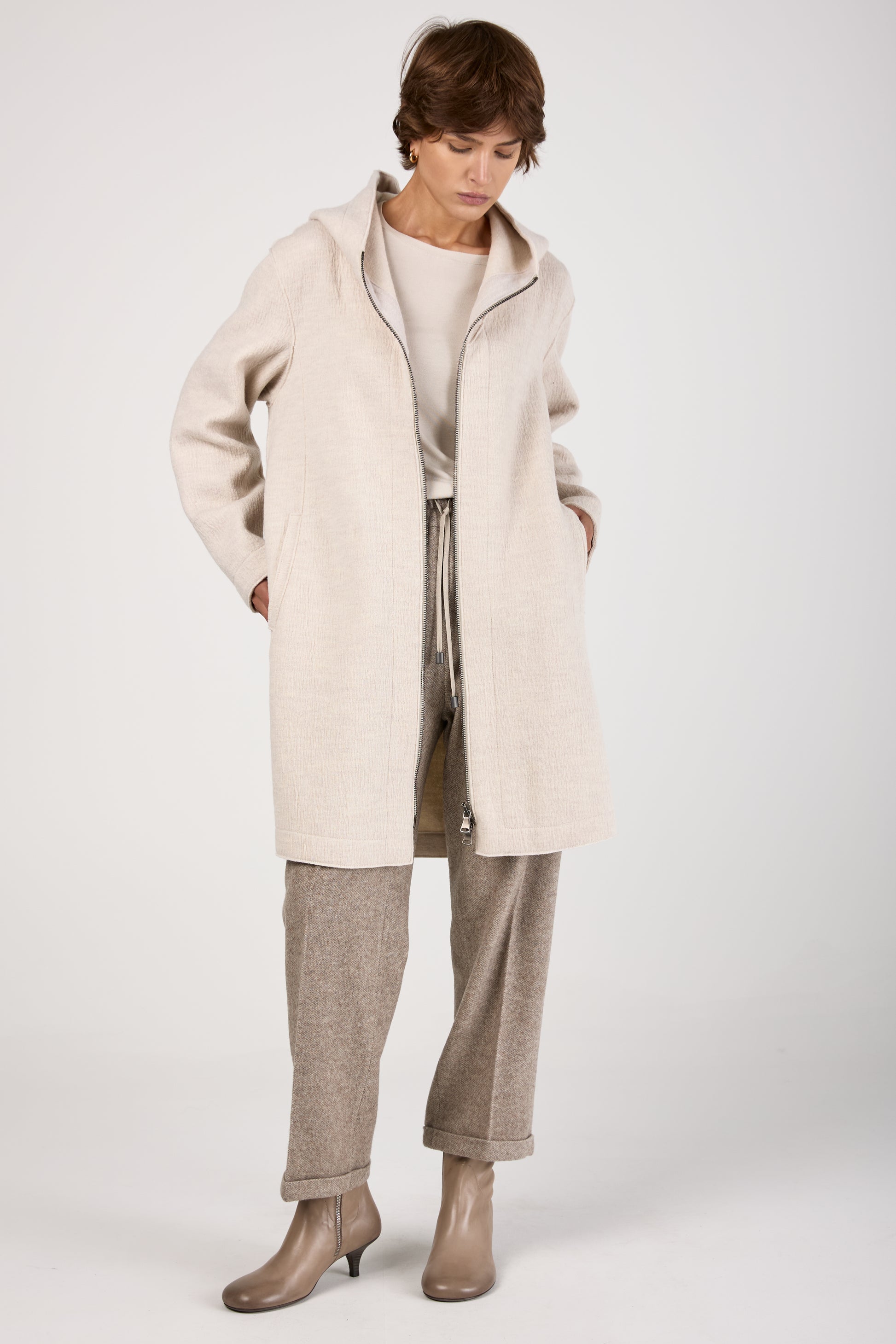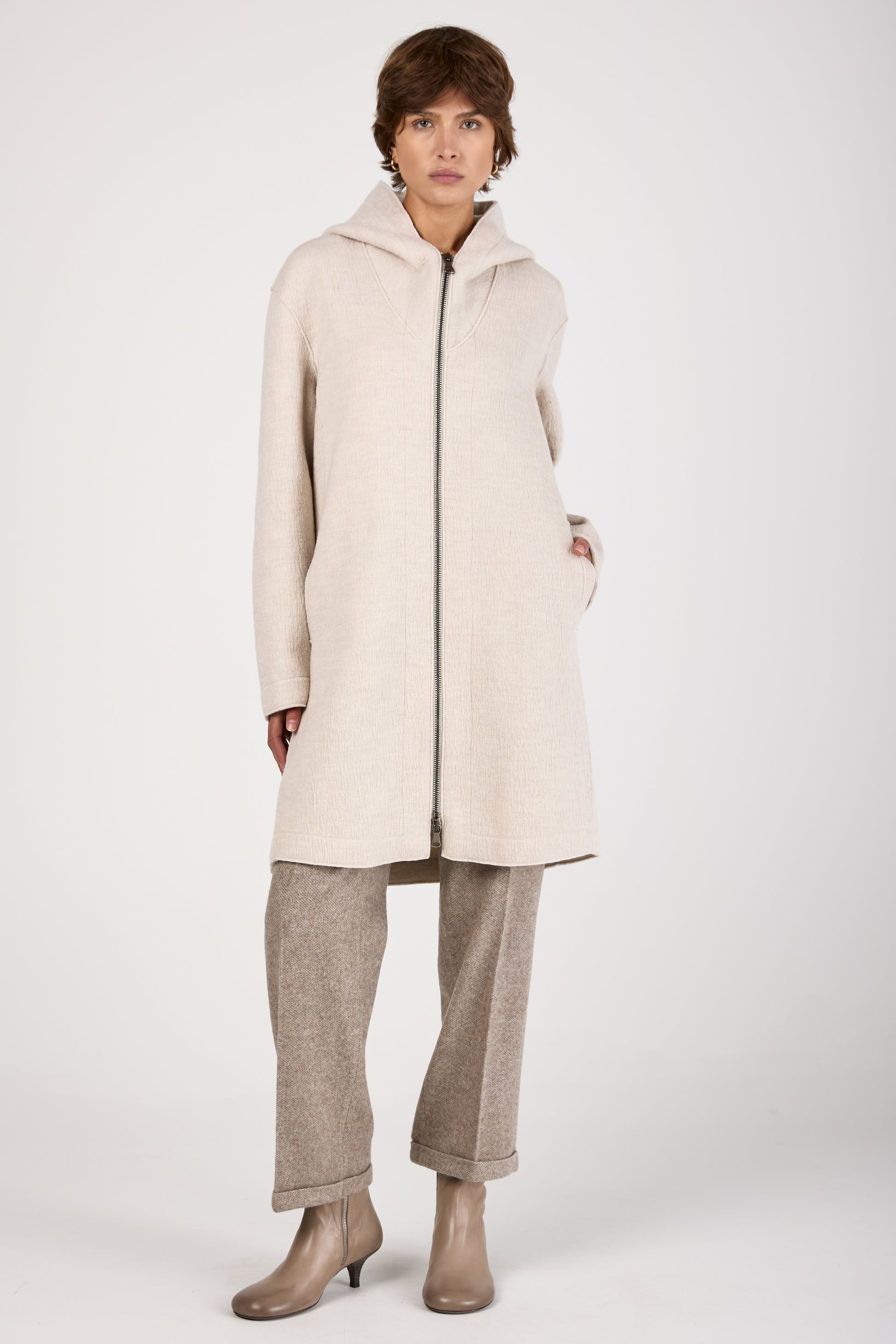 TRANSIT Comfort Hooded Long Wool Jacket in Ice. 100% Virgin wool knee-length jacket with a double-slider zip. With front welt pockets. Made in Italy.