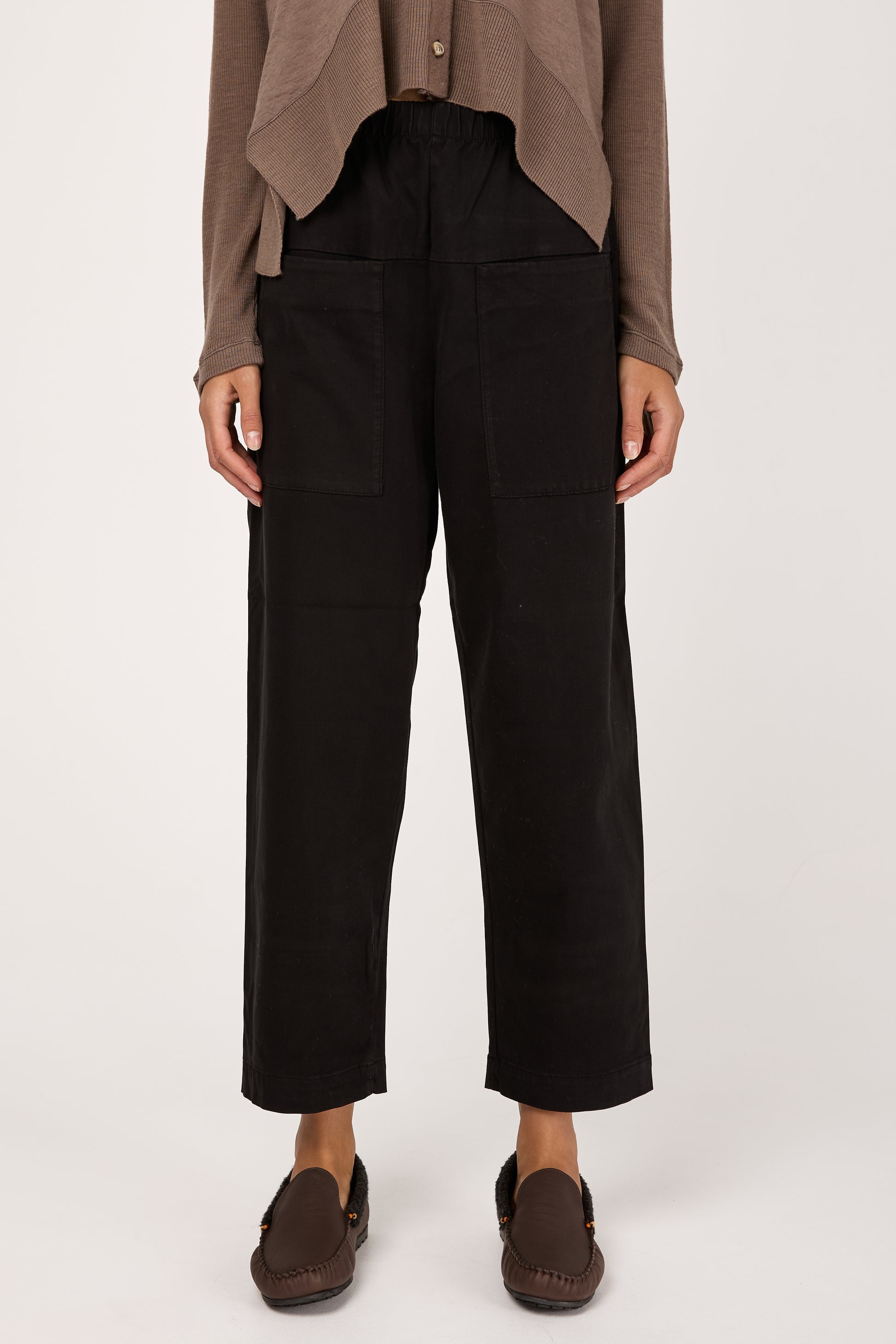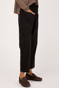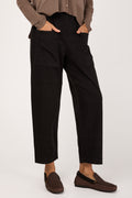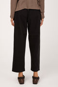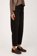 The TRANSIT Comfort Viscose Cotton Stretch Trouser in Black is crafted in Italy from a refined blend of viscose and cotton stretch. Designed for ease and sophistication, it features an elasticated waist for a comfortable, tailored fit. A horizontal cut detail aligns seamlessly with the appliqué front pockets, while the back is finished with a fitted waistband and mock flap pockets with button accents, enhancing the clean, modern silhouette.