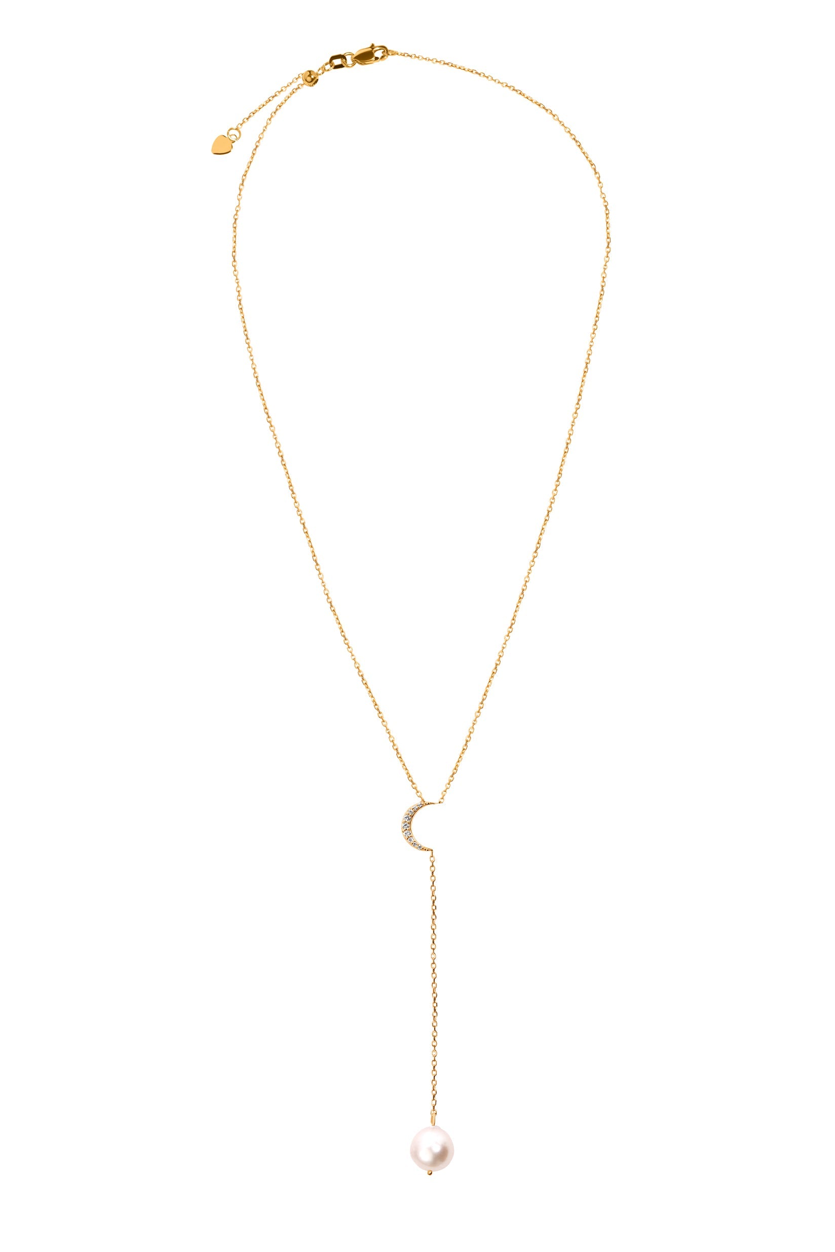 Diamond Crescent Moon Freshwater Pearl Lariat Necklace in 14k Yellow Gold
