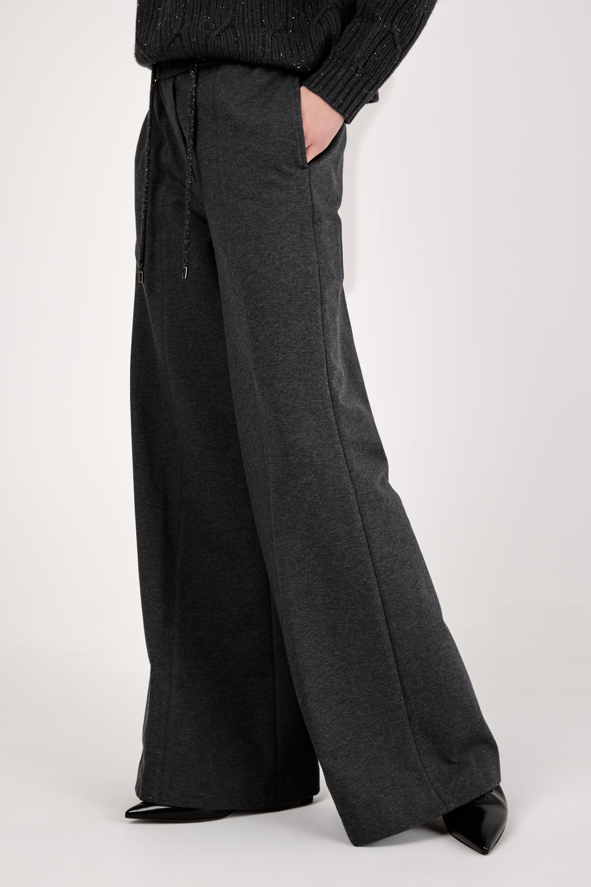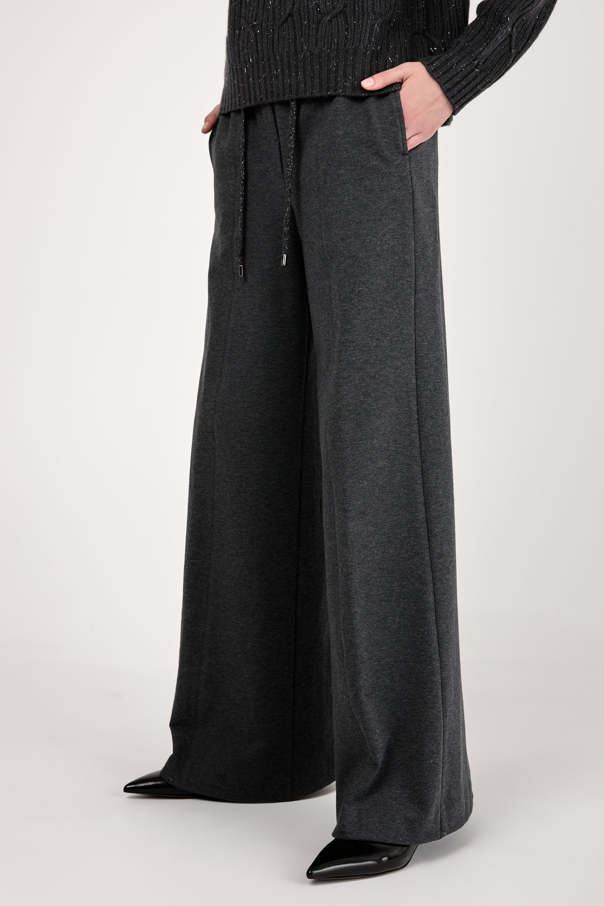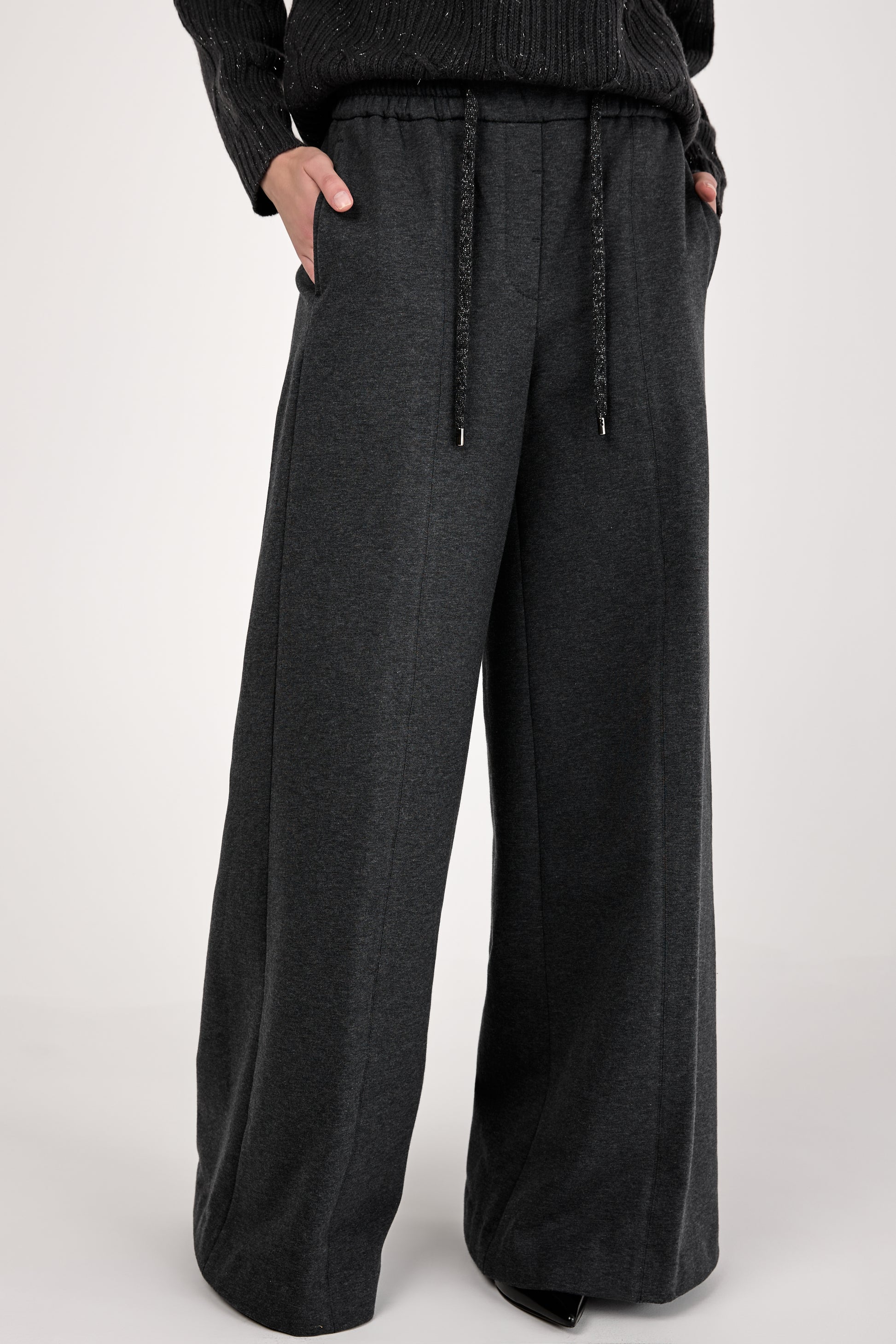 The PESERICO Emery Cotton Stretch Pant in Graphite redefines comfort with a luxurious edge. Made in Italy from soft cotton stretch fleece, these high-waisted trousers feature a wide-leg silhouette and an adjustable drawstring waistband.