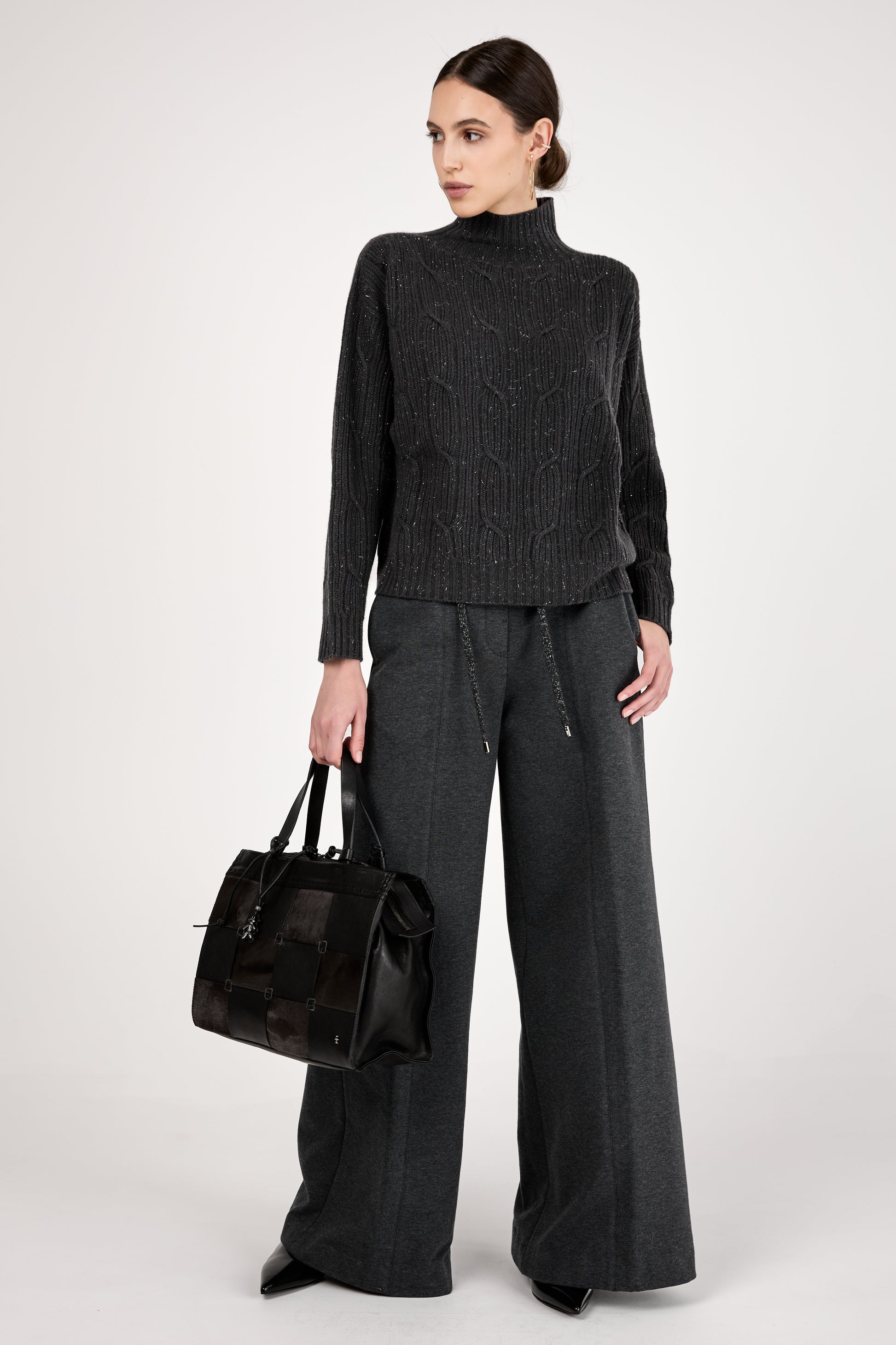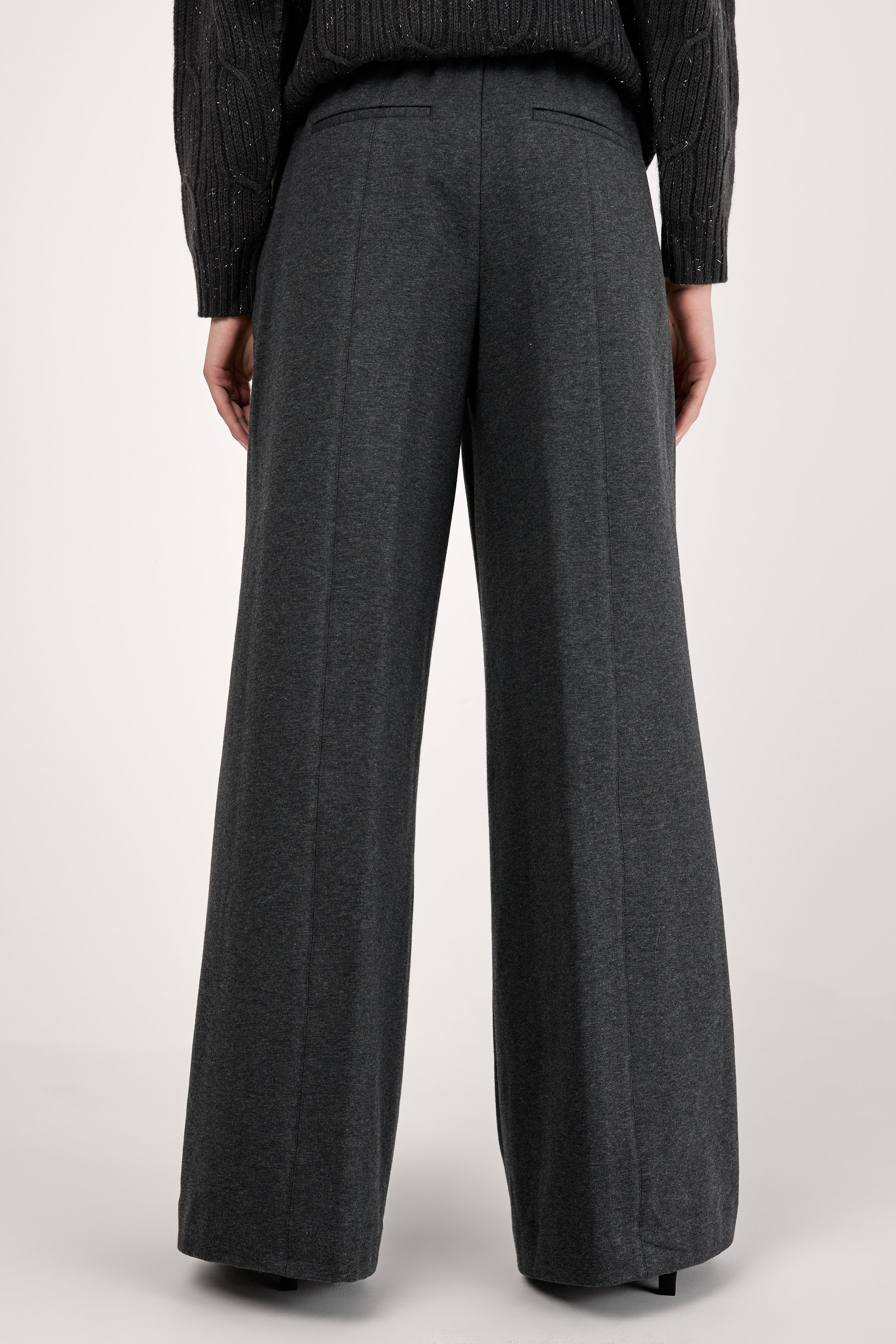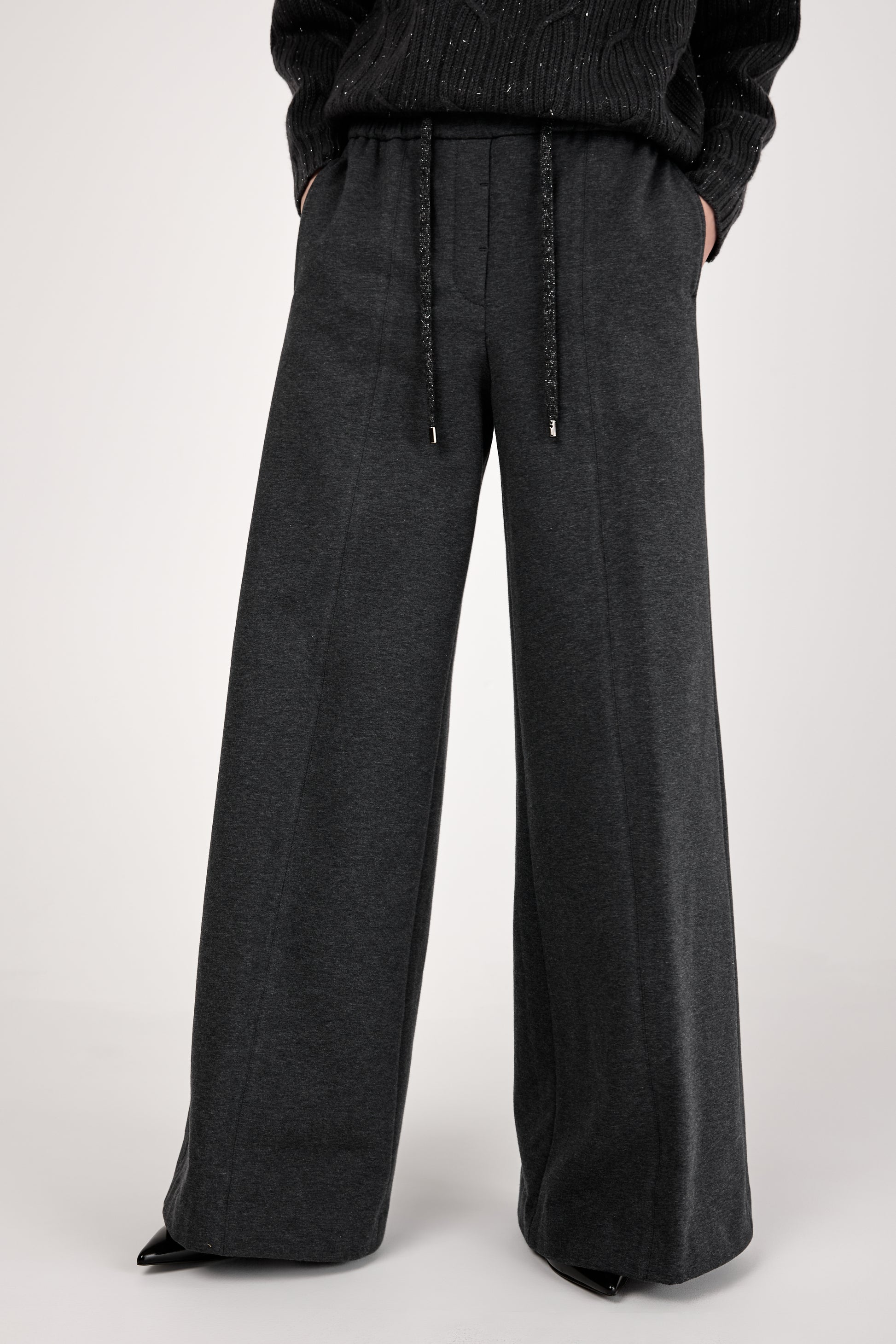 The PESERICO Emery Cotton Stretch Pant in Graphite redefines comfort with a luxurious edge. Made in Italy from soft cotton stretch fleece, these high-waisted trousers feature a wide-leg silhouette and an adjustable drawstring waistband.