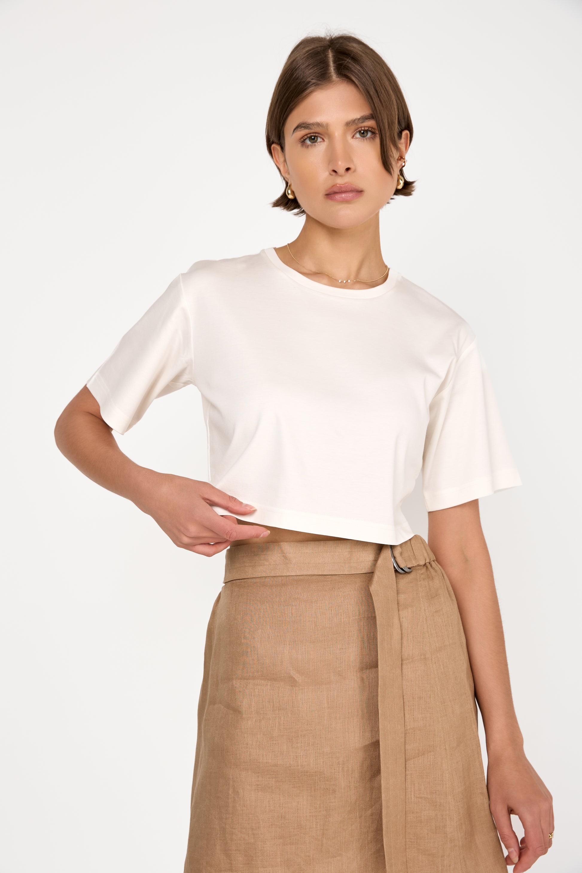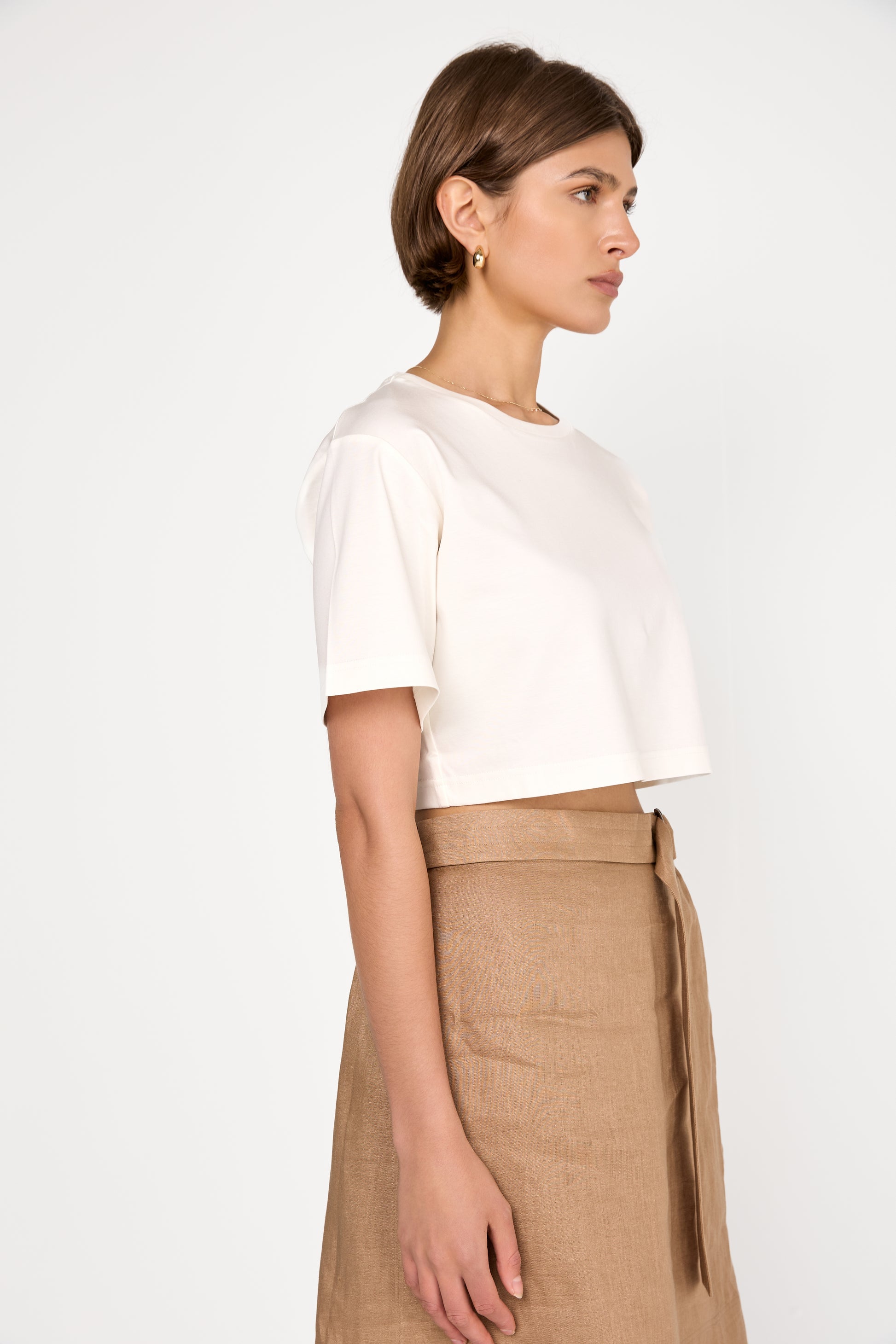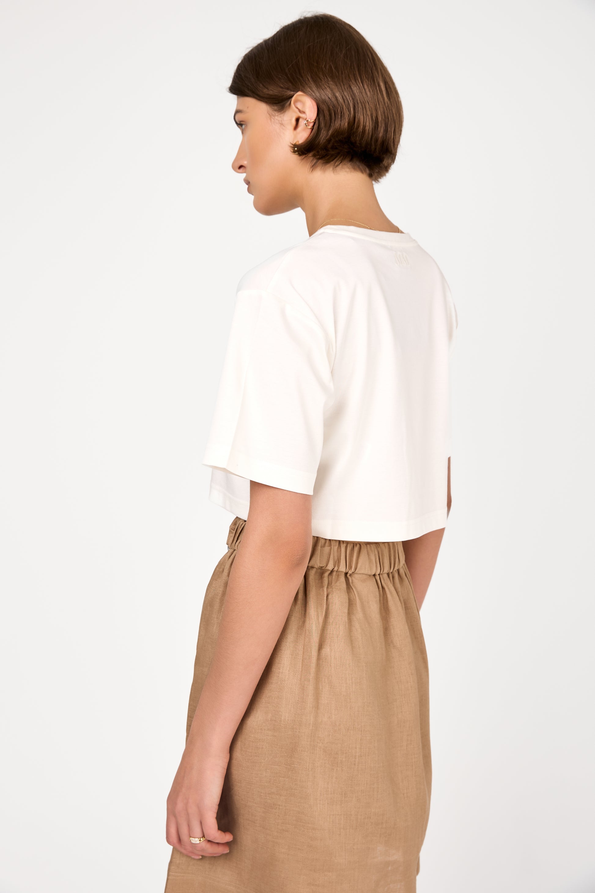 The MAX MARA Khat Cropped Top in White is made from a high-quality jersey interlock blend of modal and cotton, offering exceptional softness and breathability. It features a classic round neckline, short sleeves, and a relaxed fit that falls elegantly on the body.