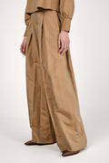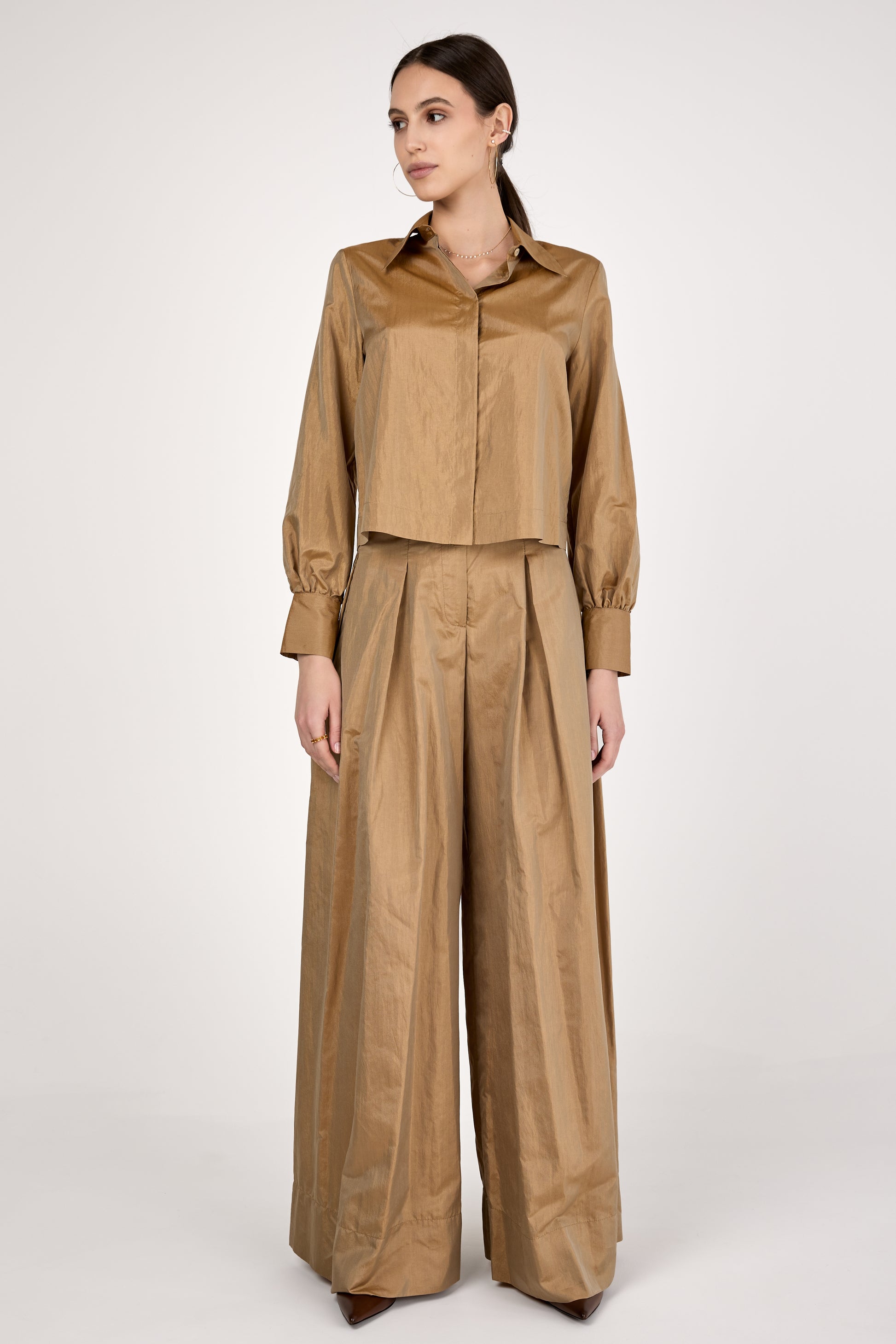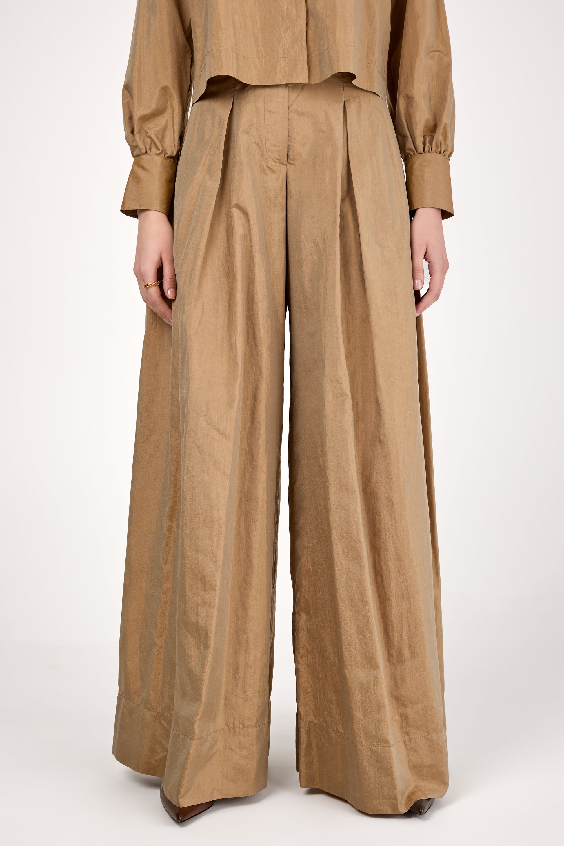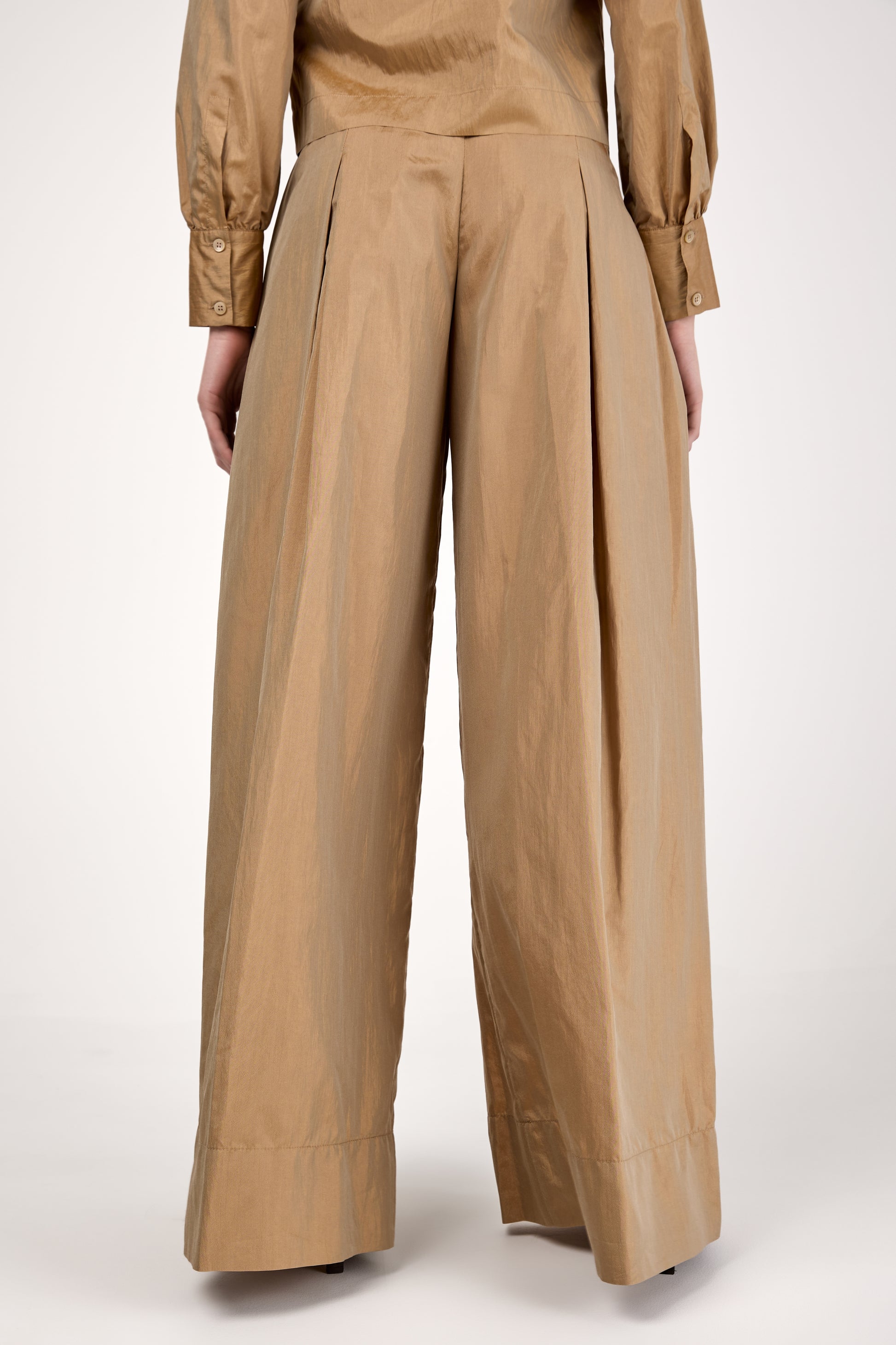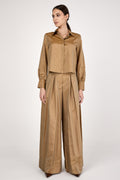 The PESERICO Wide Leg Trouser in Camel crafted from a lightweight iridescent silk blend, reflect elegance and sophistication. The wide leg design, with front, back, and side pleats, creates a graceful, flowing silhouette. Practical details like in-seam side pockets and back welt pockets blend seamlessly into the design, while a Punto Luce trim on the belt loop adds a subtle sparkle. The high-waisted cut flatters the figure and ensures comfort, while the concealed hook and front zip closure provide a polished fit. The silky, iridescent fabric offers a luxuriously soft and comfortable feel.