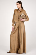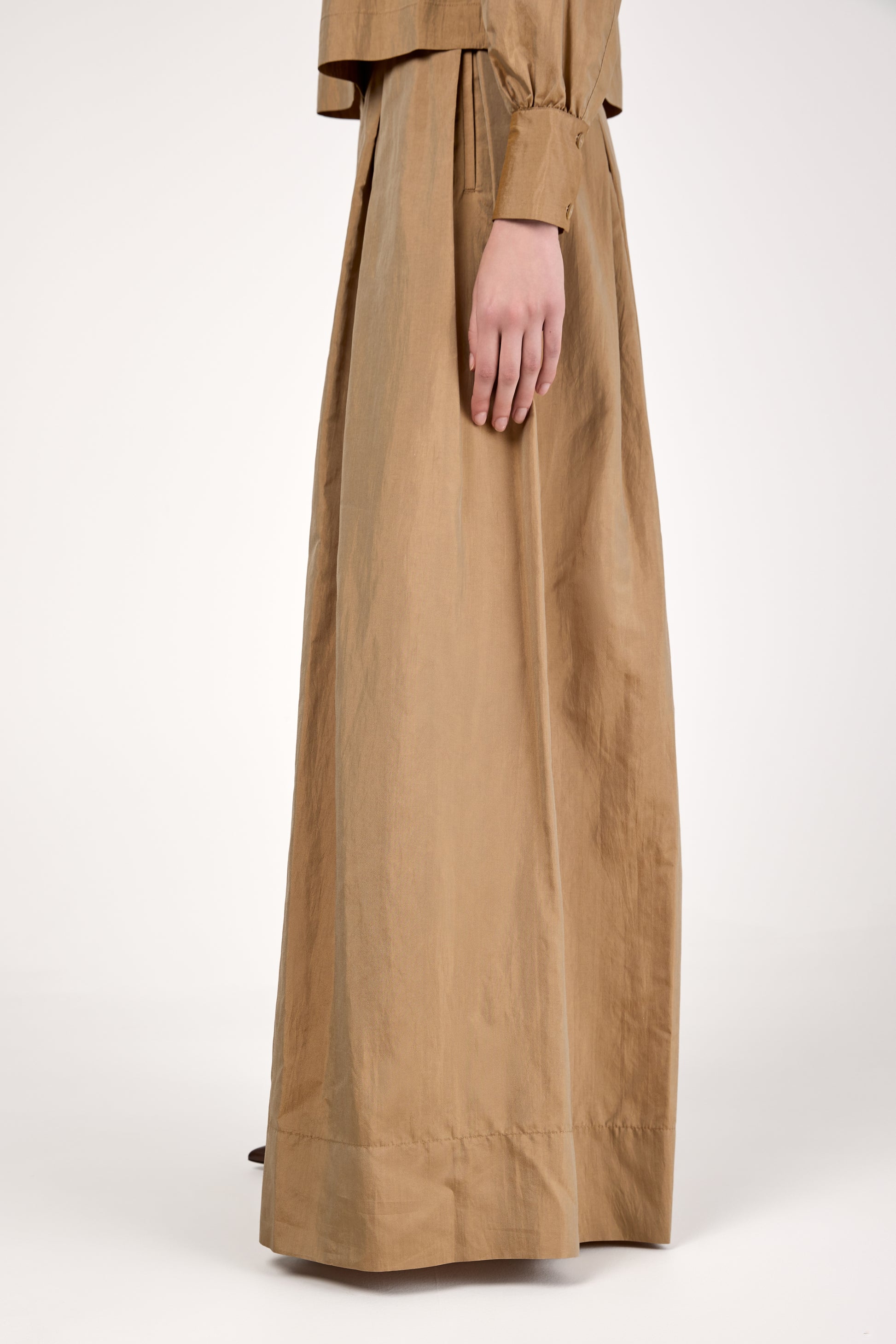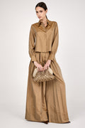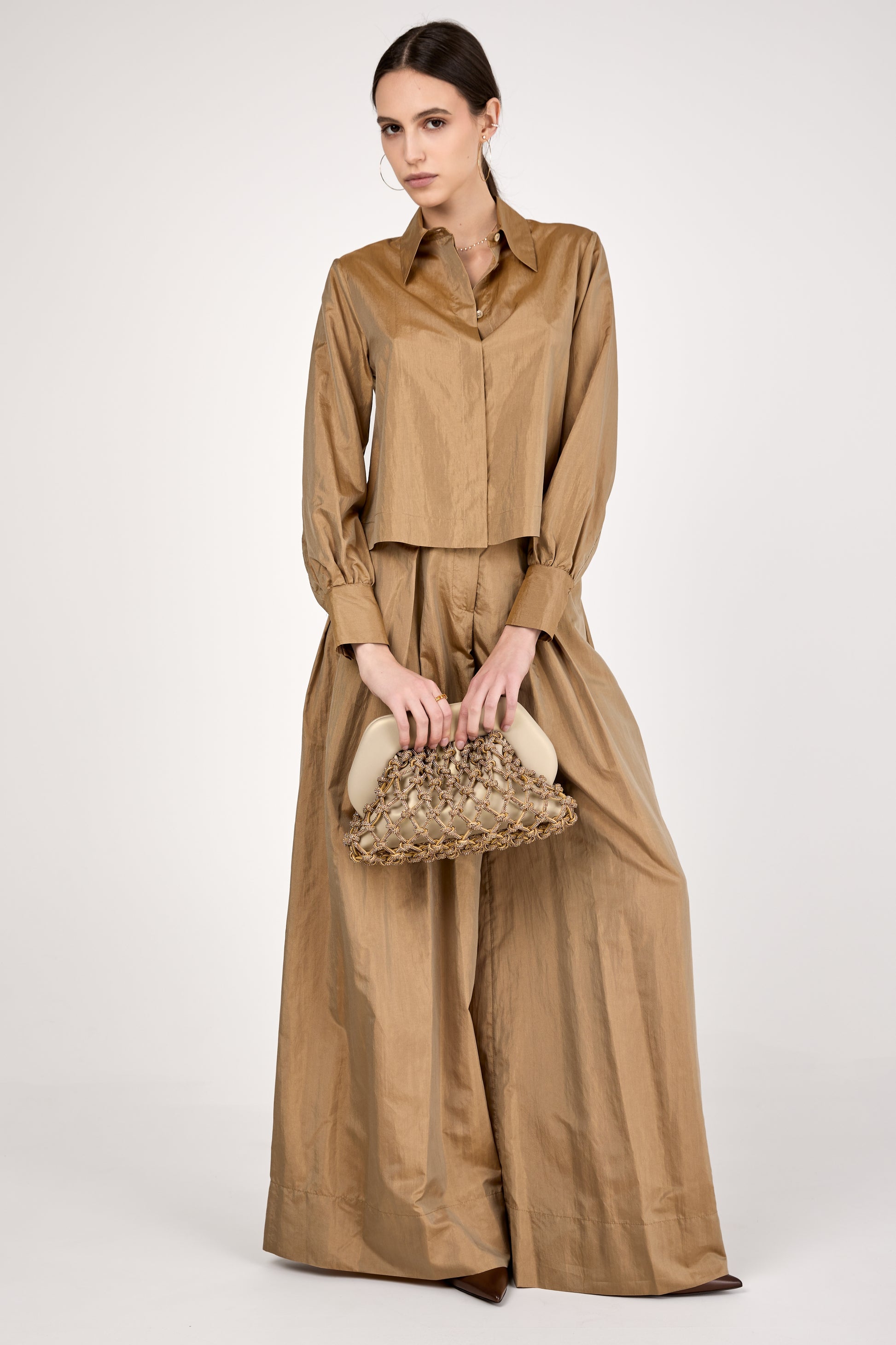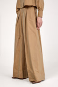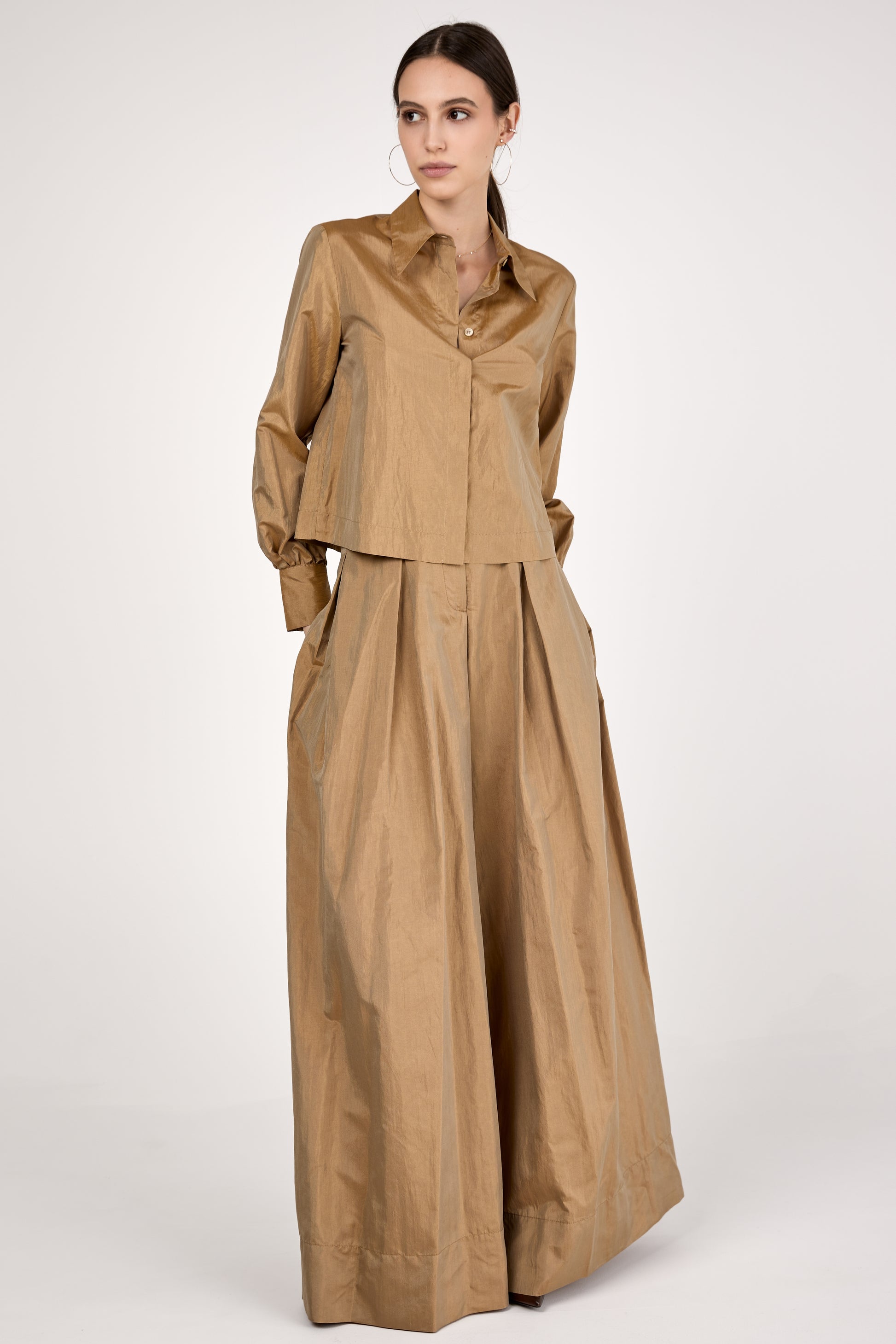 The PESERICO Wide Leg Trouser in Camel crafted from a lightweight iridescent silk blend, reflect elegance and sophistication. The wide leg design, with front, back, and side pleats, creates a graceful, flowing silhouette. Practical details like in-seam side pockets and back welt pockets blend seamlessly into the design, while a Punto Luce trim on the belt loop adds a subtle sparkle. The high-waisted cut flatters the figure and ensures comfort, while the concealed hook and front zip closure provide a polished fit. The silky, iridescent fabric offers a luxuriously soft and comfortable feel.