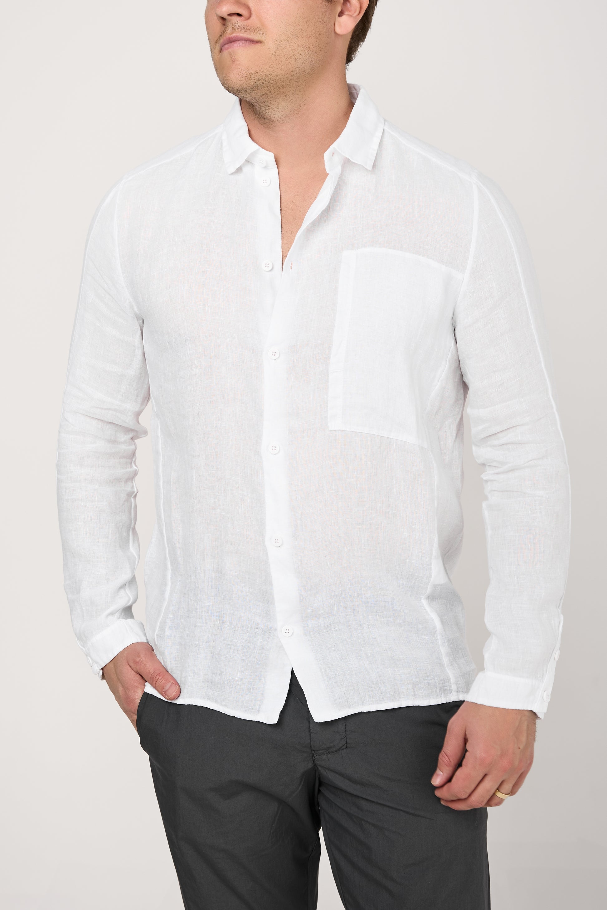 The TRANSIT Linen Shirt in Optical White is tailored in a relaxed fit for elevated everyday wear. Crafted in Italy from linen with delicate cotton etamine inserts, it features a straight point collar, front button fastening, and a single breast pocket. Finished with buttoned sleeve plackets and a garment-dyed treatment, it balances classic structure with modern ease.