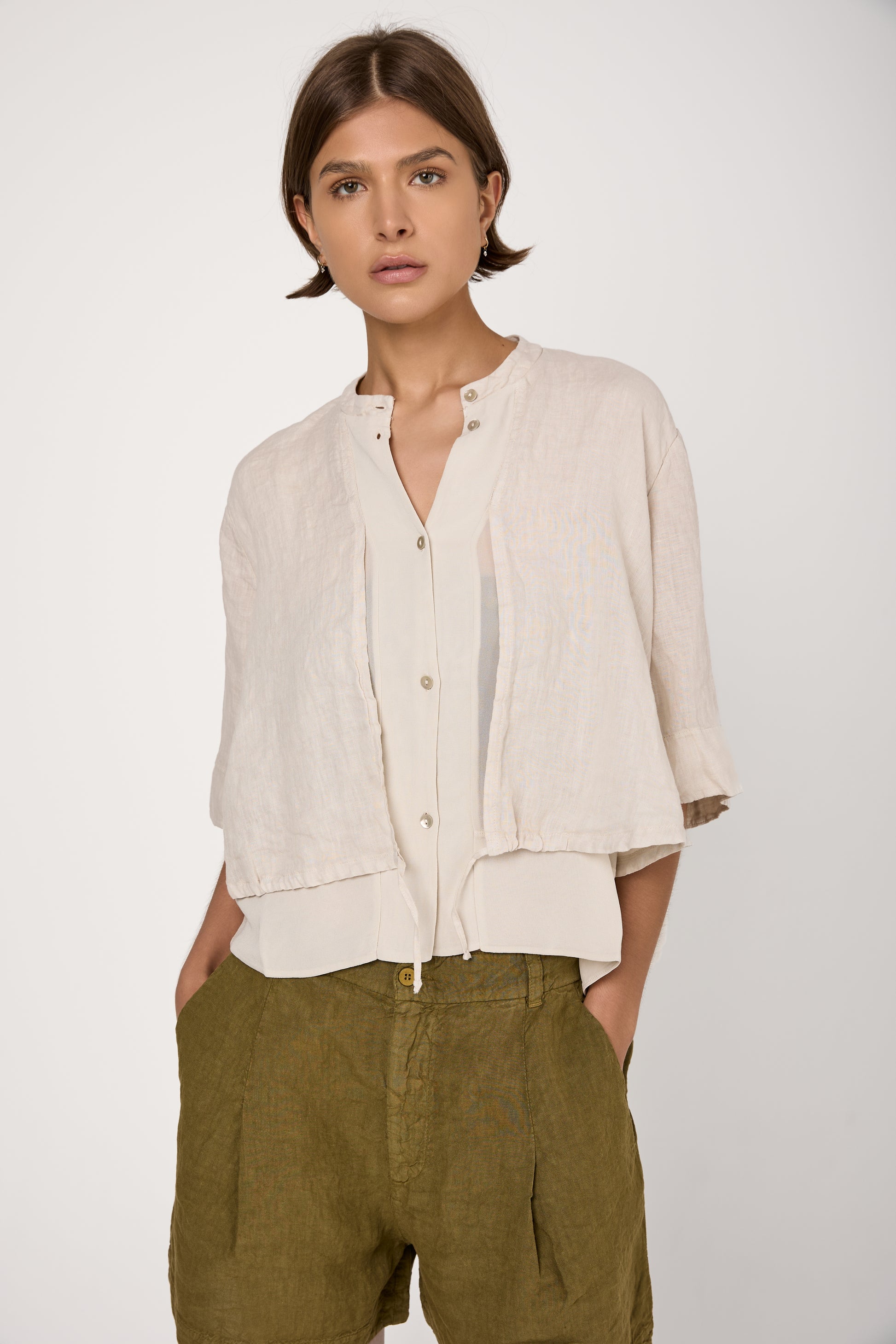 The TRANSIT Linen Viscose Shirt in Sand plays elegantly with layered textures and subtle contrasts. Expertly crafted in Italy, this distinctive piece combines sheer georgette at the front, overlaid with a tailored linen vest, while the back is cut entirely from breathable linen. Finished with a mandarin collar, elbow-length sleeves, and an adjustable linen drawstring, this piece redefines the classic shirt with refined ease.