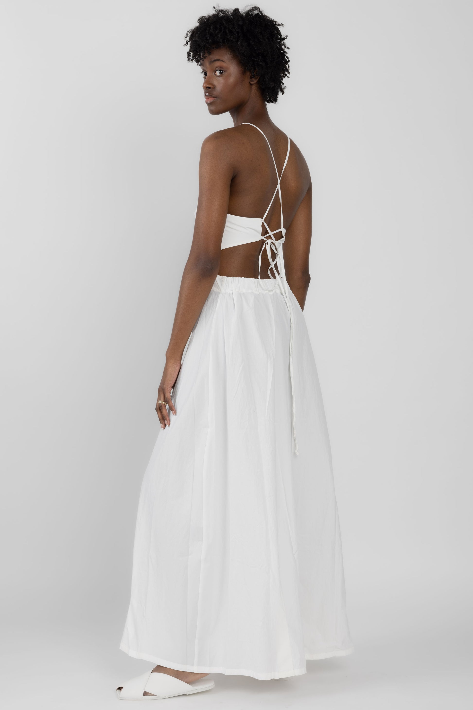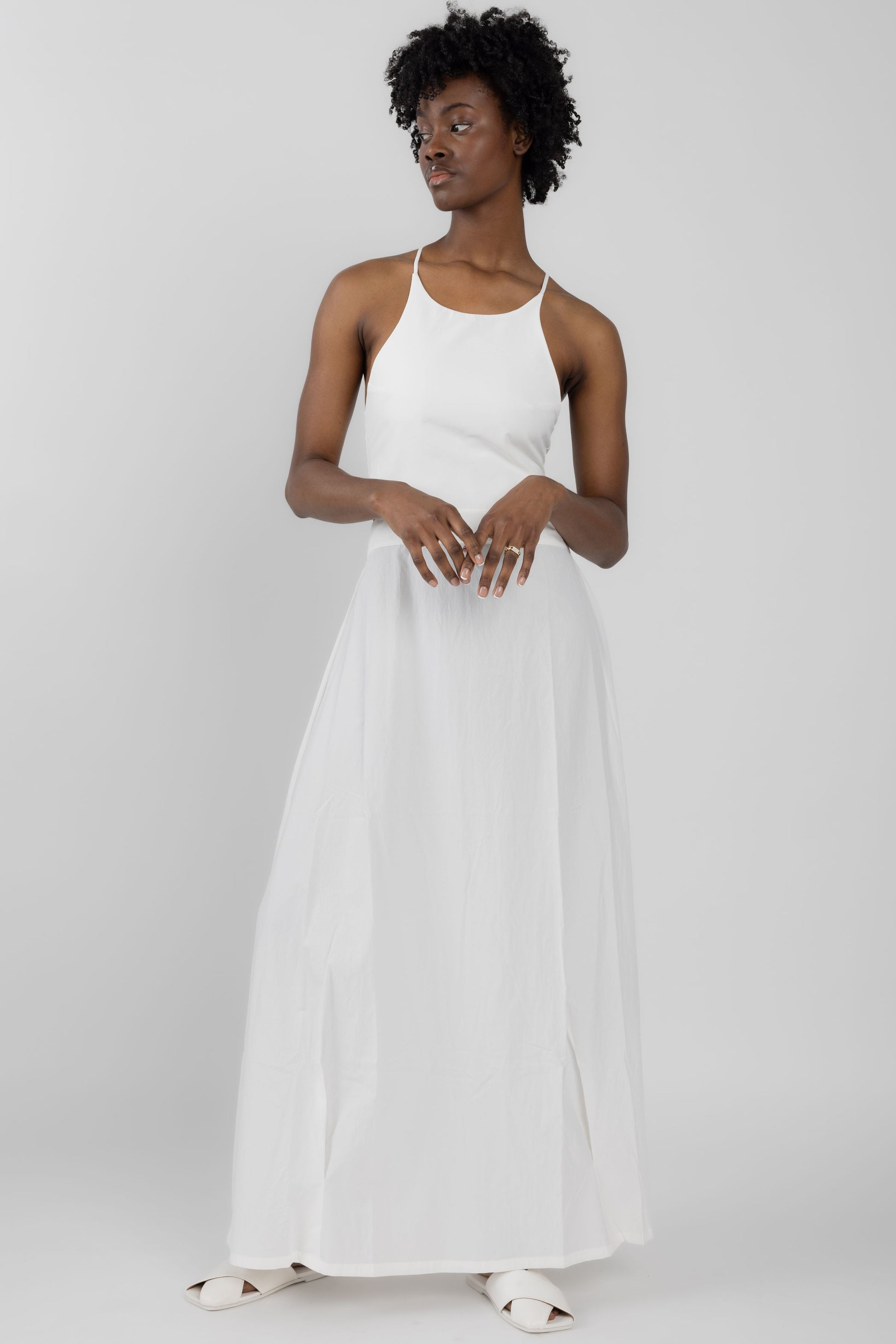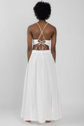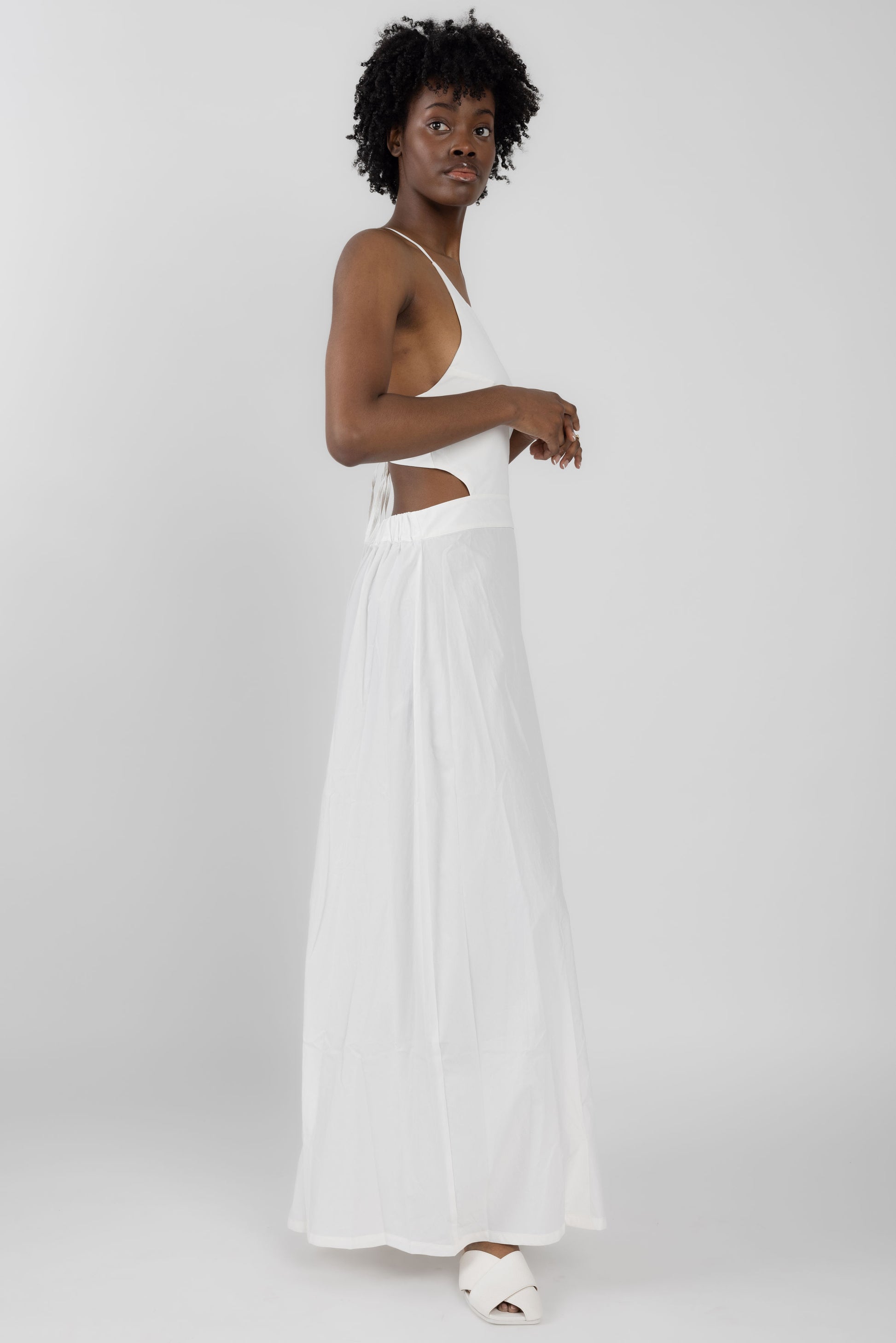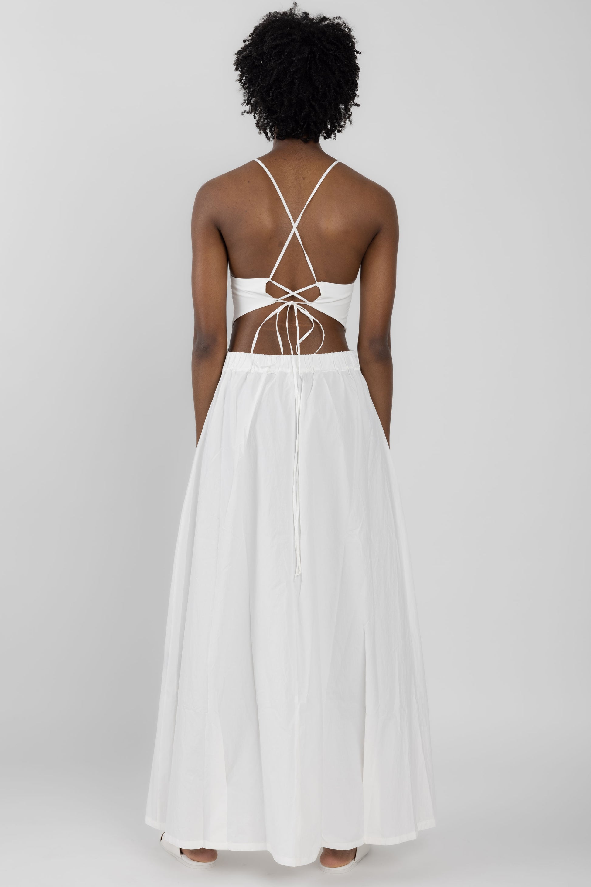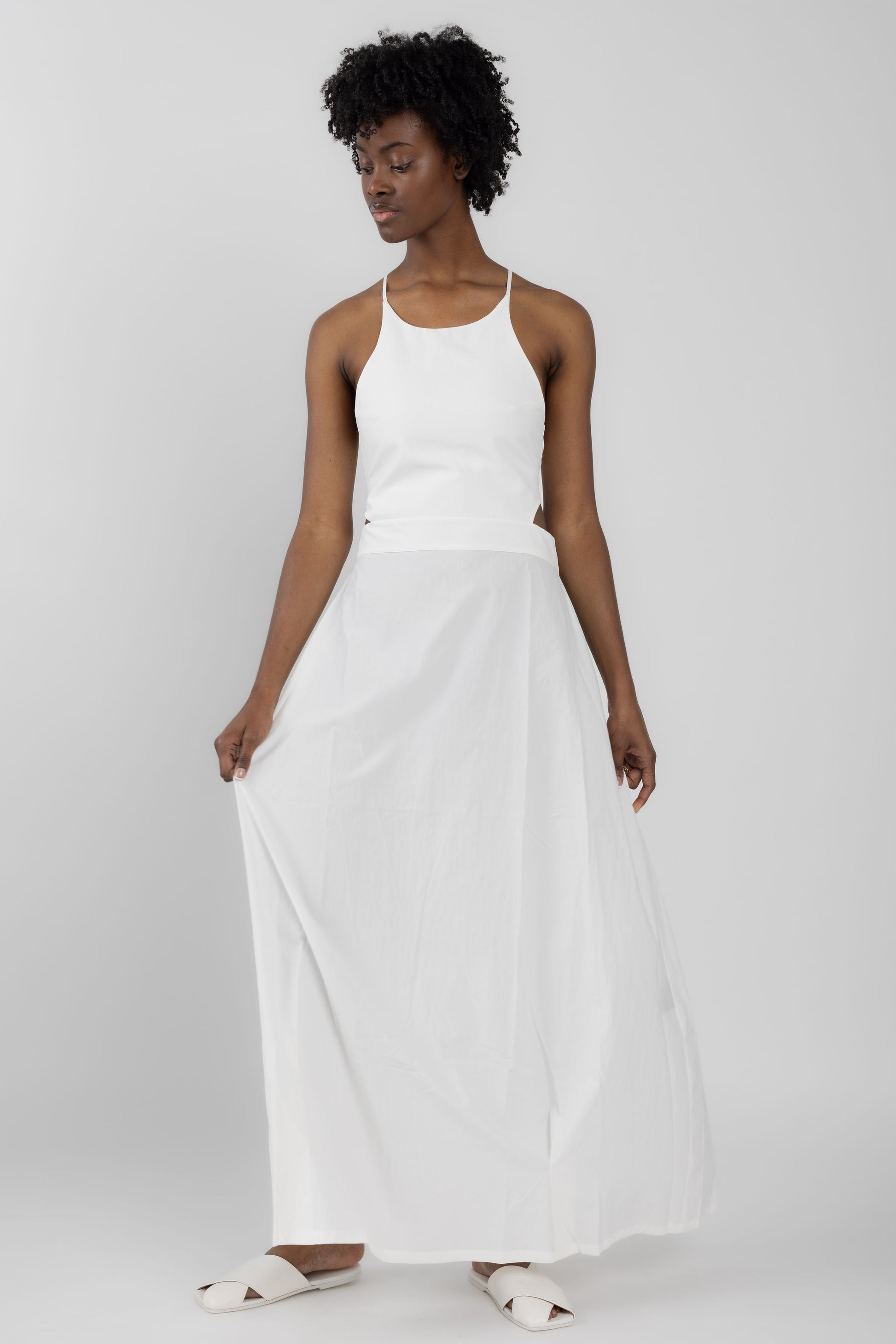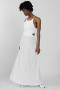 ANDREA YA'AQOV Long Open-Back Dress in White. Versatile long dress in with an edgy understated silhouette. Featuring a cut-out back and a-line skirt. Made of a cupro cotton blend. Forward styling with a comfortable and flattering fit.