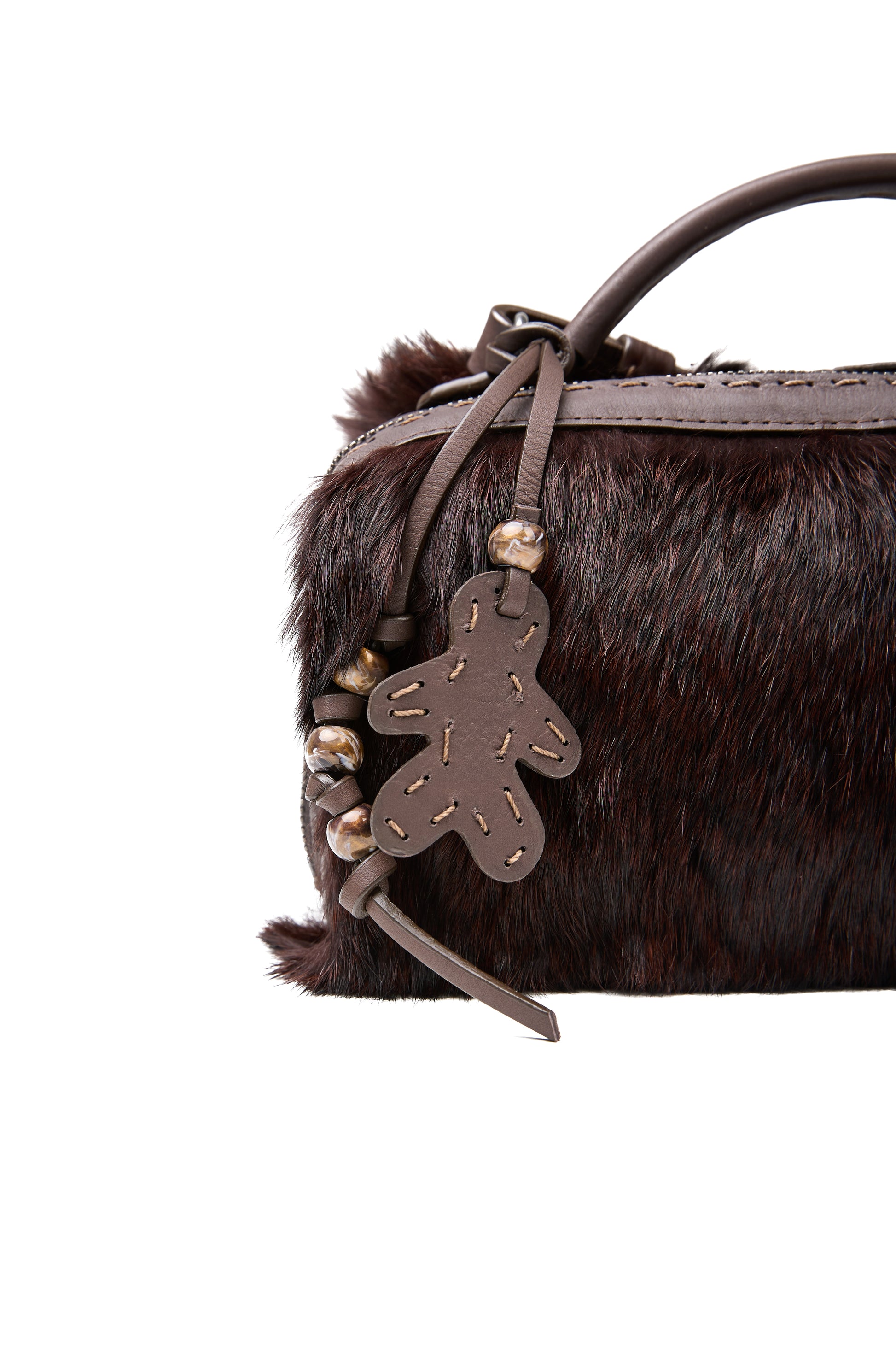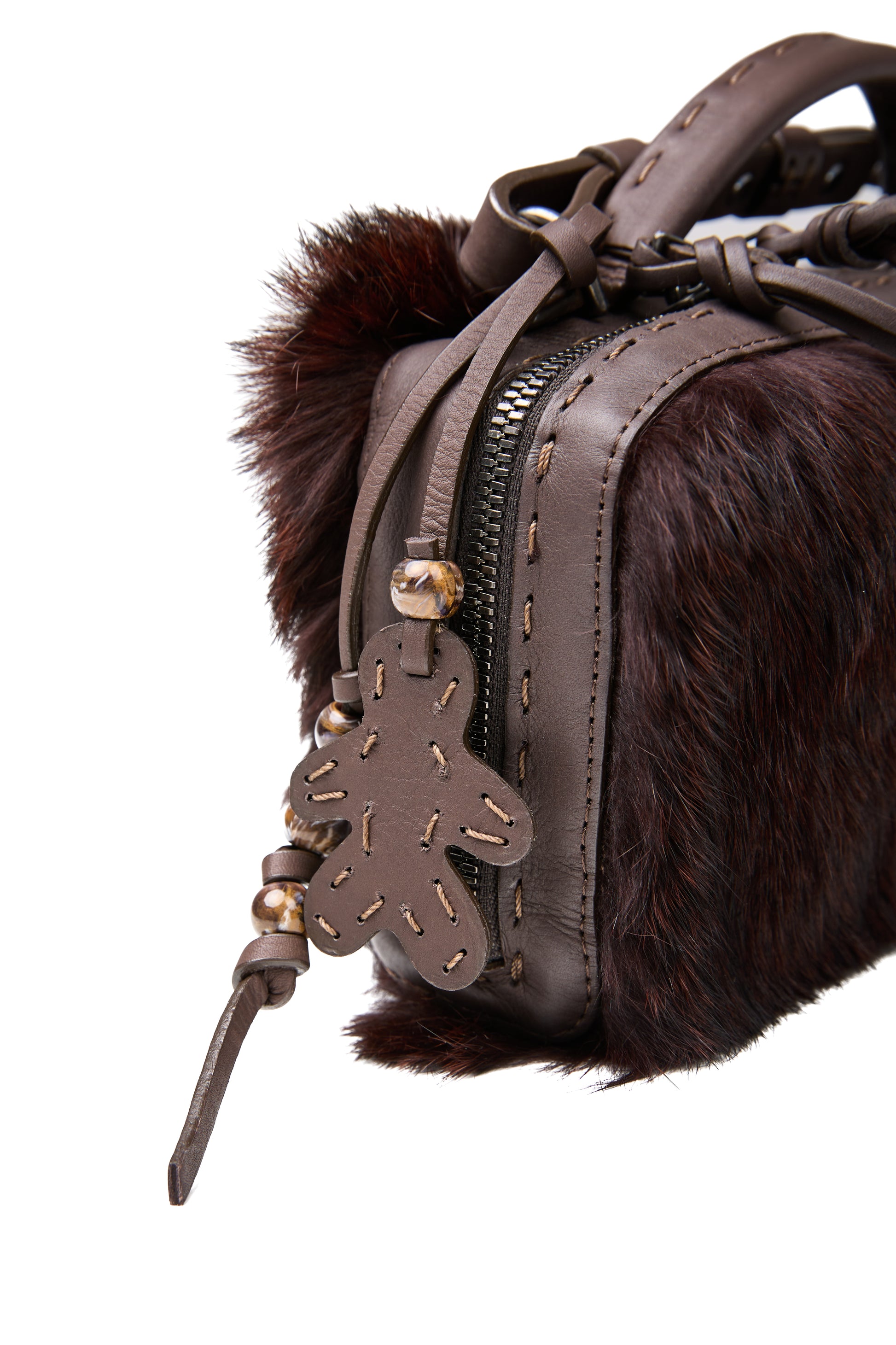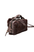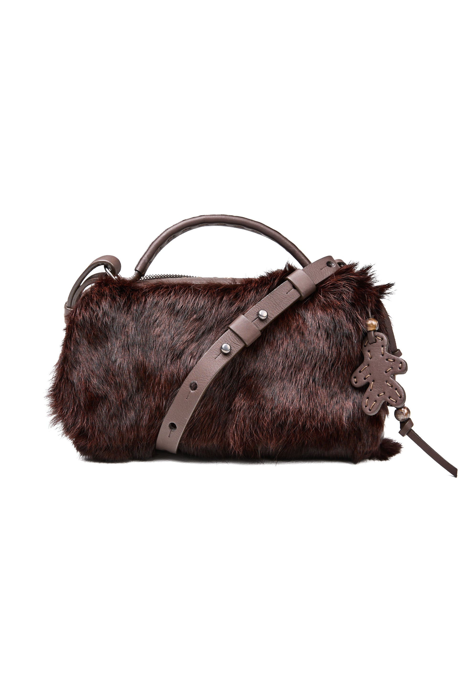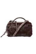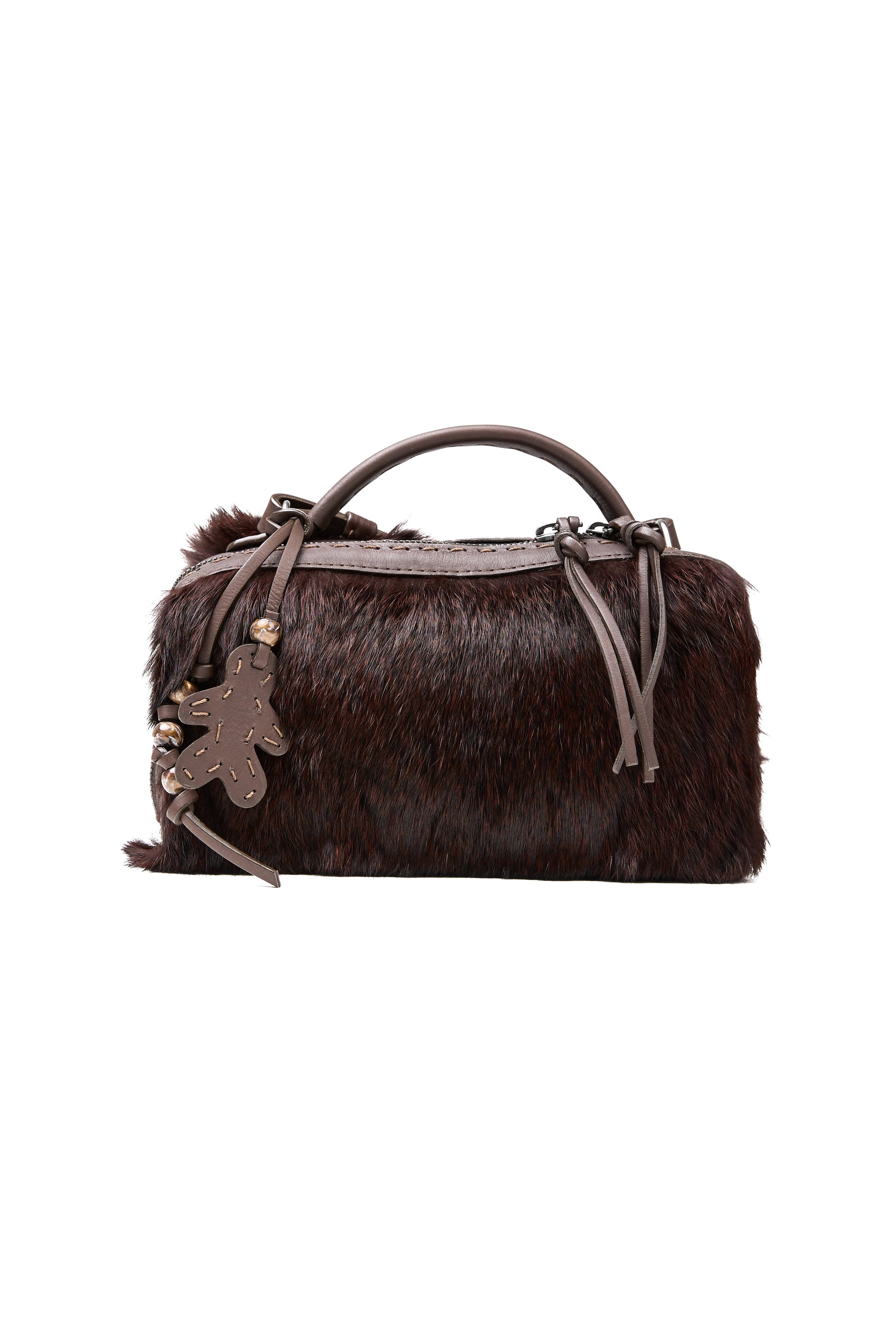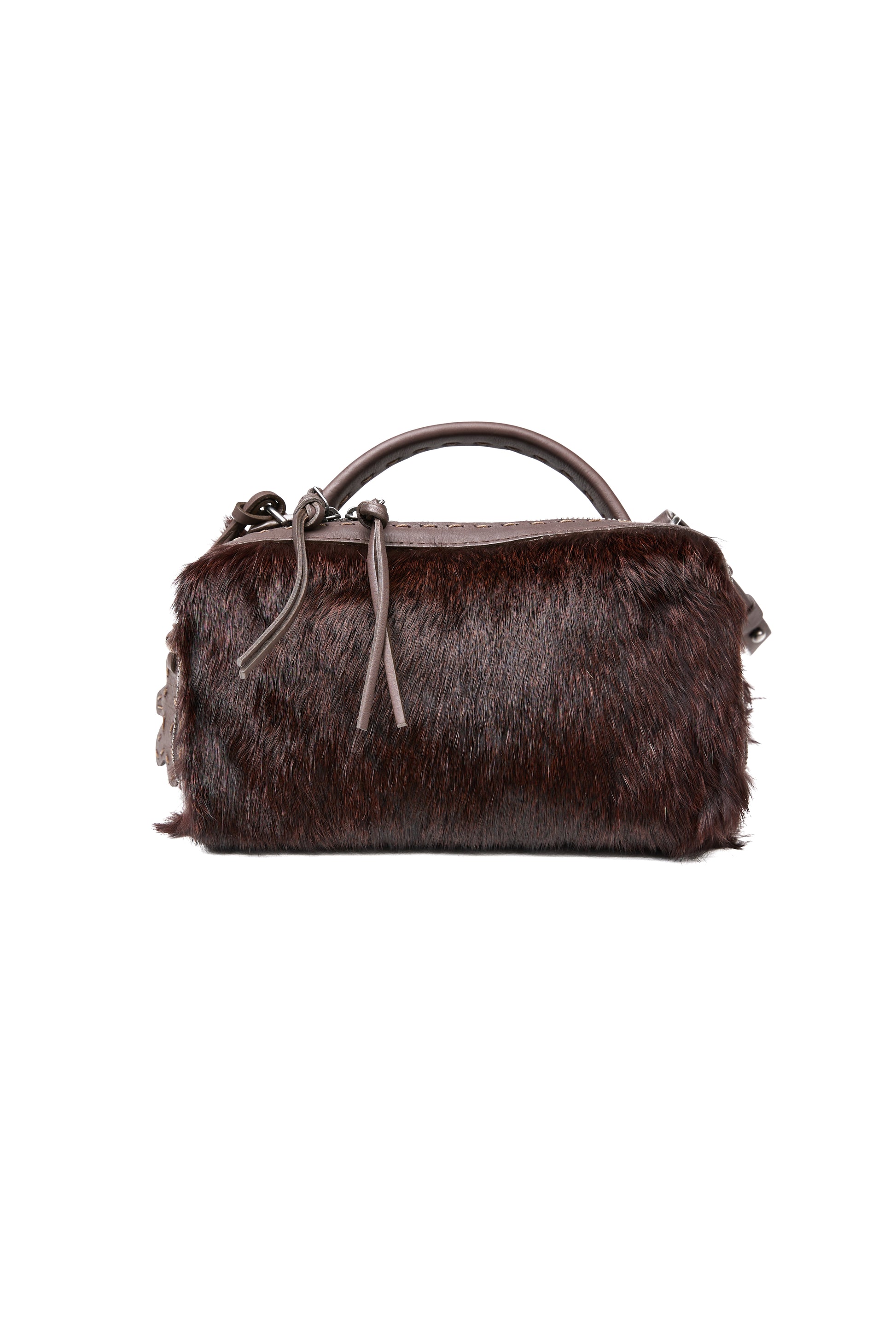 The HENRY BEGUELIN Manico Leather Box Bag in Lapin Wine is meticulously handcrafted in Italy from soft leather and exquisite wine-colored lapin fur, offering a luxurious, tactile finish. The structured box shape is complemented by a smooth top handle, an adjustable and detachable leather strap, and a secure two-way zip closure, making it a refined companion that elevates every outfit with understated sophistication.