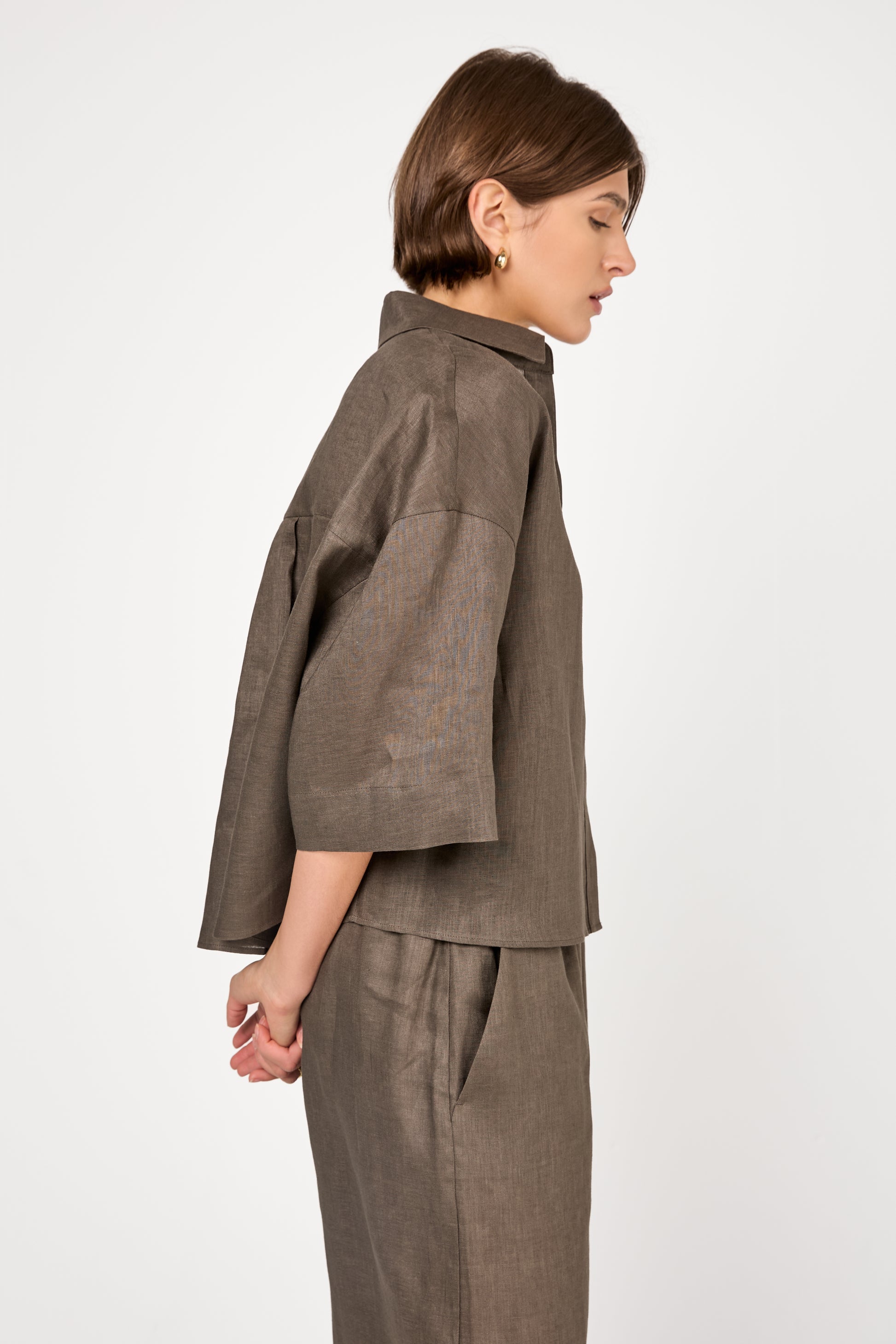The MAX MARA Mirano Linen Shirt in Dark Green is crafted from 100% pure linen, blending effortless style with breathable comfort. Featuring a structured collar, 3/4-length sleeves, and a hidden button placket, it exudes understated elegance. The dark green hue adds a touch of sophistication.