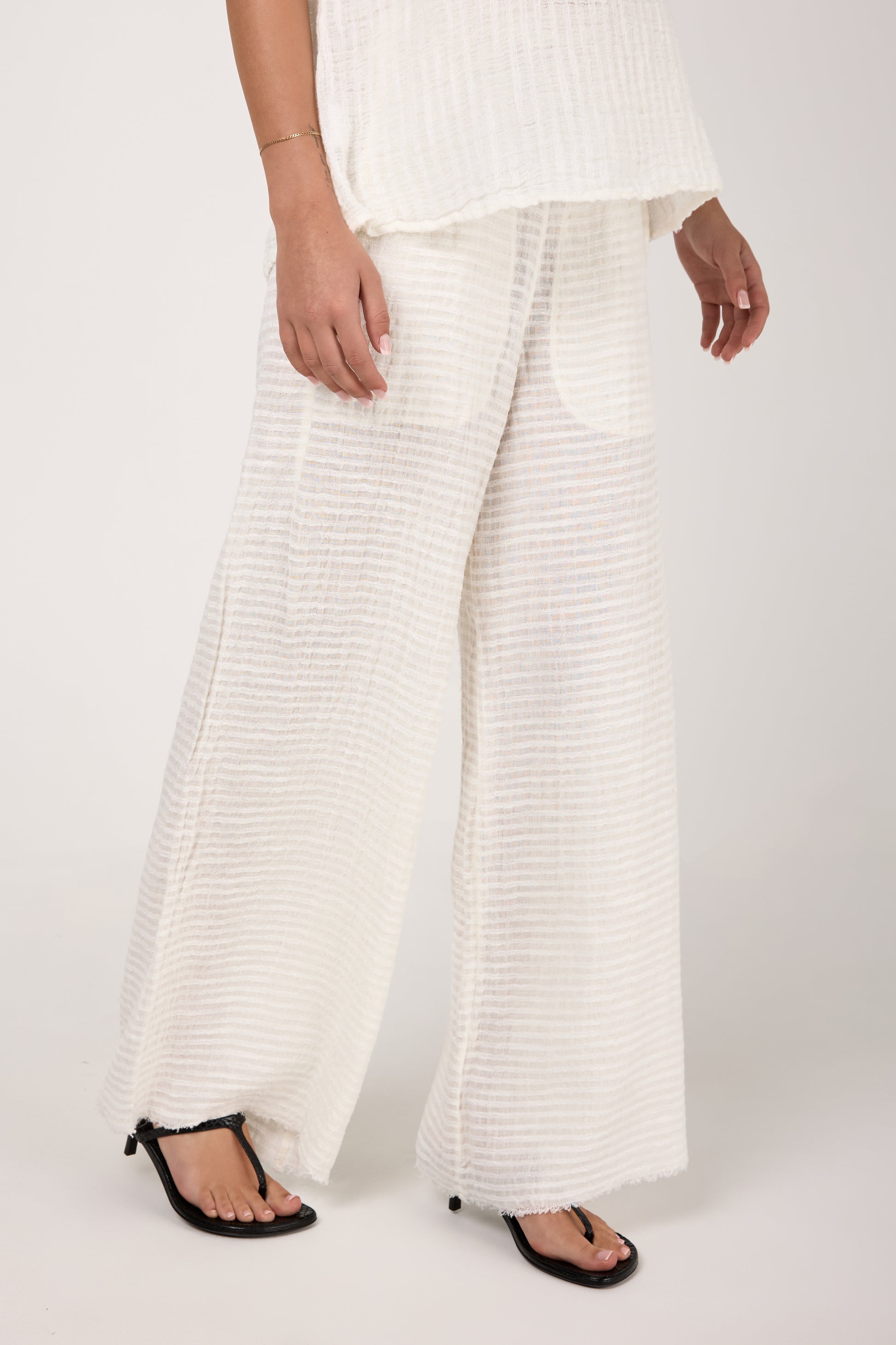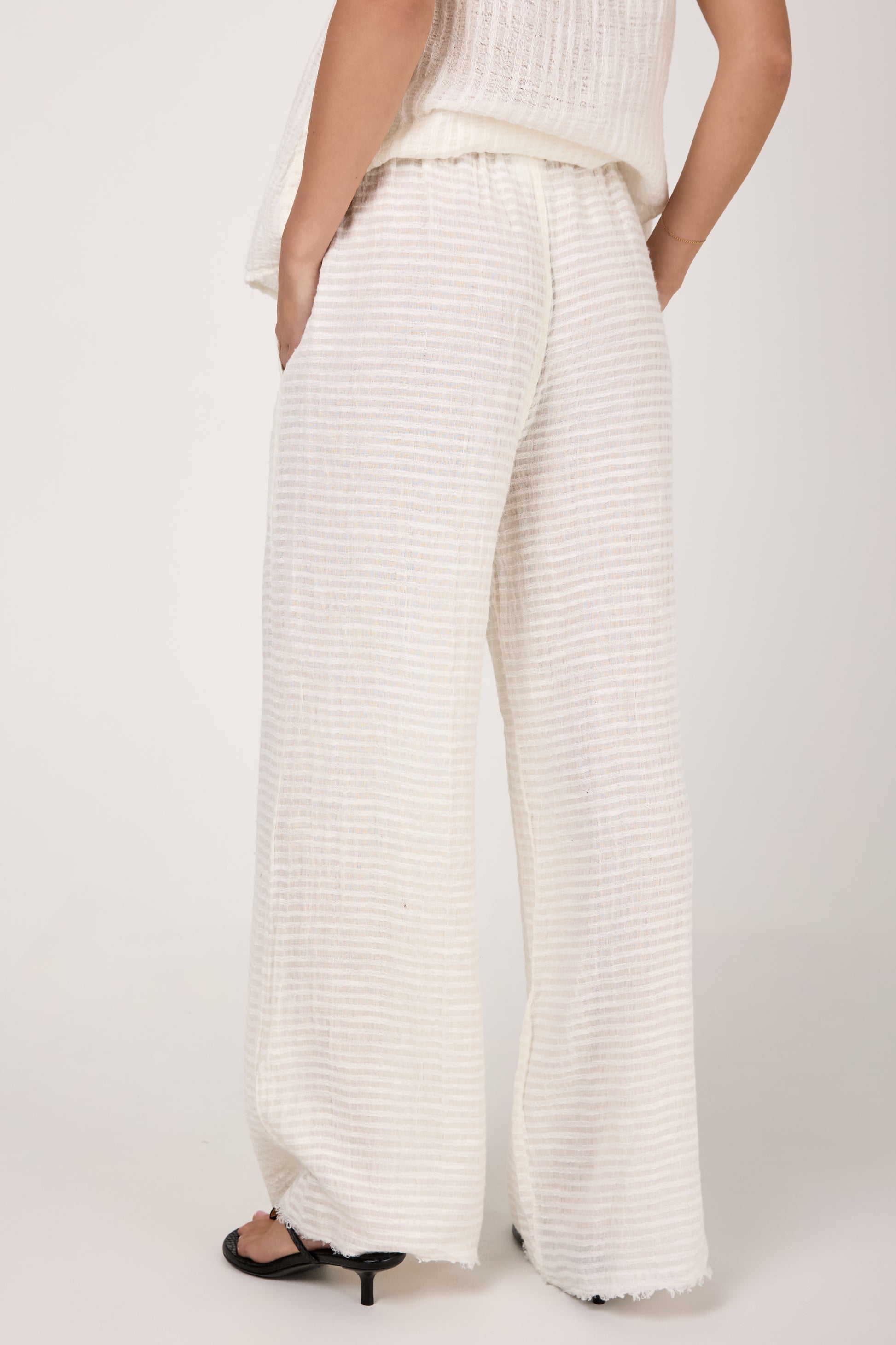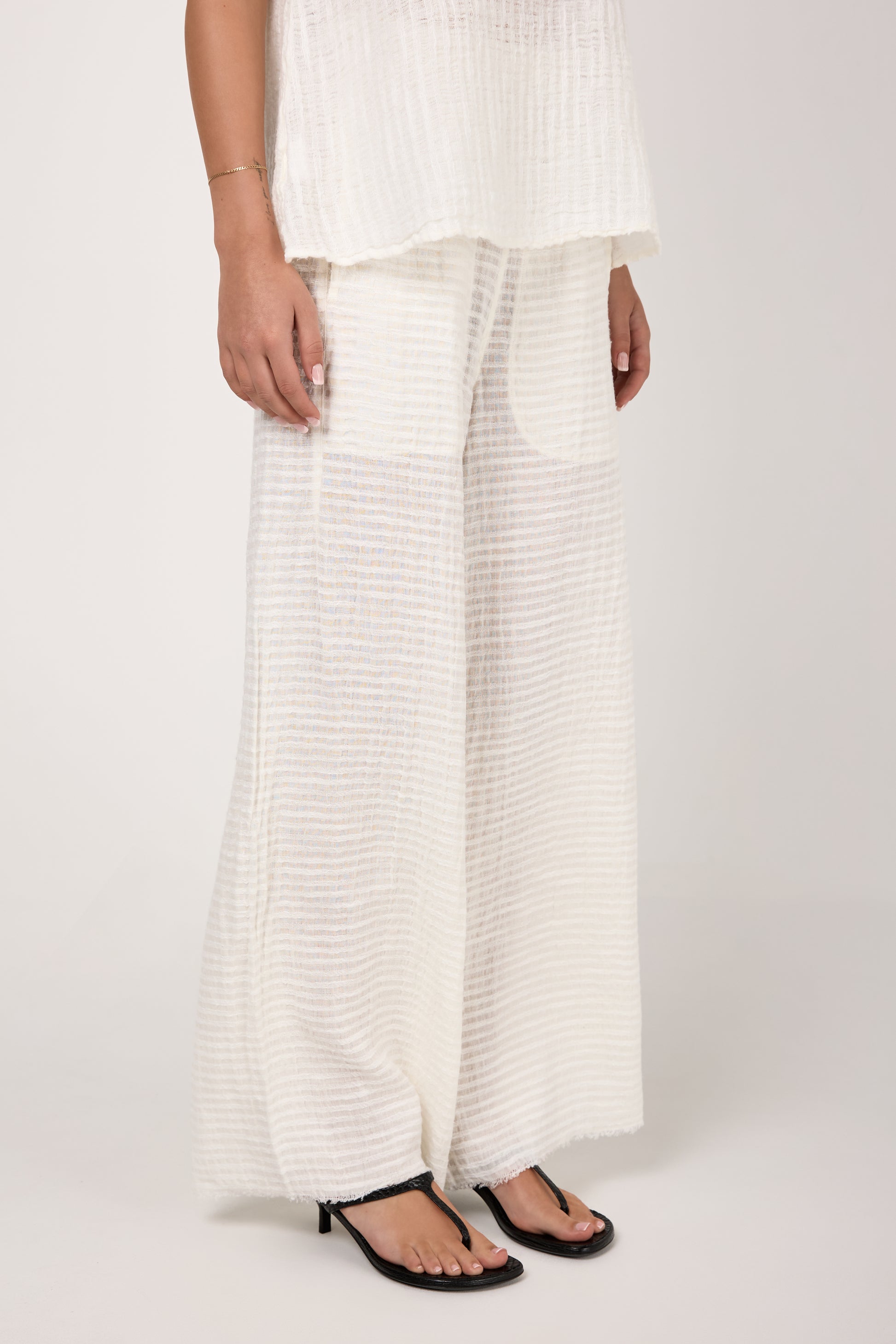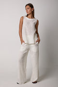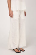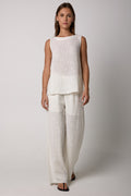 BOTTEGA DI BRUNELLA Pantalone Tritone Tela Uffizi Linen Pant in Latte. Effortless and chic pull-on pant crafted from natural linen fabric. Featuring a relaxed silhouette with wide legs and and elasticated waist. Designed for both on-trend comfort and flexibility.