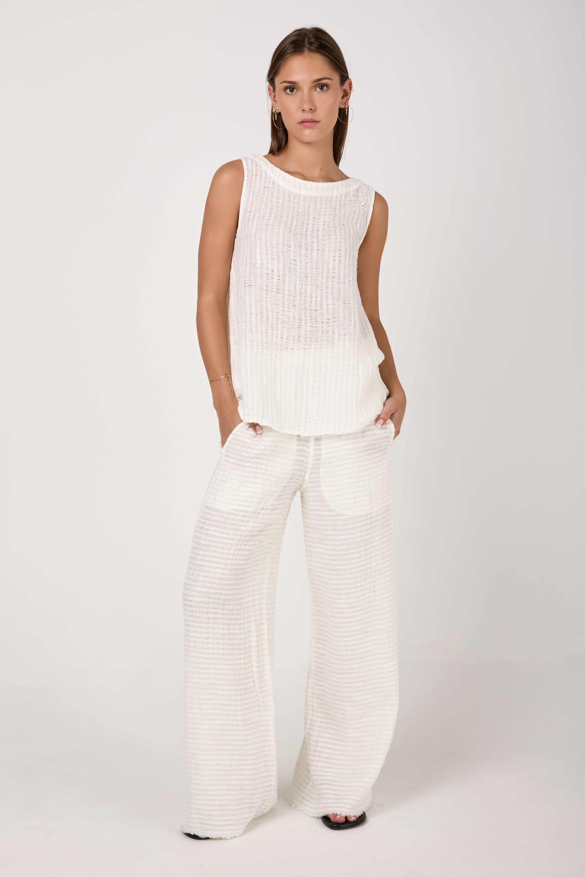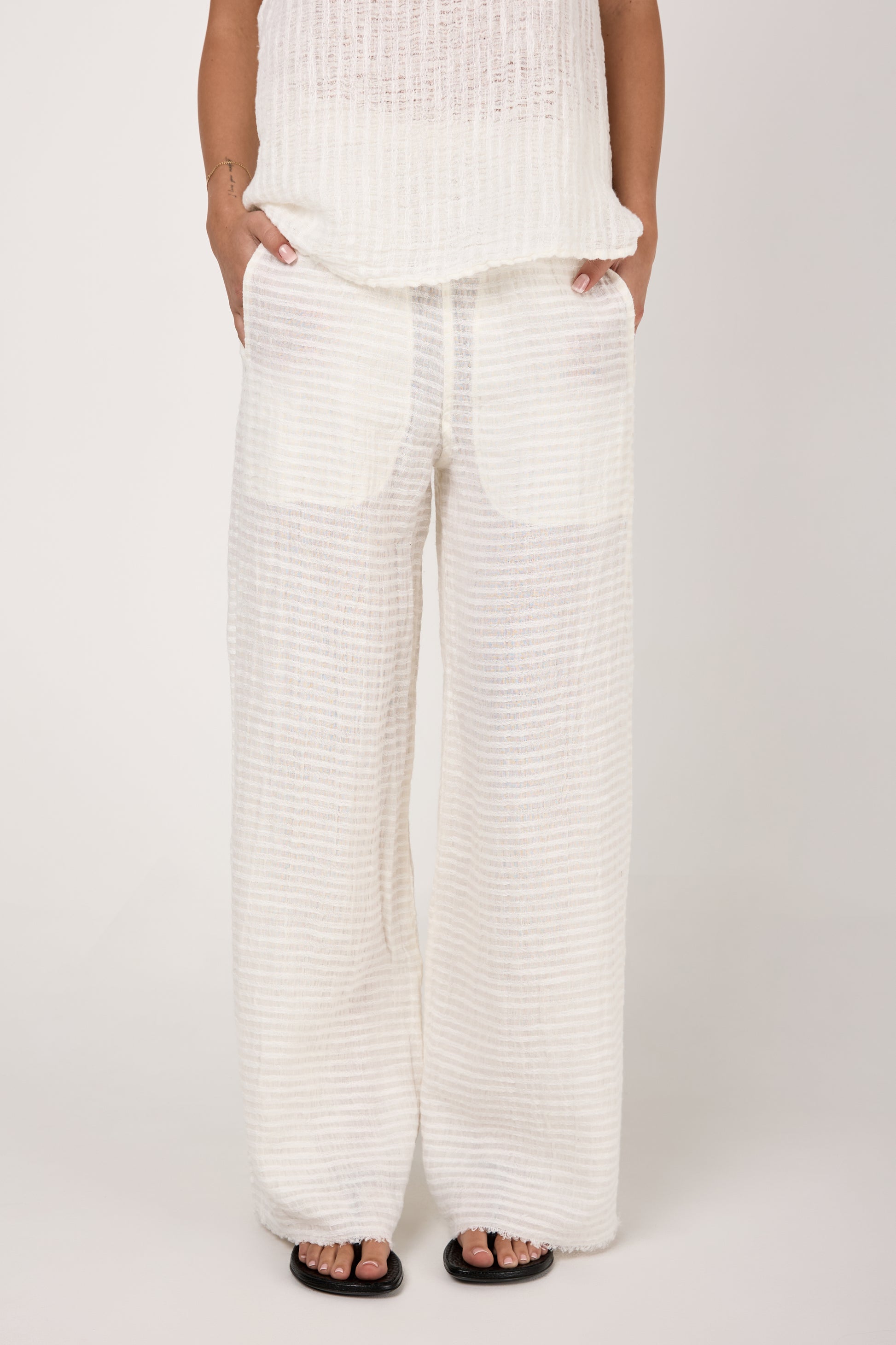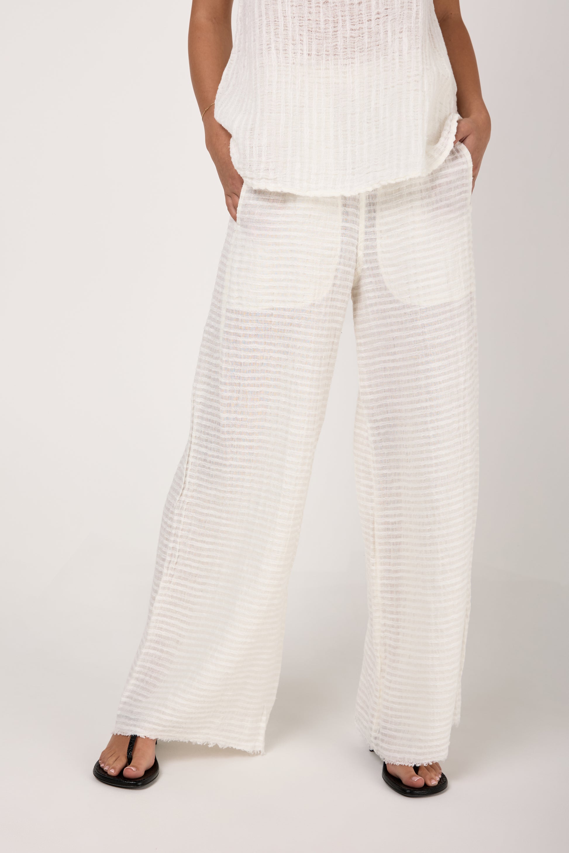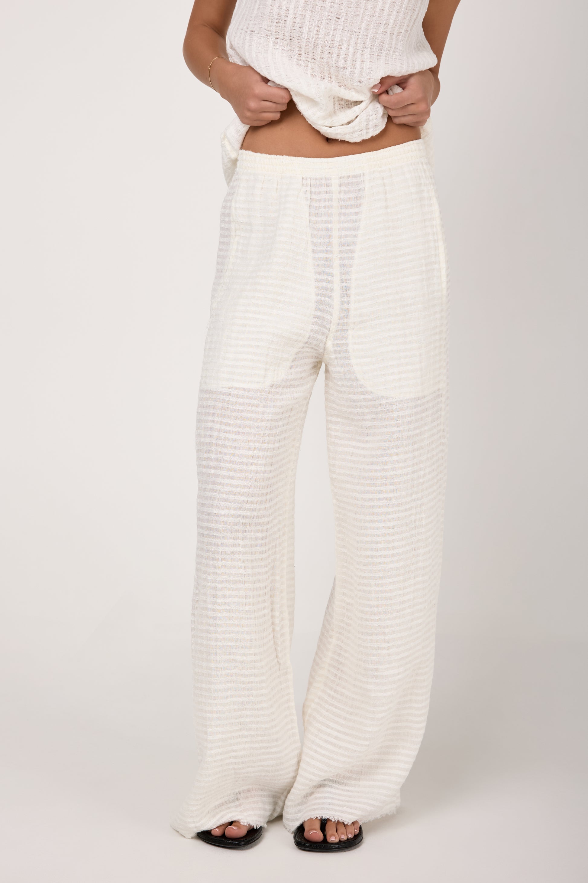 BOTTEGA DI BRUNELLA Pantalone Tritone Tela Uffizi Linen Pant in Latte. Effortless and chic pull-on pant crafted from natural linen fabric. Featuring a relaxed silhouette with wide legs and and elasticated waist. Designed for both on-trend comfort and flexibility.