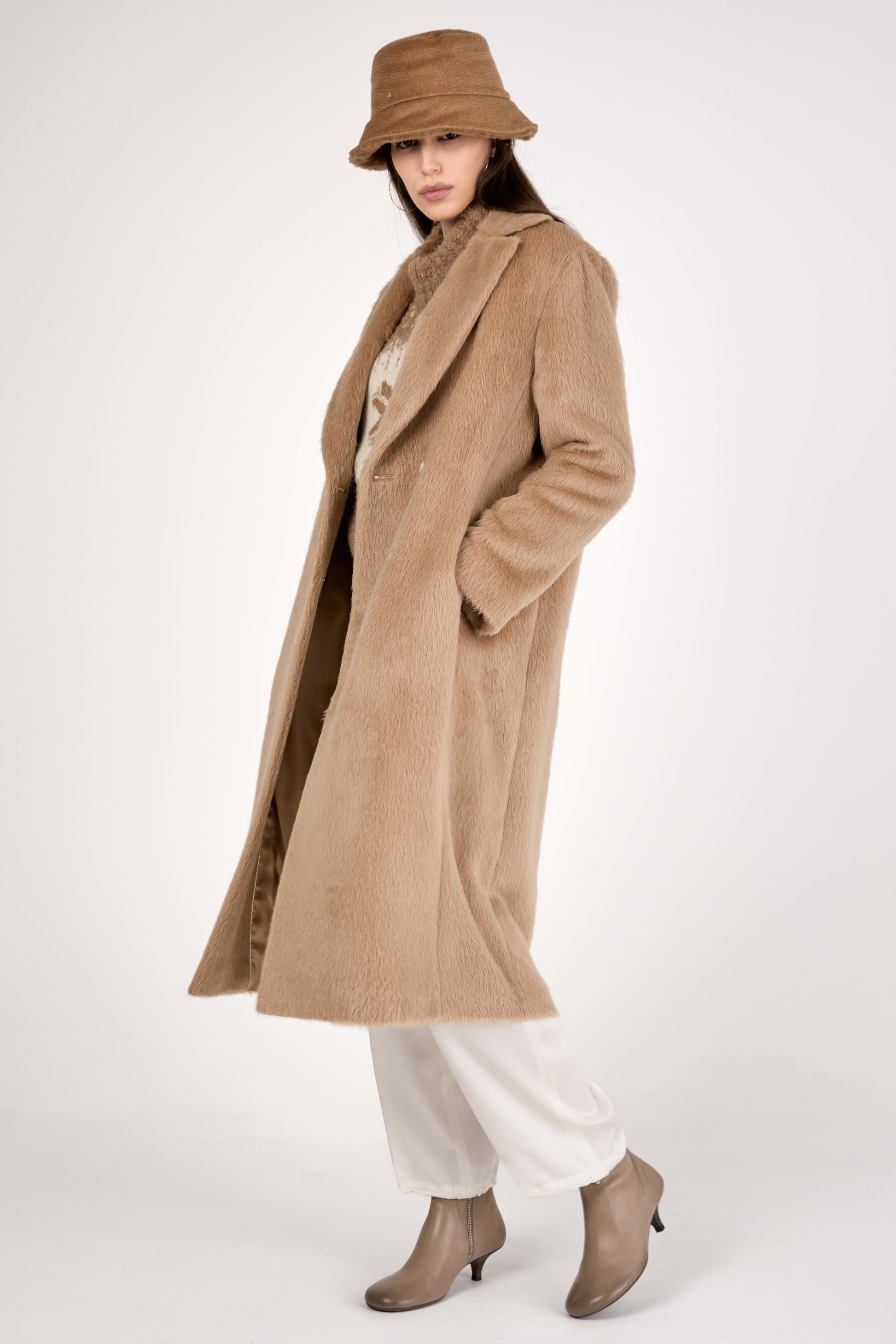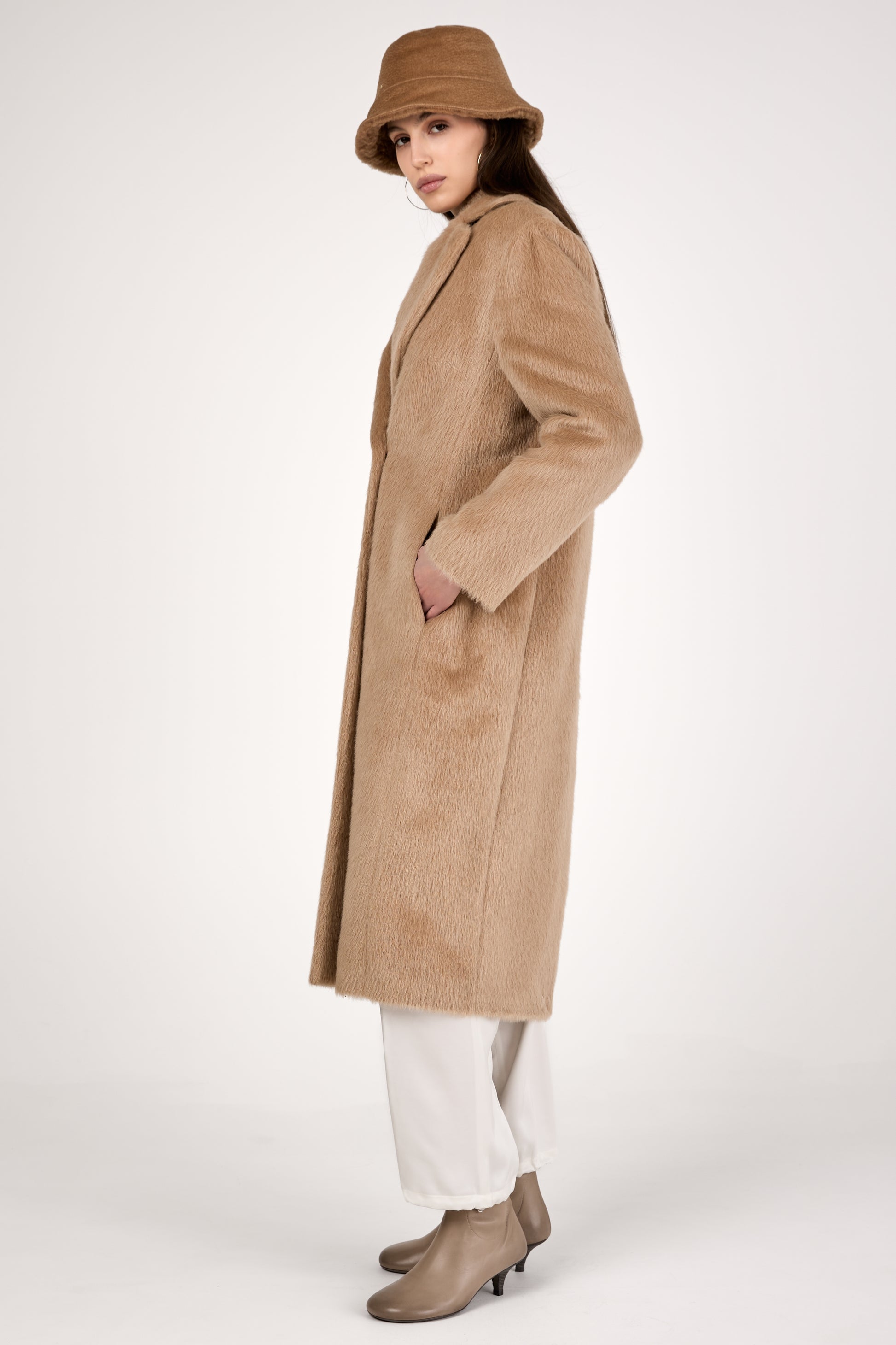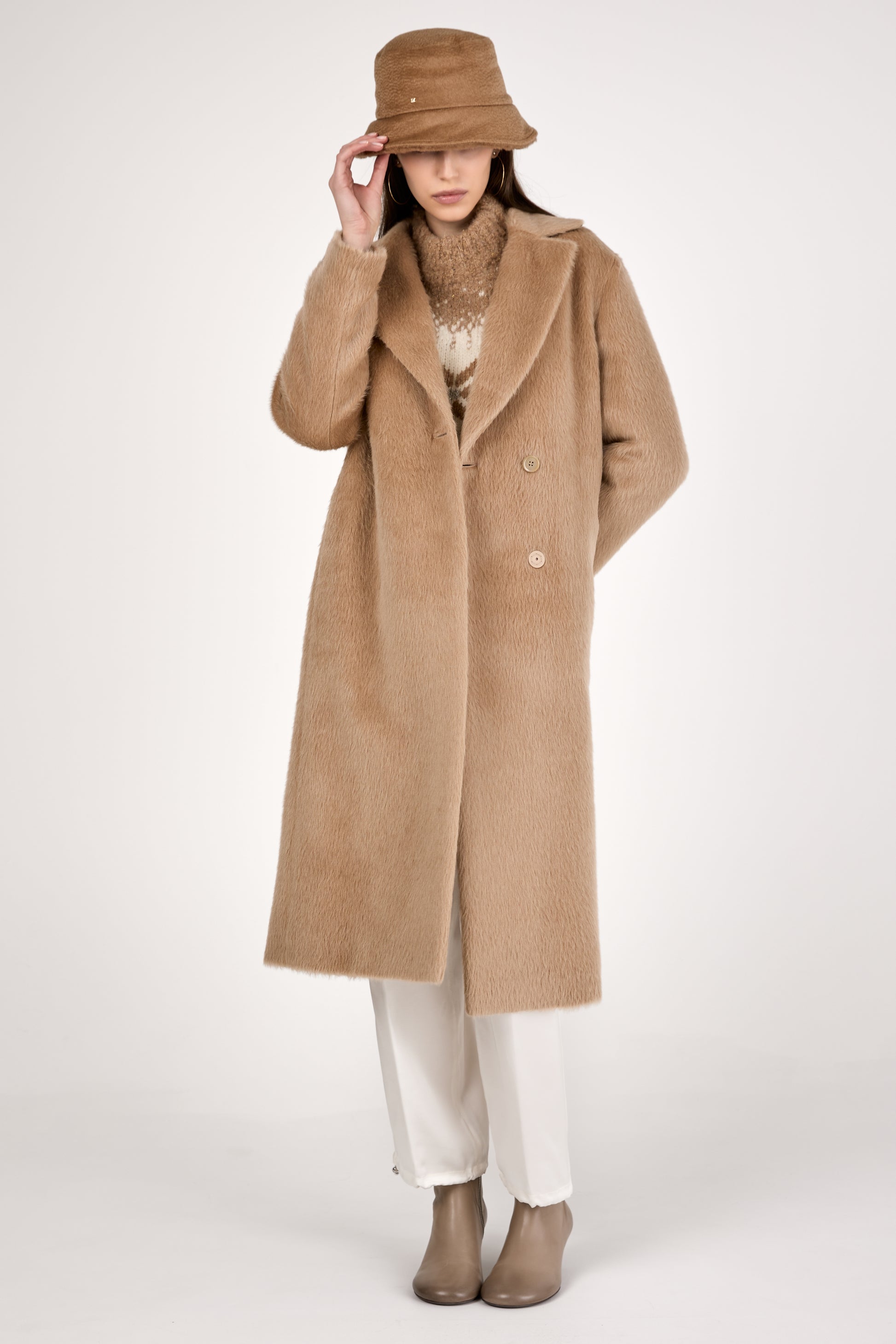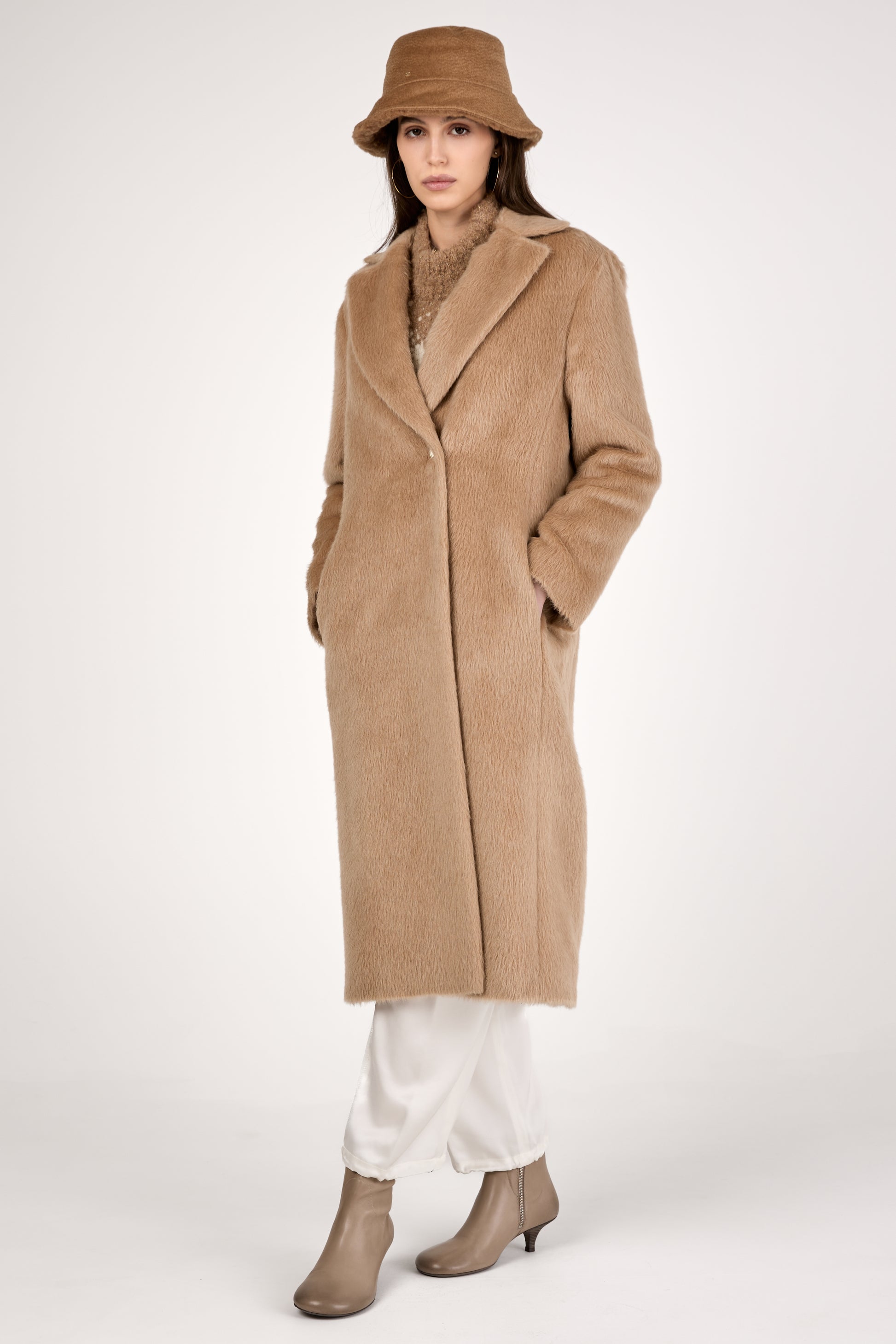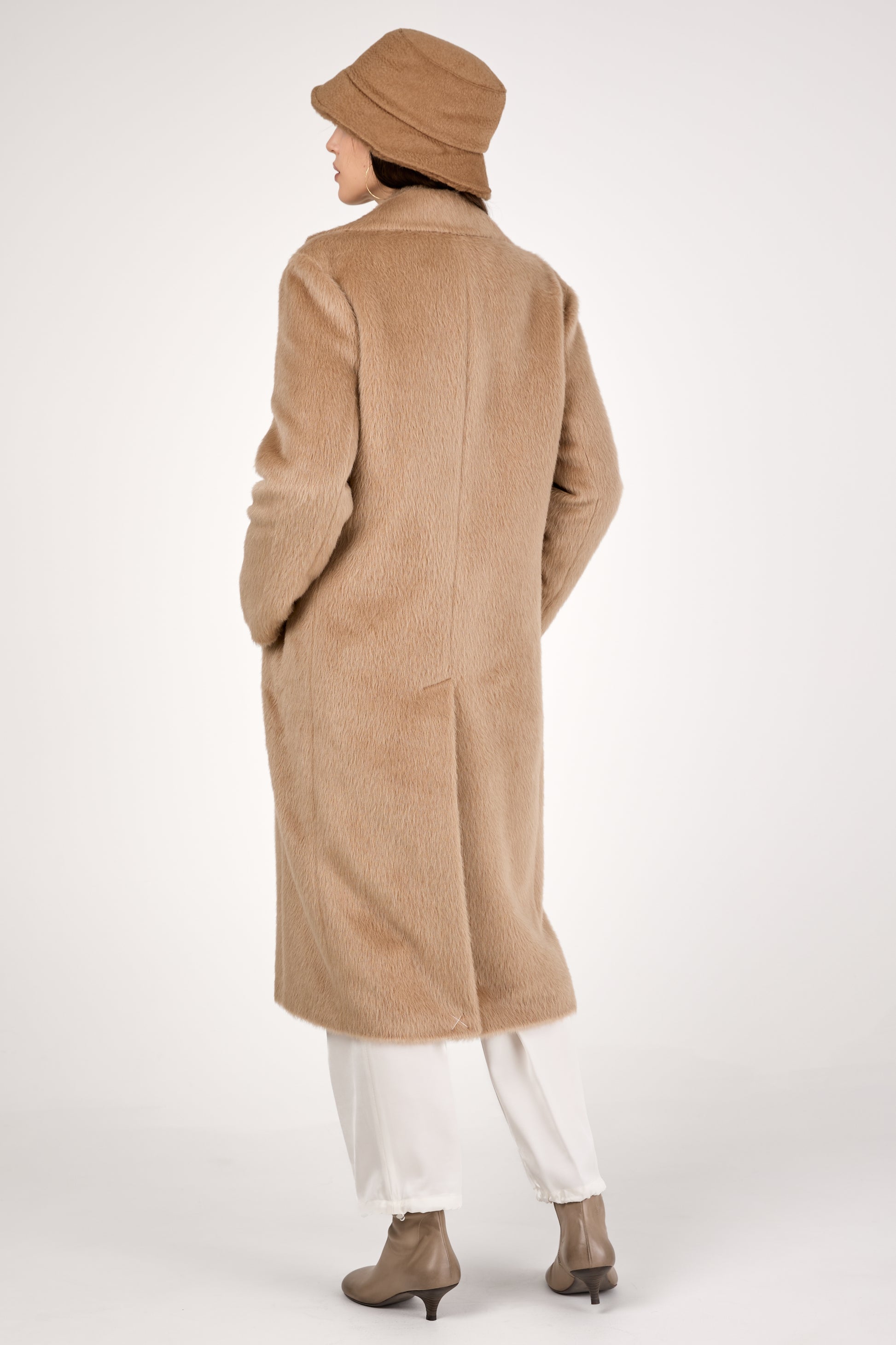 The PESERICO Alpaca Long Coat in Camel is crafted from a luxurious blend of fine long-haired baby suri alpaca and pure new wool. It features a collar with classic lapels and long, straight sleeves that provide both comfort and sophistication. In-seam side pockets add functionality while preserving a clean, refined silhouette. The single button front closure creates an elegant, versatile figure, ideal for a minimalist, modern style. Made in Italy.