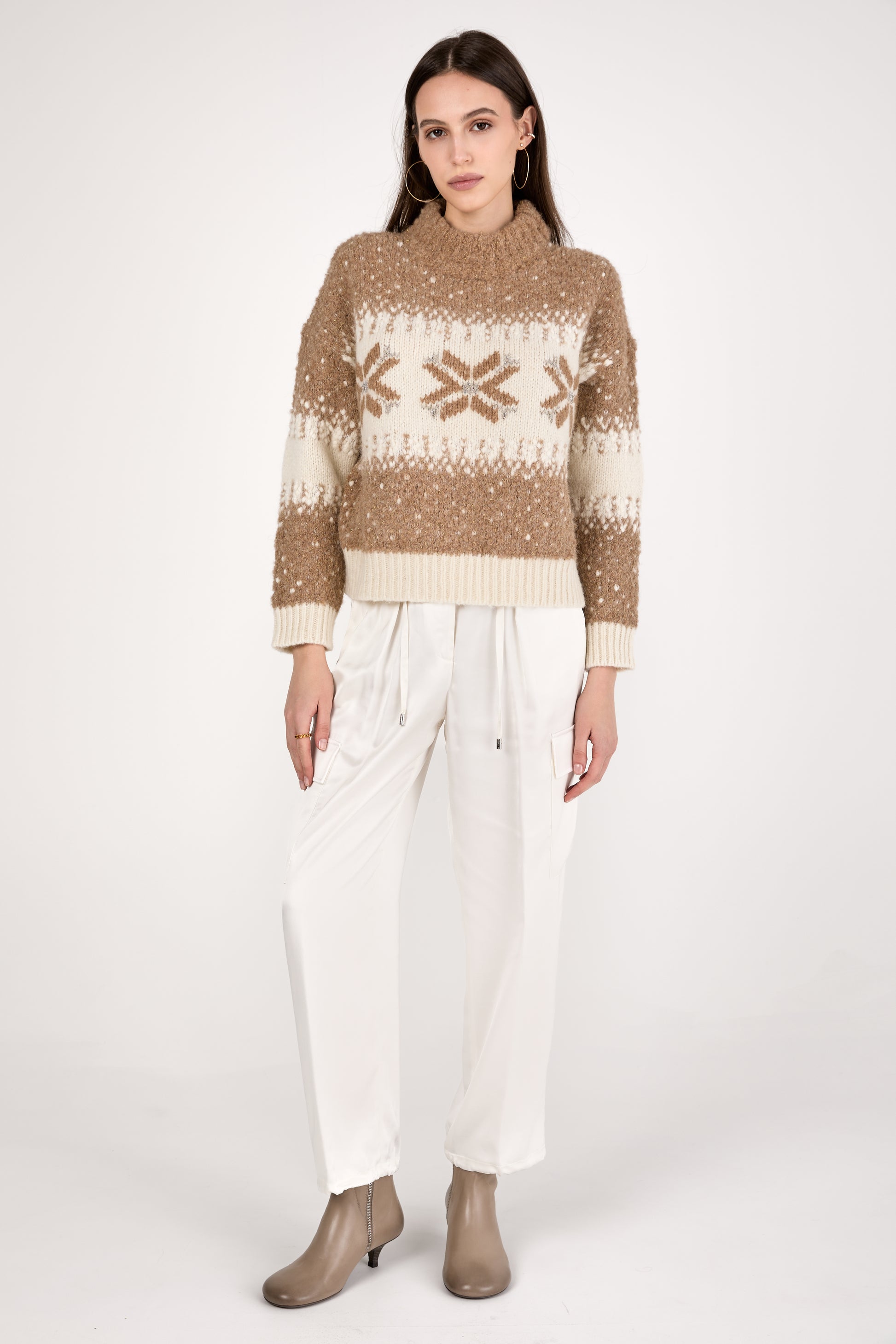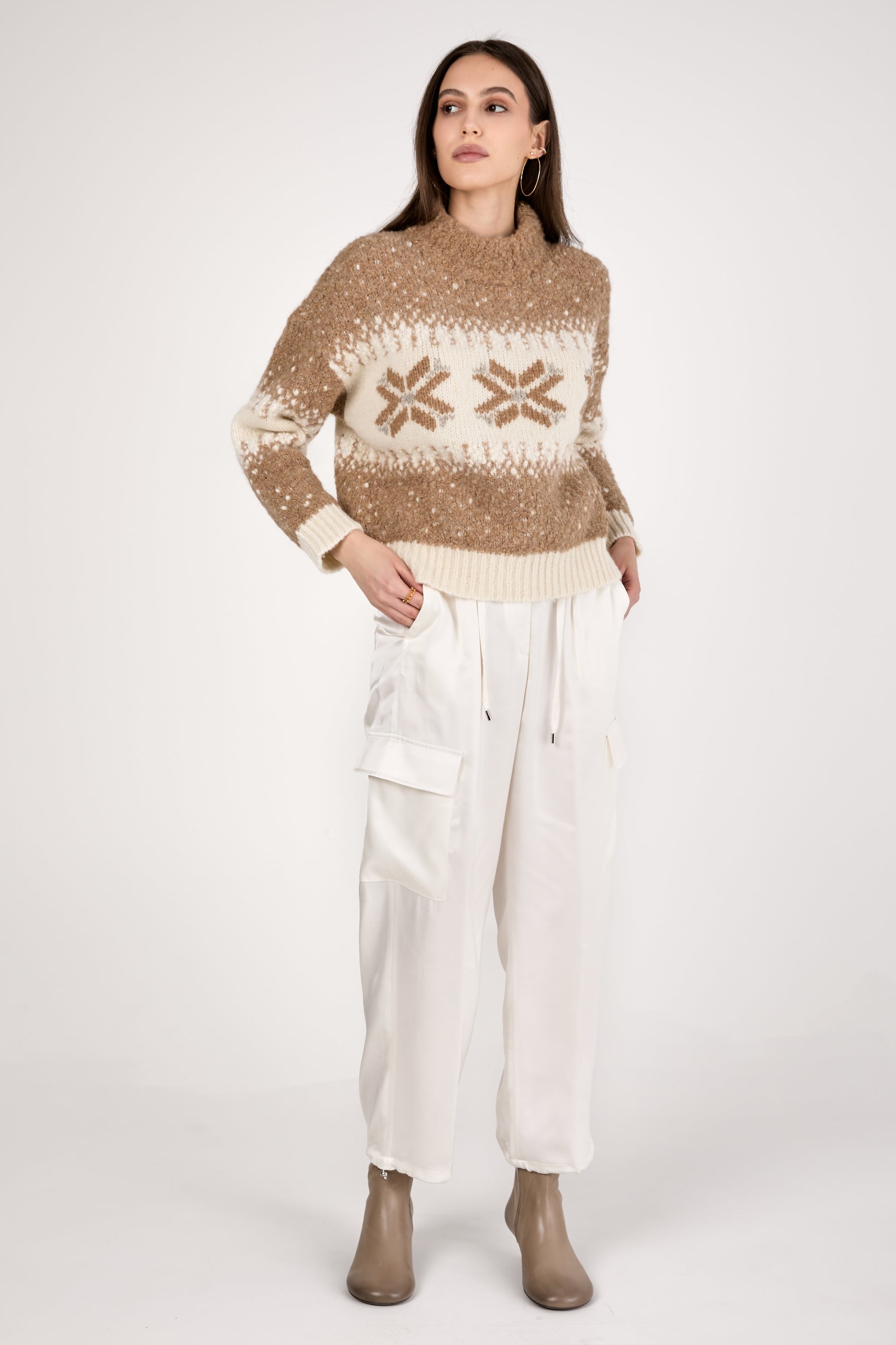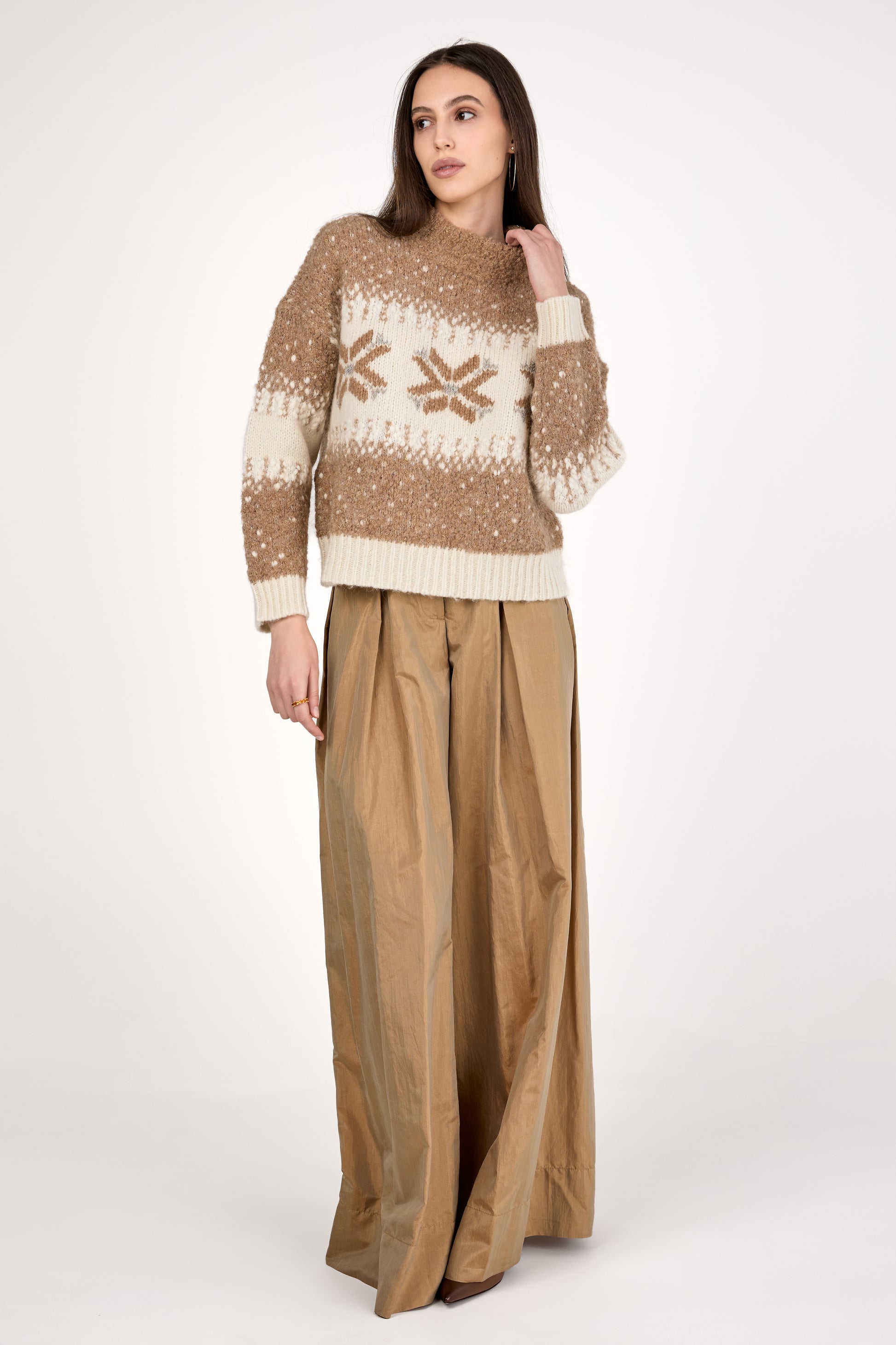 The PESERICO Alpaca Sweater in Camel with Sequins is handmade from a luxurious bouclé blend of baby suri alpaca, new wool, and lurex, offering a sophisticated texture. Its regular fit gently contours the body, providing supreme comfort. The front embroidery, accented with Punto Luce detailing, evokes the serene beauty of mountains and snow. With a classic crew neck and long sleeves, this sweater offers a timeless, versatile style that is perfect for any occasion. Made in Italy.
