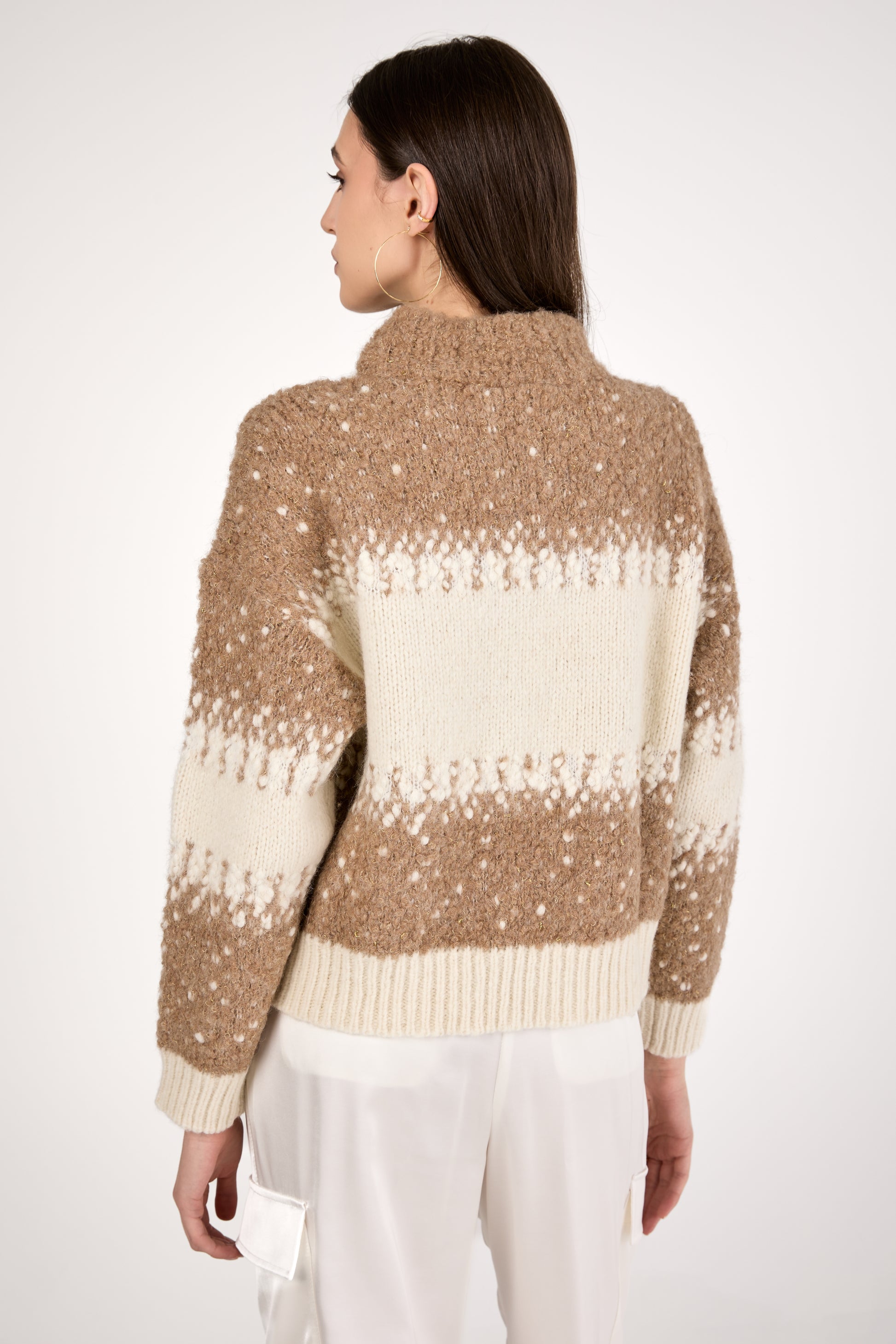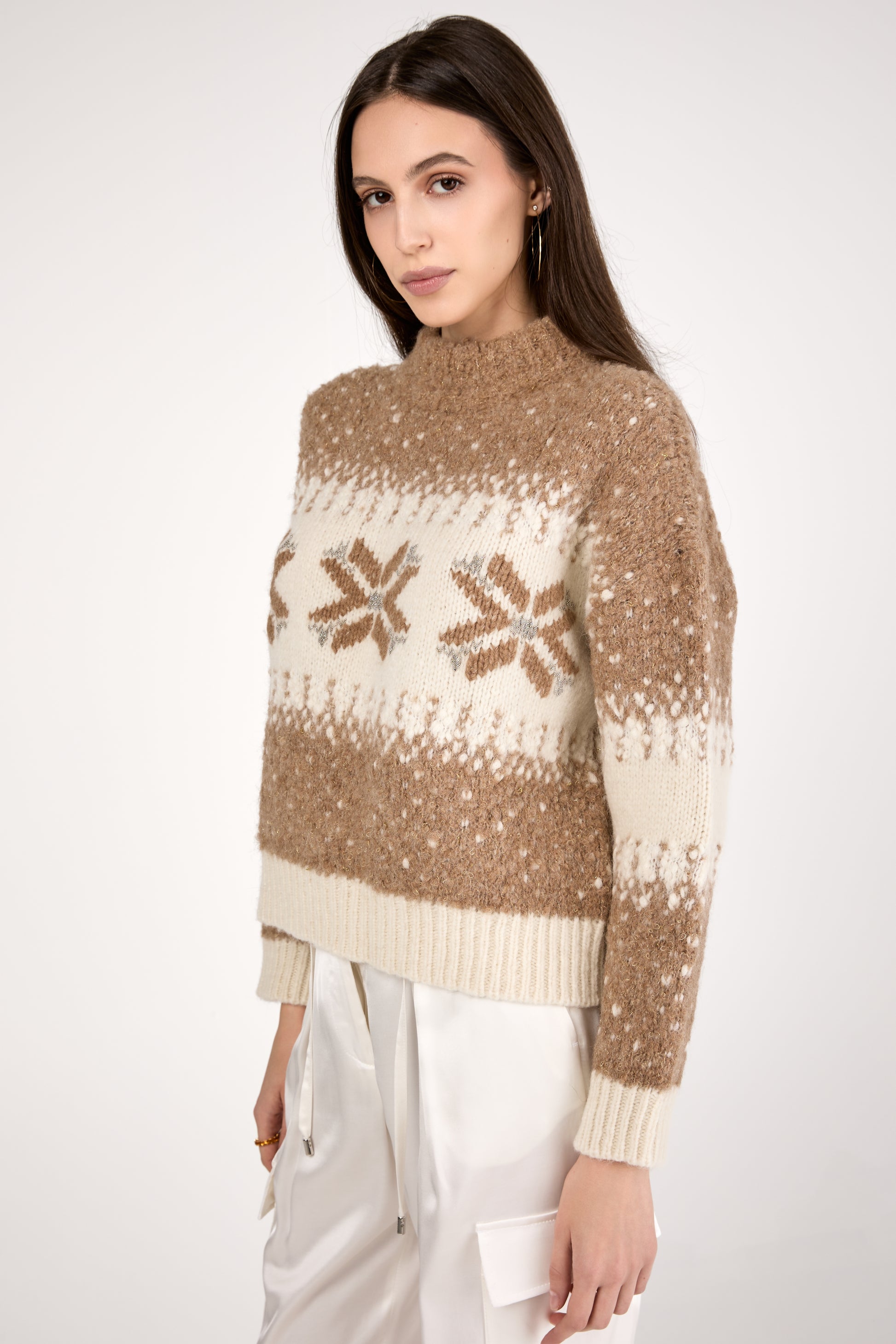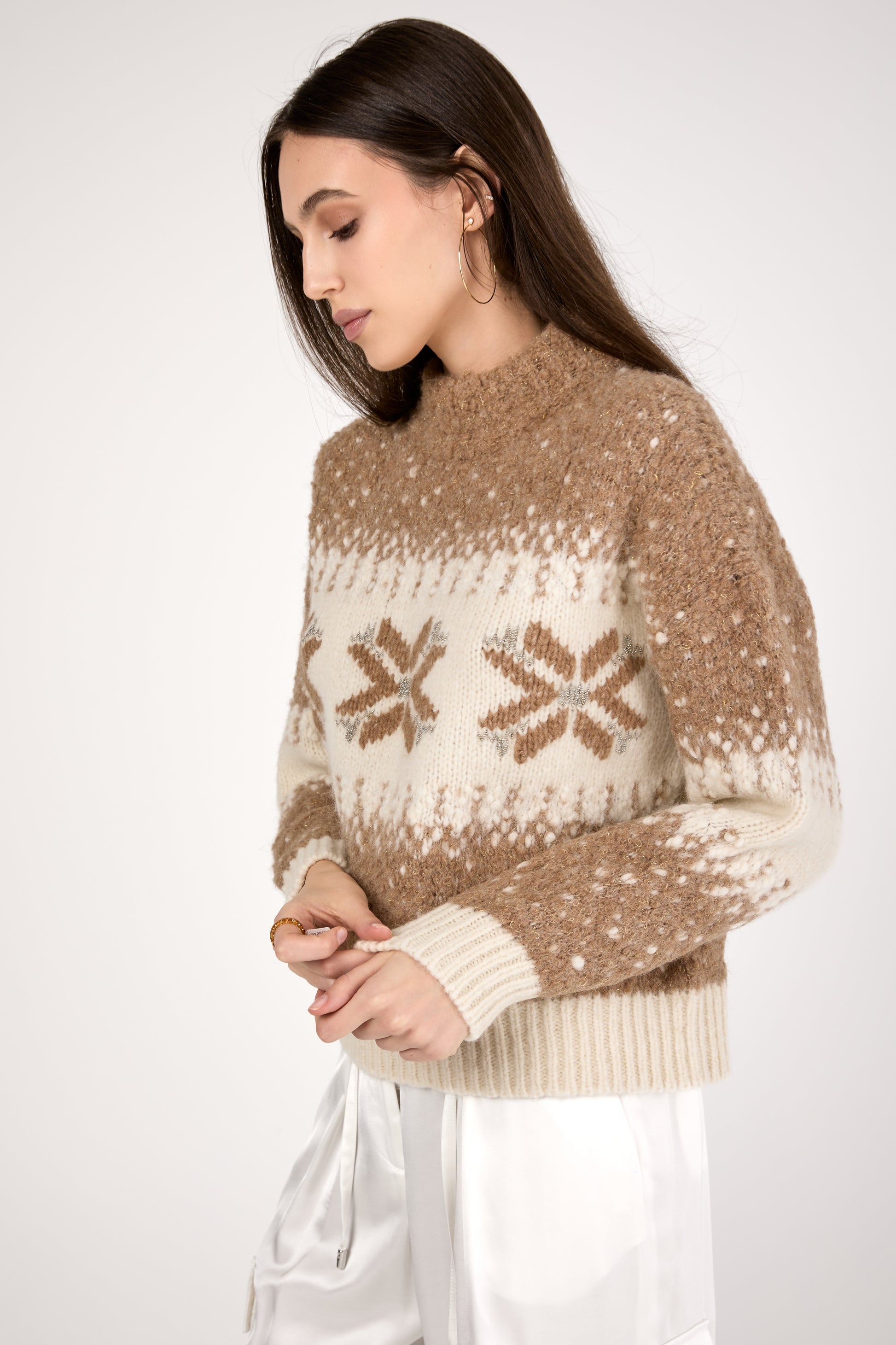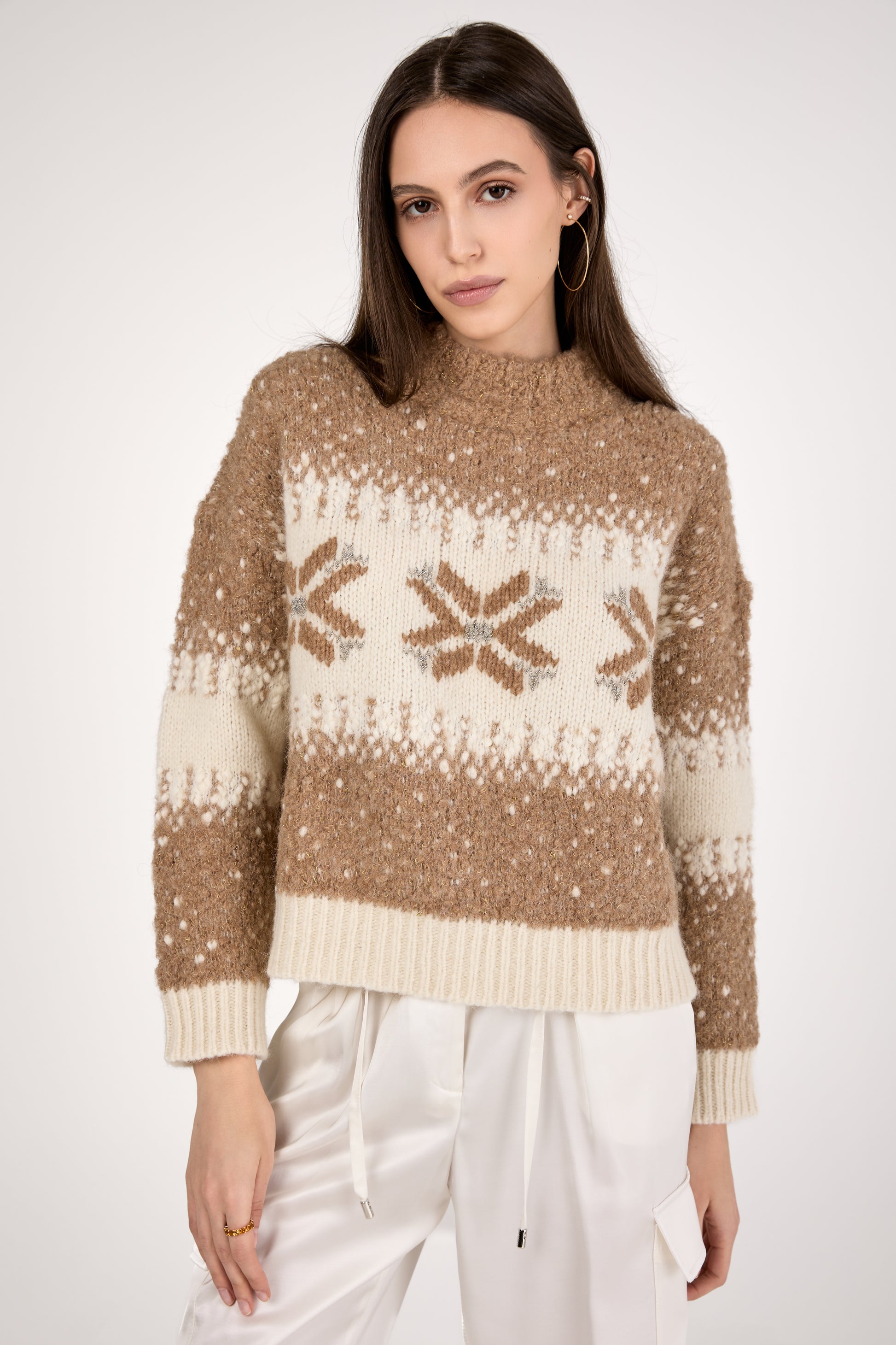 The PESERICO Alpaca Sweater in Camel with Sequins is handmade from a luxurious bouclé blend of baby suri alpaca, new wool, and lurex, offering a sophisticated texture. Its regular fit gently contours the body, providing supreme comfort. The front embroidery, accented with Punto Luce detailing, evokes the serene beauty of mountains and snow. With a classic crew neck and long sleeves, this sweater offers a timeless, versatile style that is perfect for any occasion. Made in Italy.