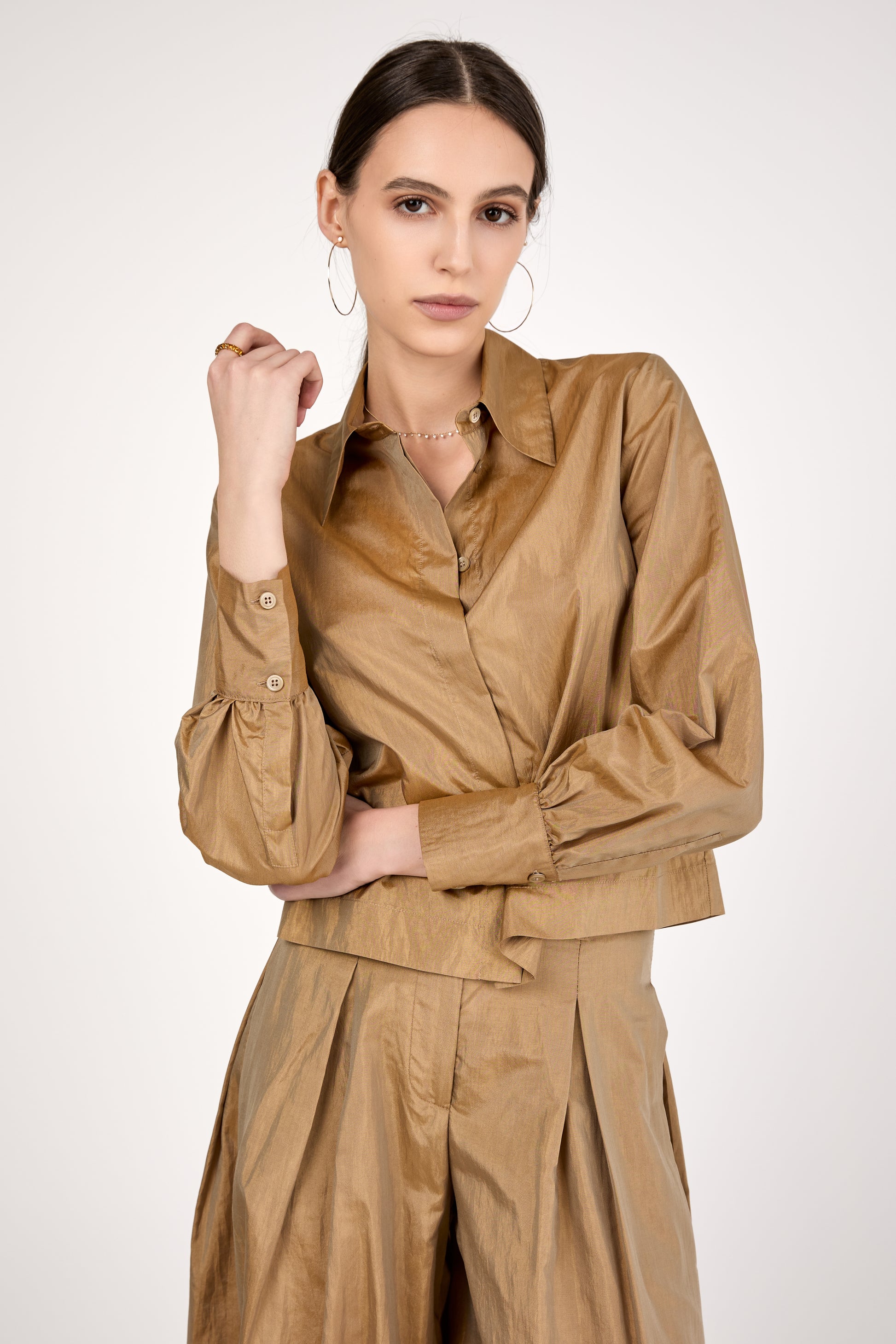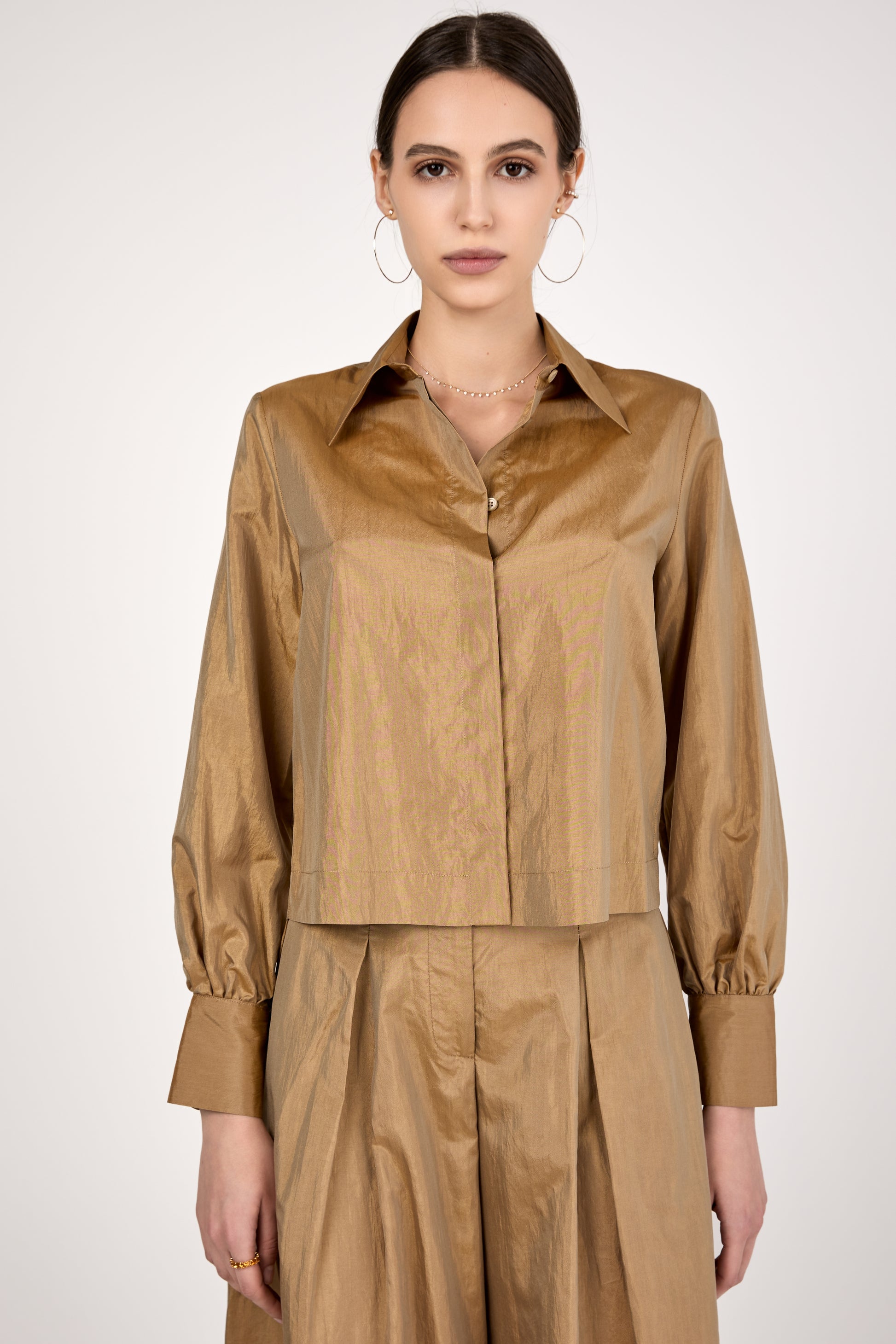 The PESERICO Cropped Shirt in Camel, crafted from a lightweight iridescent silk blend, reflects modern elegance with its subtle sheen and luxurious texture. A classic collar lends a timeless touch, while the gathered cuffs on the long sleeves bring a delicate, feminine charm. The front button closure completes the design, offering a tailored fit and effortless style. Made in Italy.