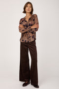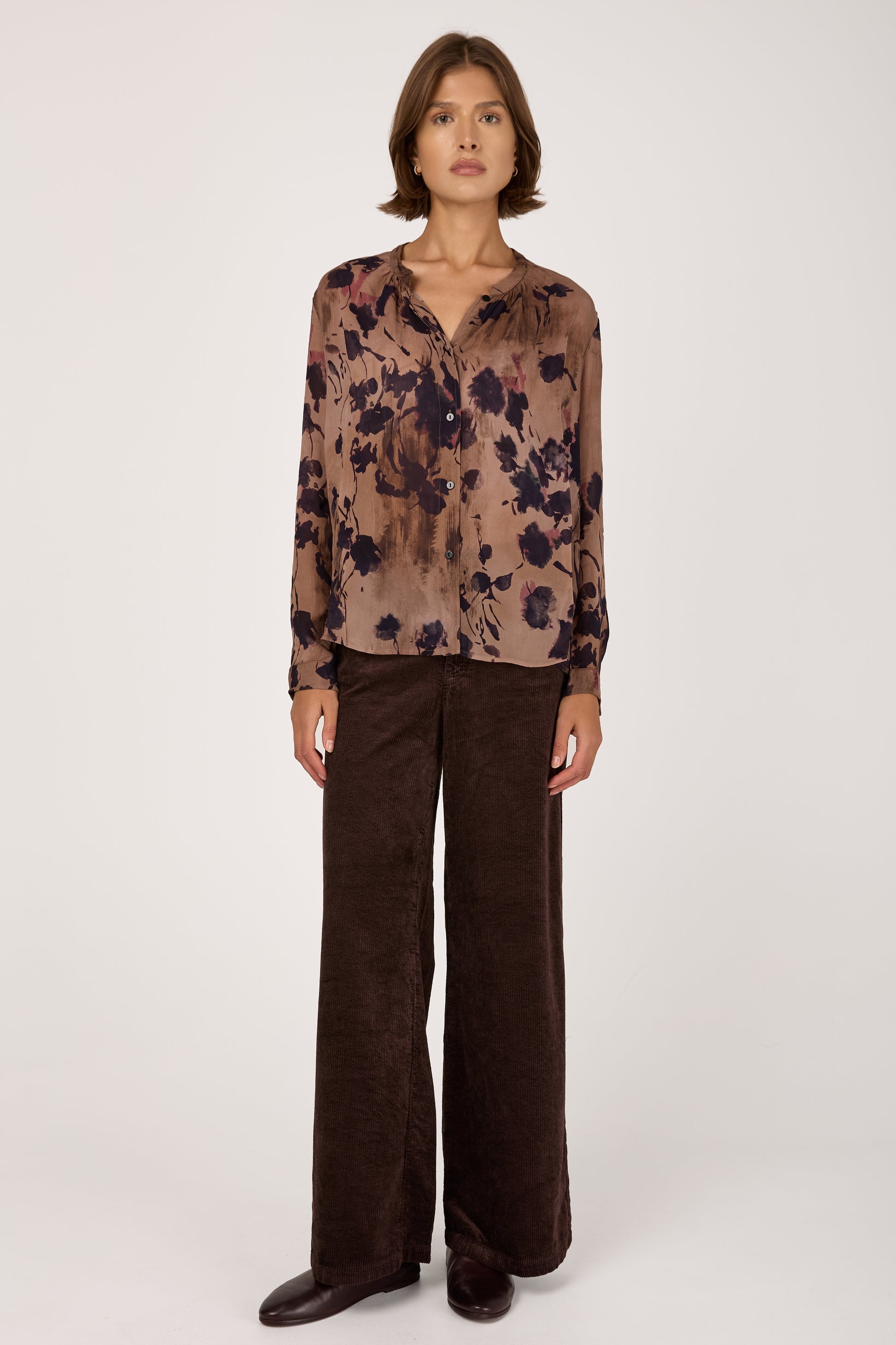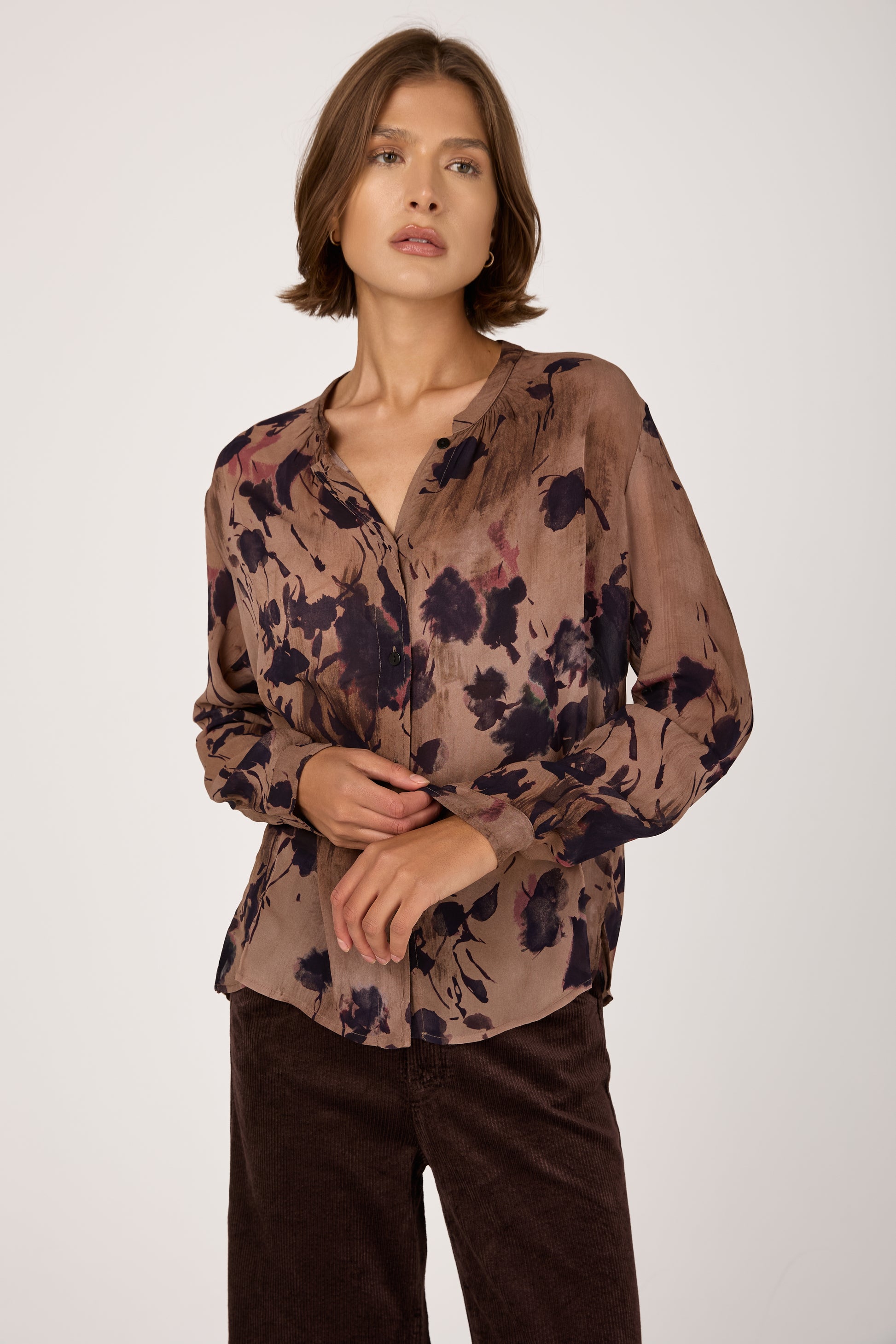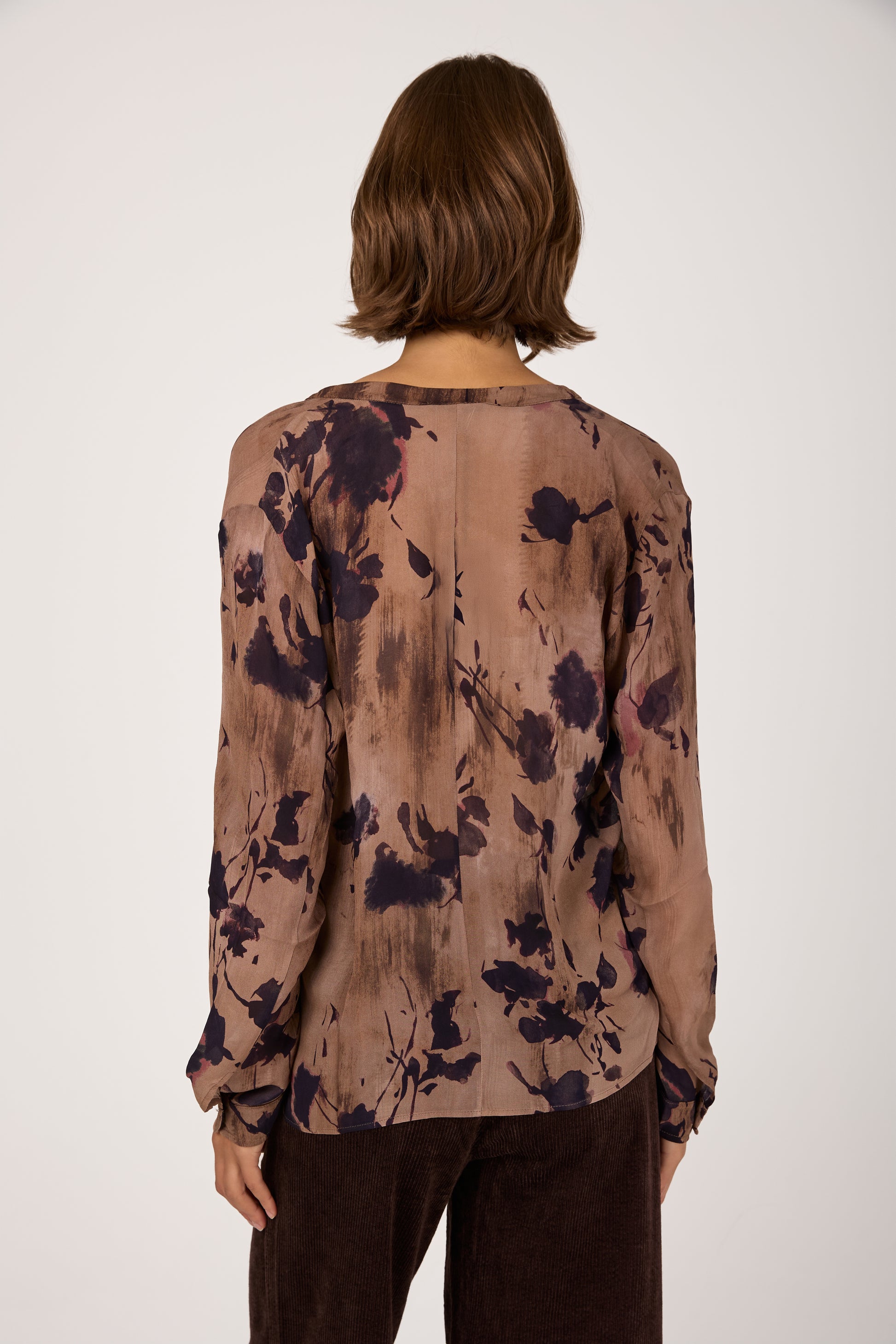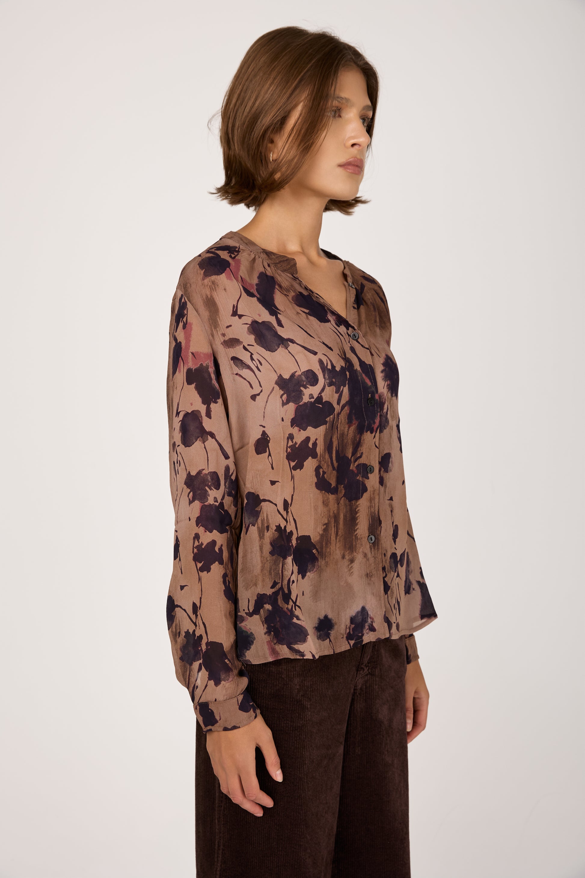 The TRANSIT Printed Viscose Georgette Shirt in Merlot exudes effortless elegance with its relaxed silhouette. Crafted in Italy from a soft, flowing printed viscose georgette in a deep merlot hue, it features a refined mandarin collar and subtle gathering beneath the collar, creating a graceful, tailored finish. The look is completed with classic buttoned cuffs for a touch of timeless sophistication.
