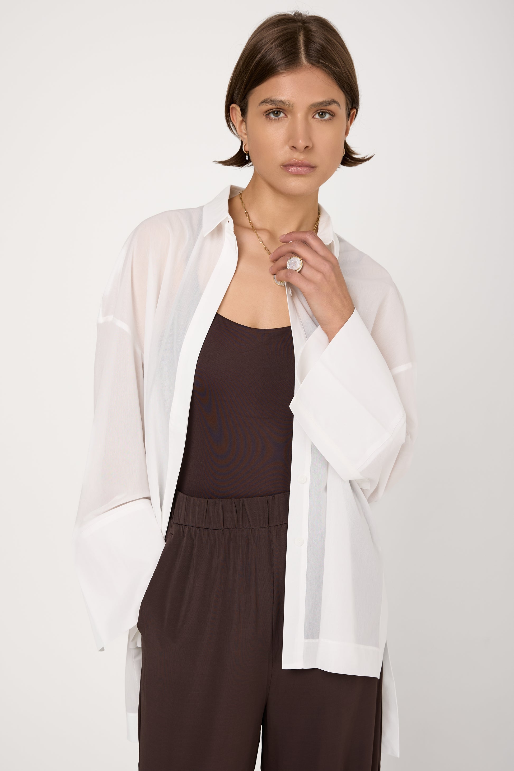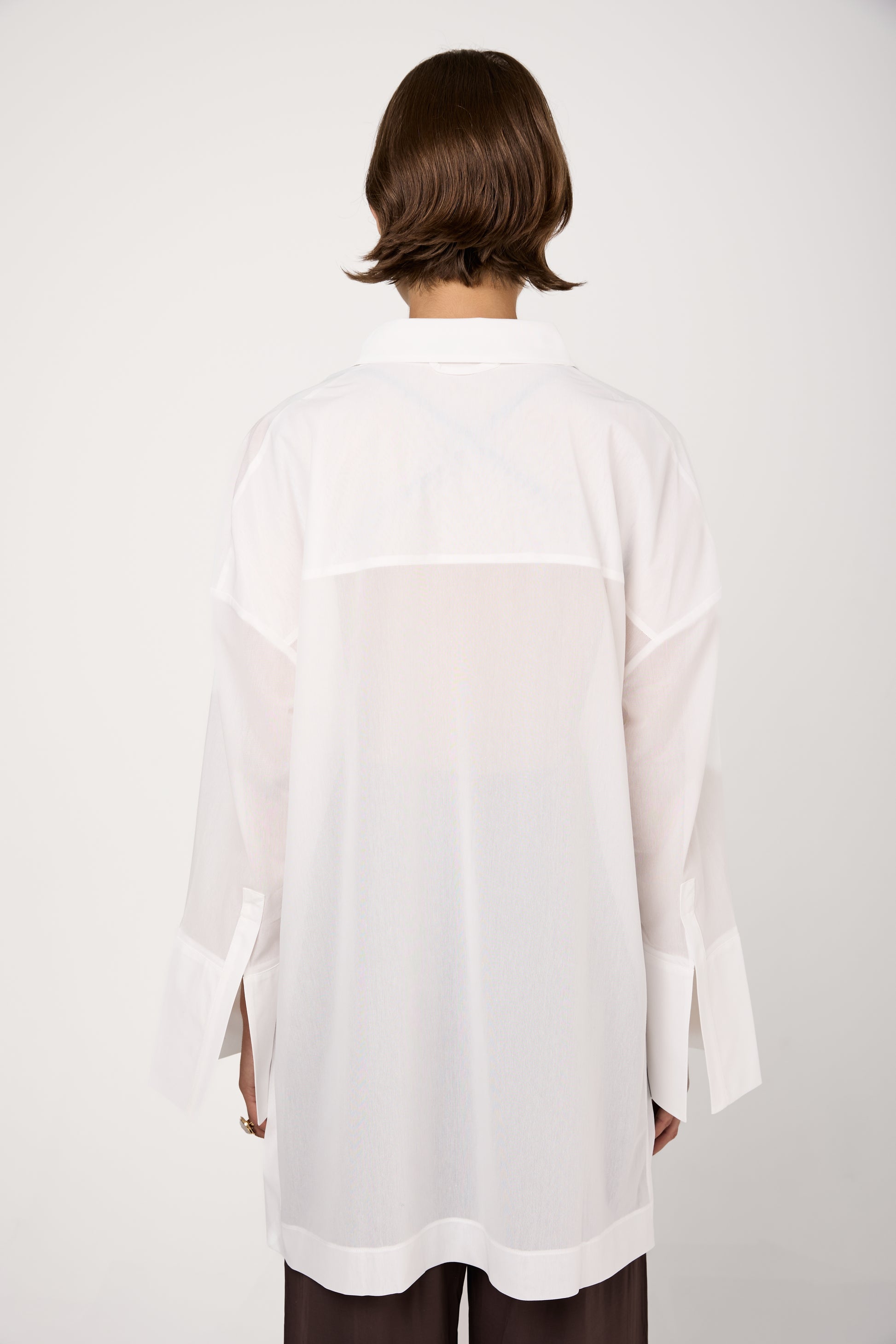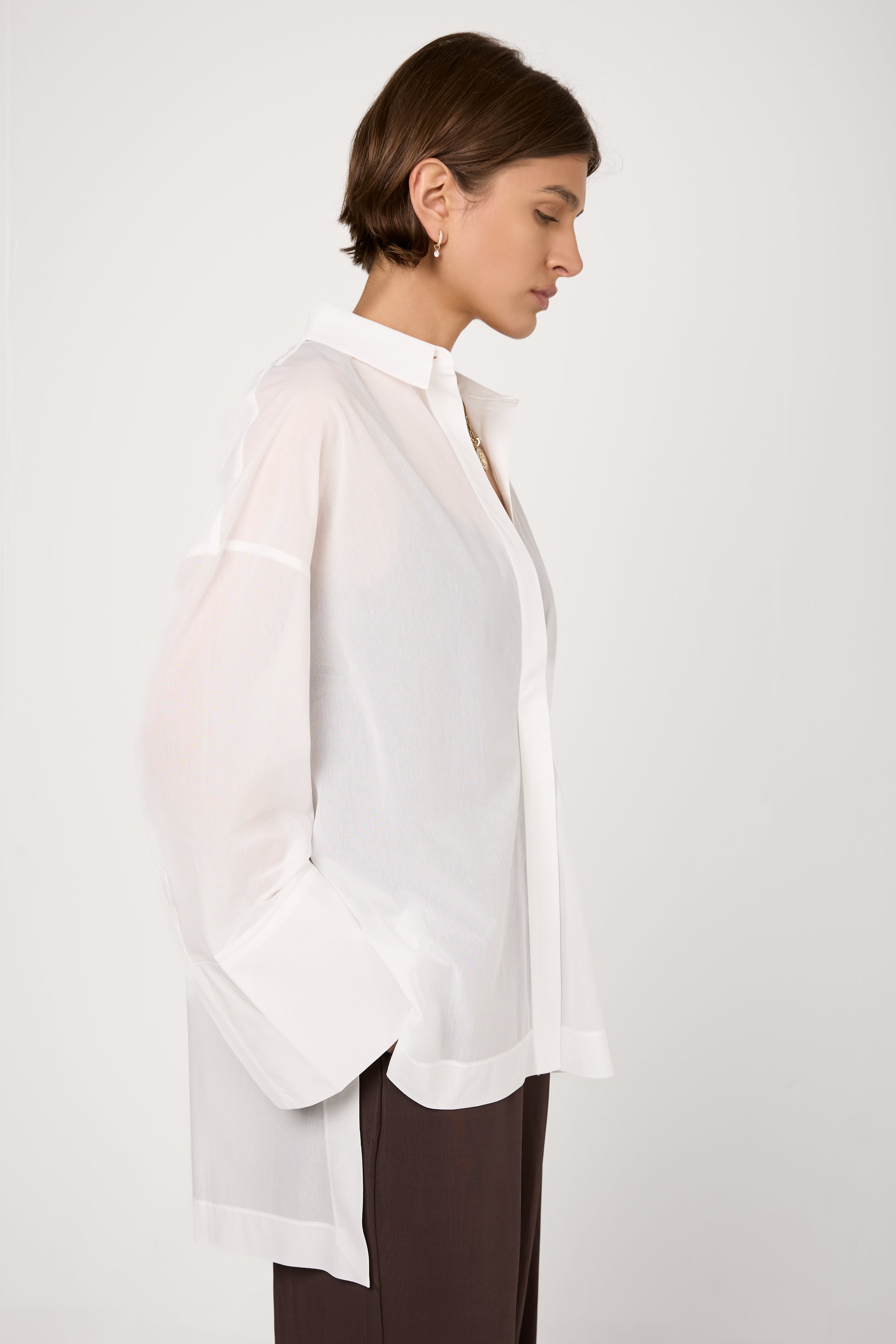 The MAX MARA Sedan Button-Neck Shirt in White is crafted from a lightweight jersey voile blend, ensuring a soft and breathable feel. It features a structured collar, a hidden button closure and long sleeves with fitted cuffs for a sleek finish.