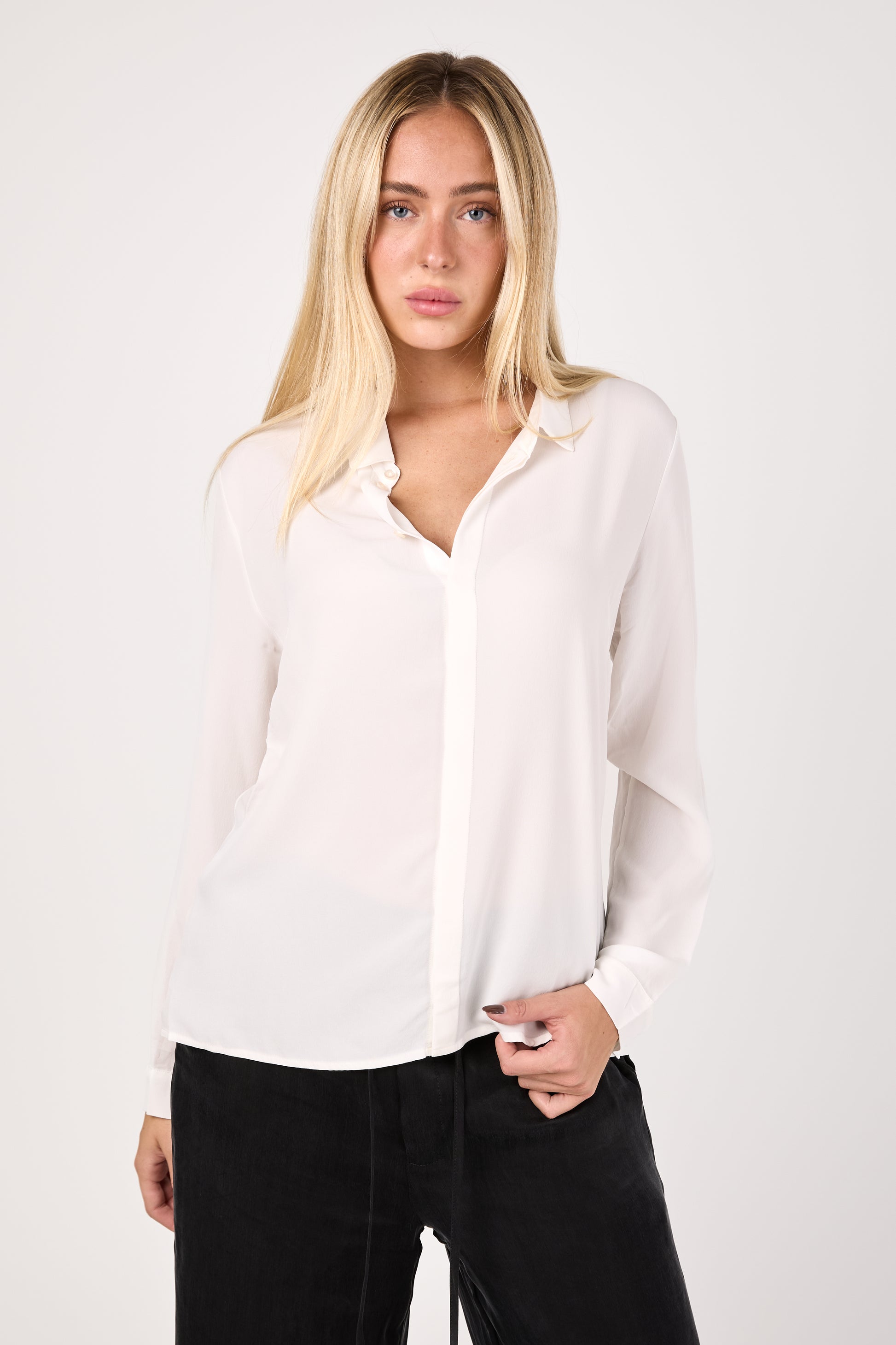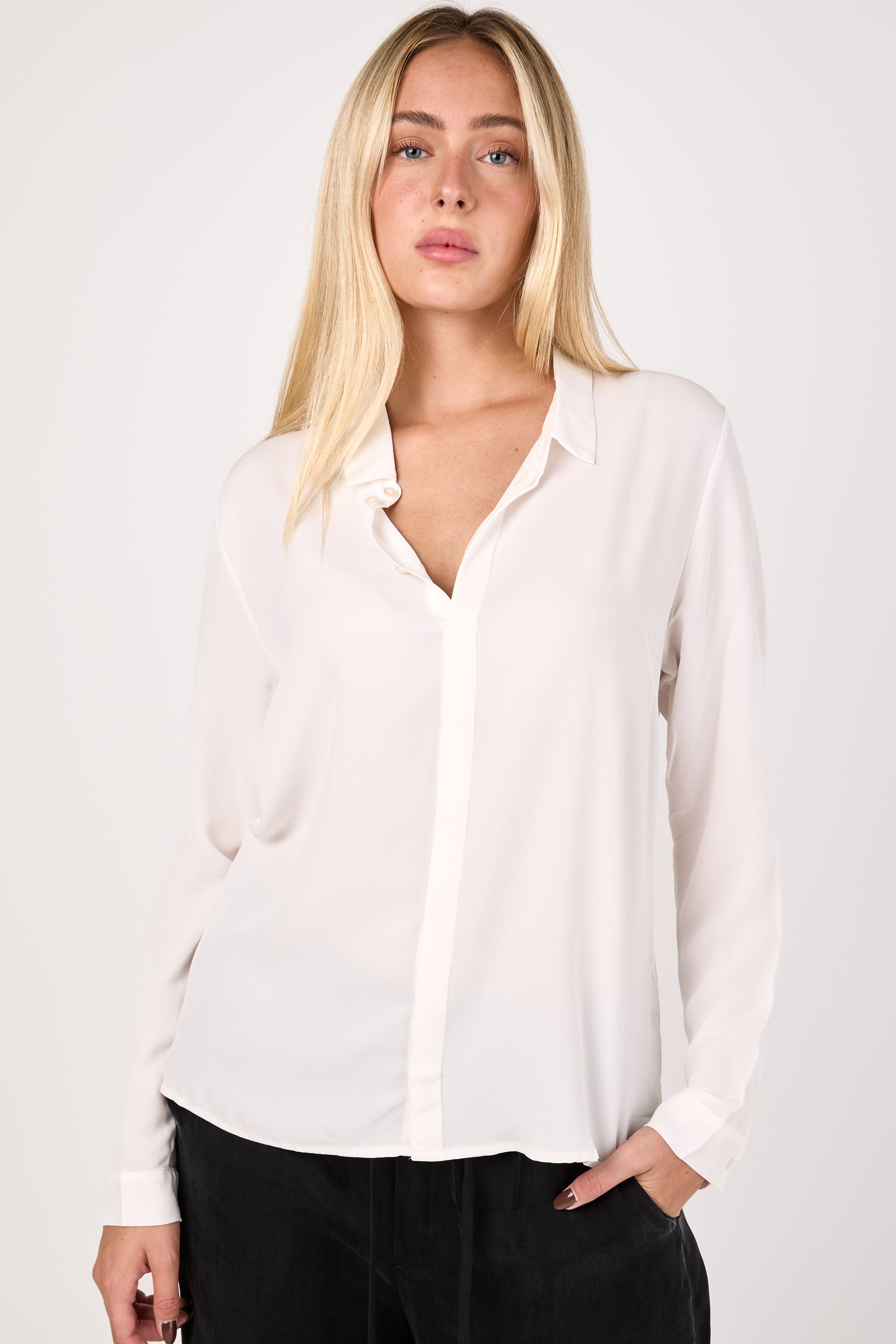 PRIVATE 0204 Silk Button Down Shirt in White. The epitome of elegance crafted from 100% pure silk. Luxurious shirt featuring a flattering V-neck and long sleeves. Perfect for any occasion adding a touch of sophistication to any wardrobe.