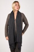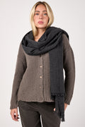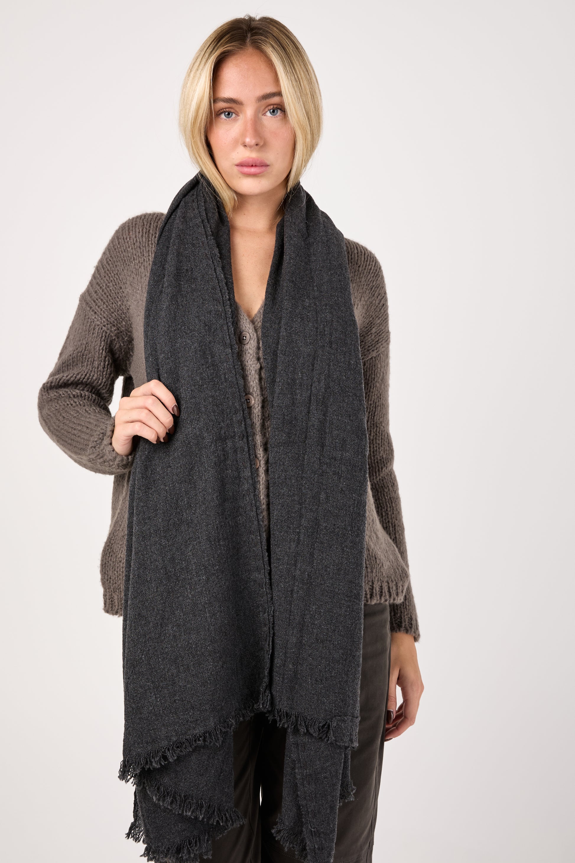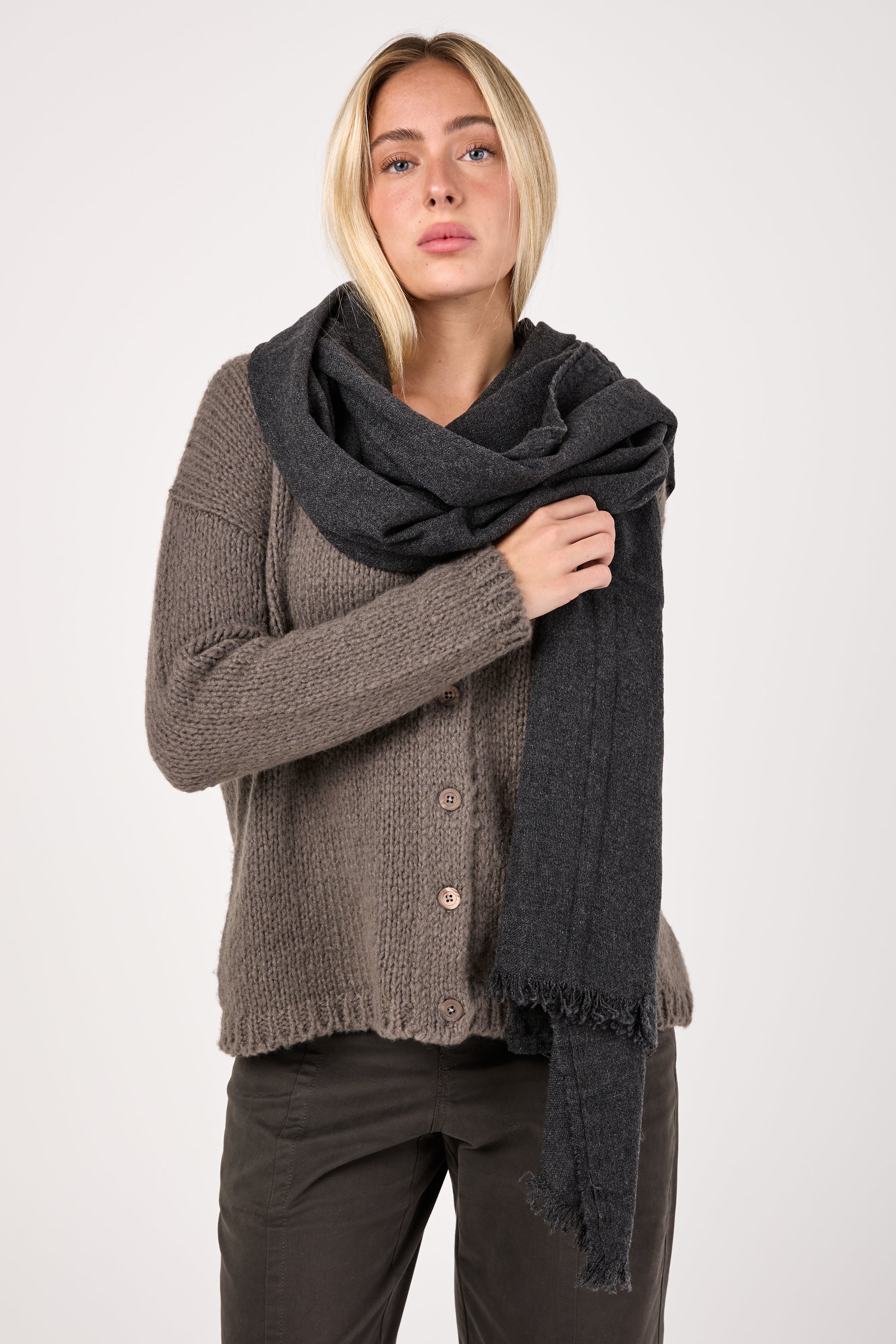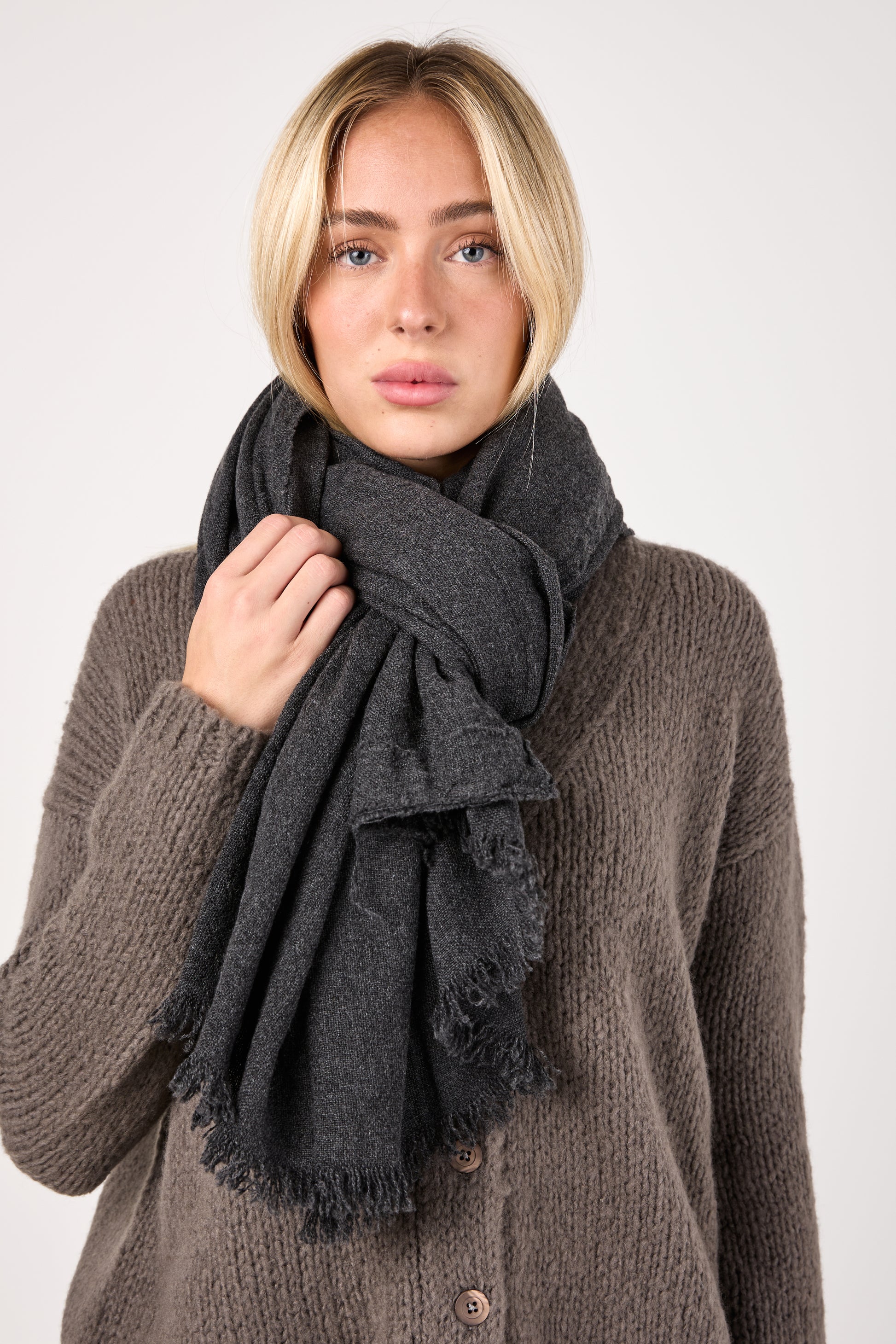 PRIVATE 0204 Sim Cashmere Scarf in Coal. Versatile and classic, can be wrapped as a scarf or draped over the shoulders as a shawl. Cut in a lavish size and crafted from super soft, pure and organic cashmere. Finished using Italian artisanal skills and a traditional "slow cashmere" process, using vintage looms at family-owned mills located at the base of the Alps, in Northern Italy.