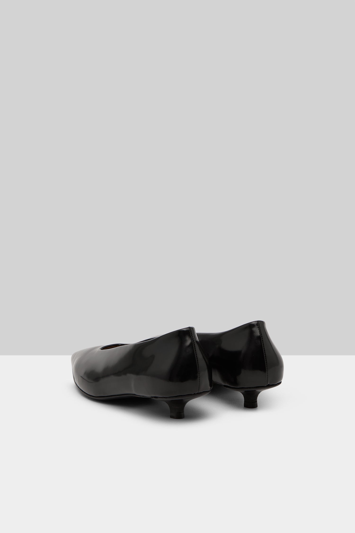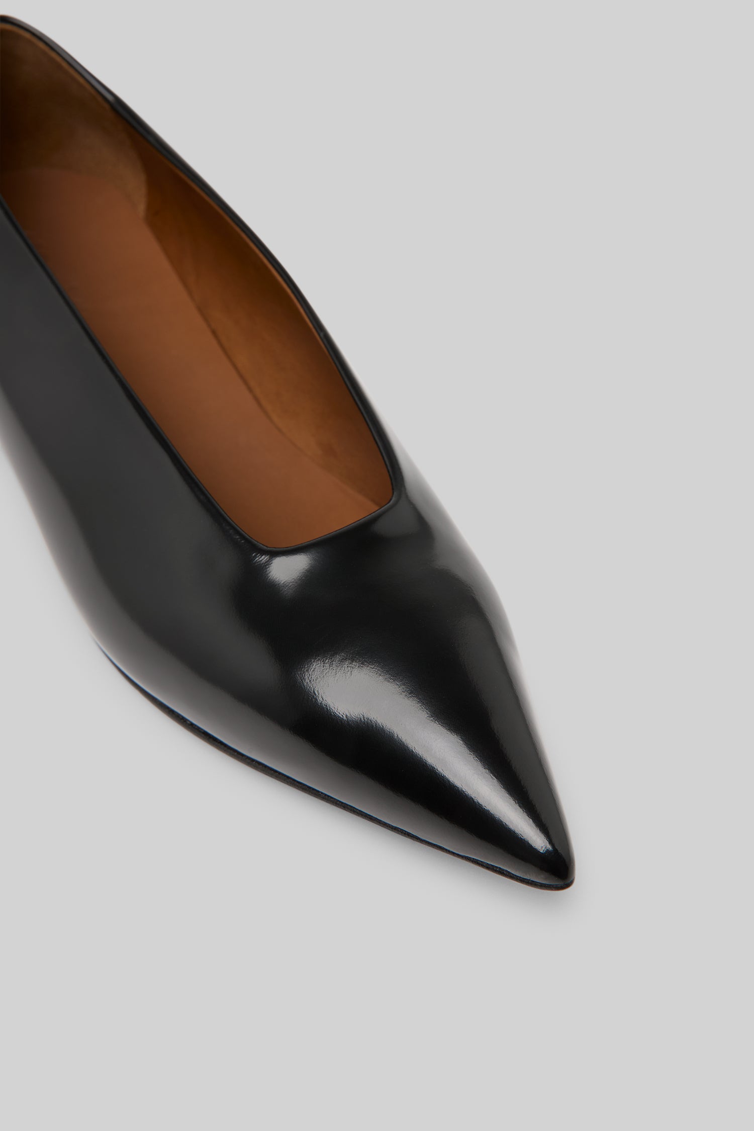 The MARSÈLL Spino Matte Patent Leather Pump in Black embodies timeless femininity through a sleek, tapered silhouette. Crafted in Italy from matte patent leather, it features a pointed décolleté and a sculptural, leather-covered stiletto heel. The minimalist sole accentuates the fluid, elegant profile, creating a refined expression of modern sophistication.