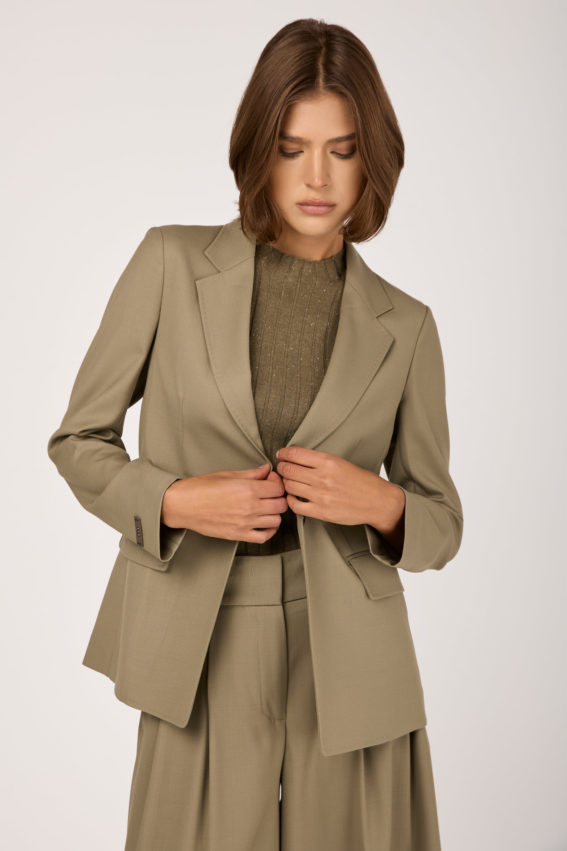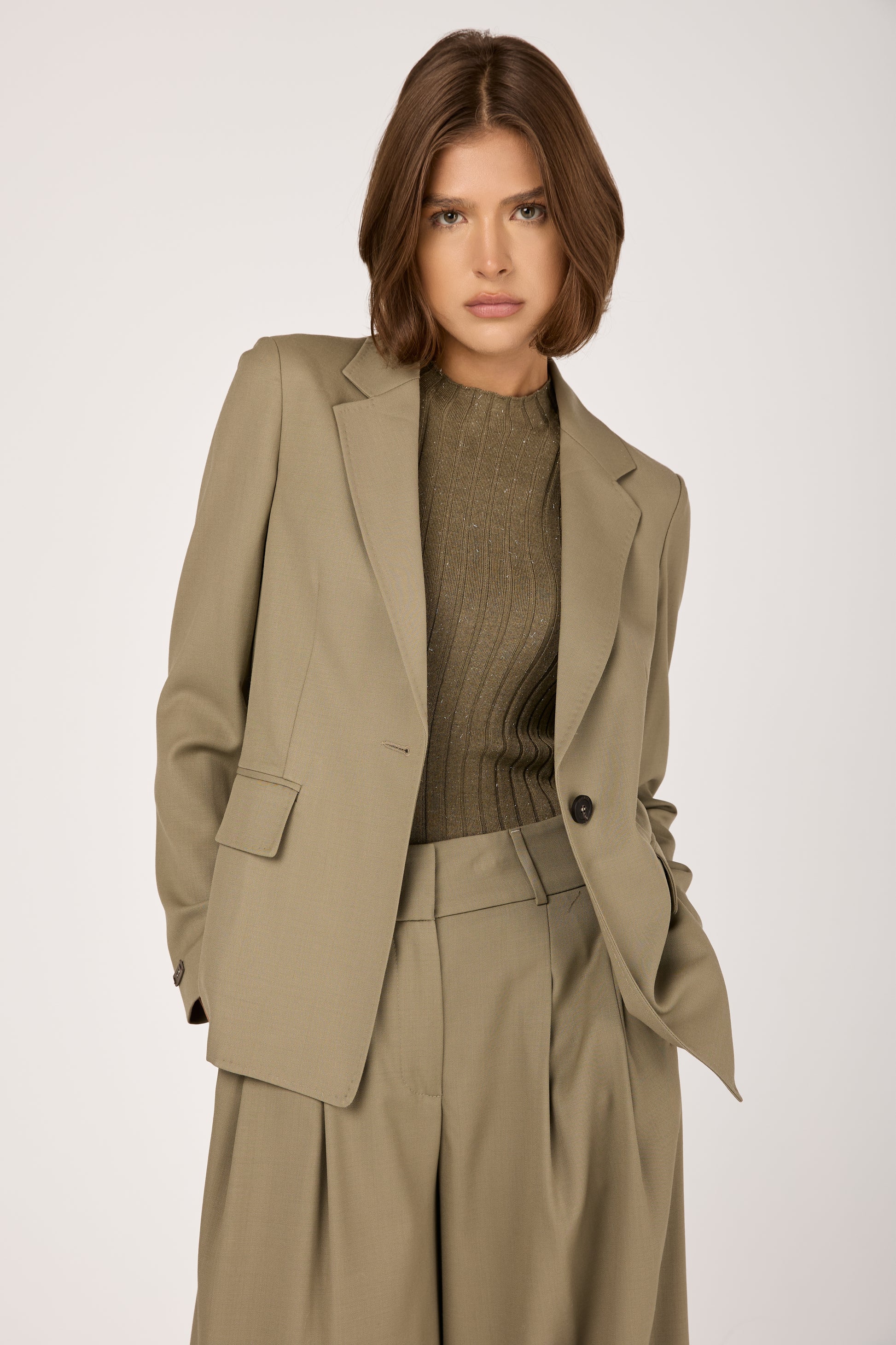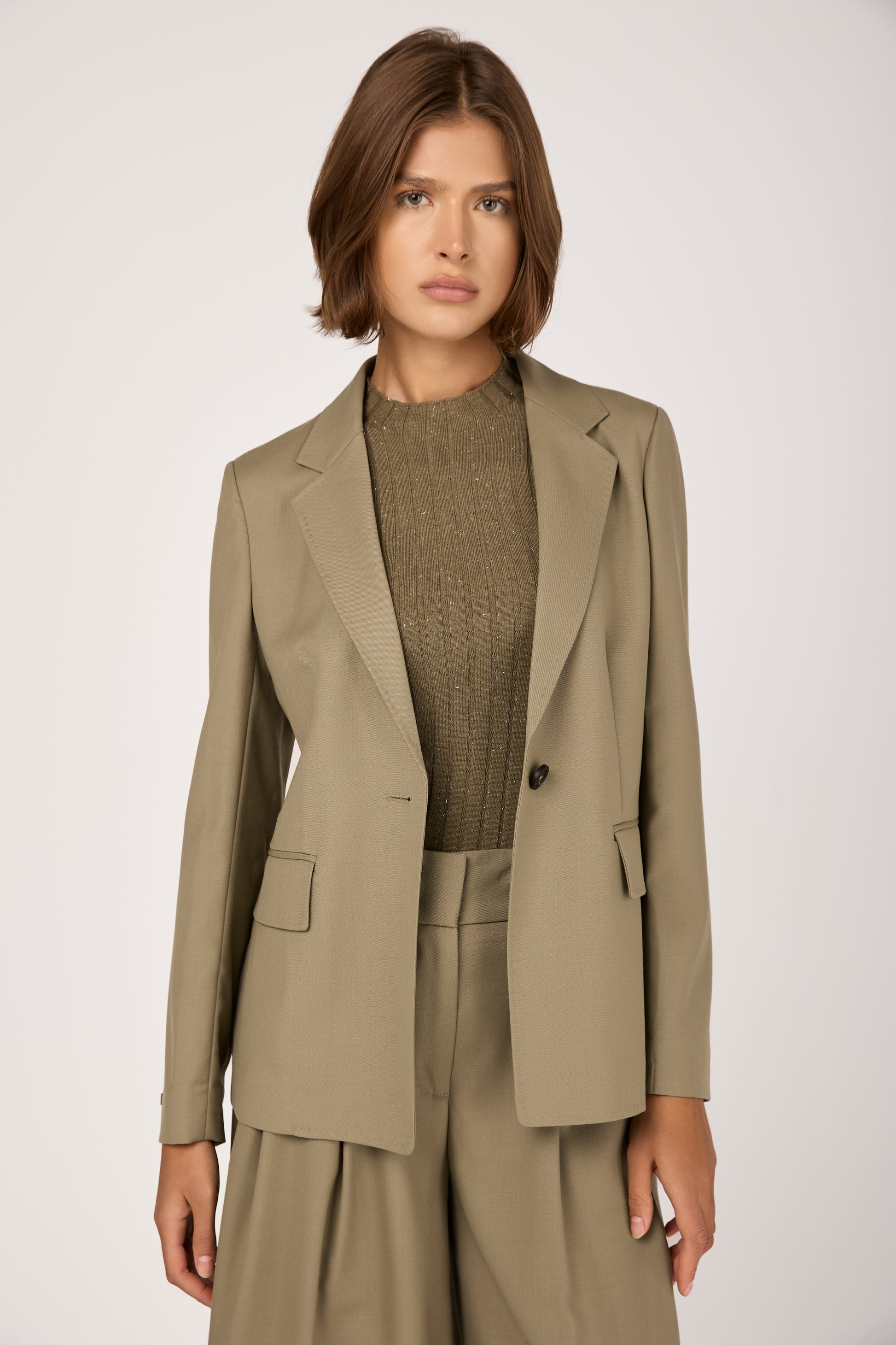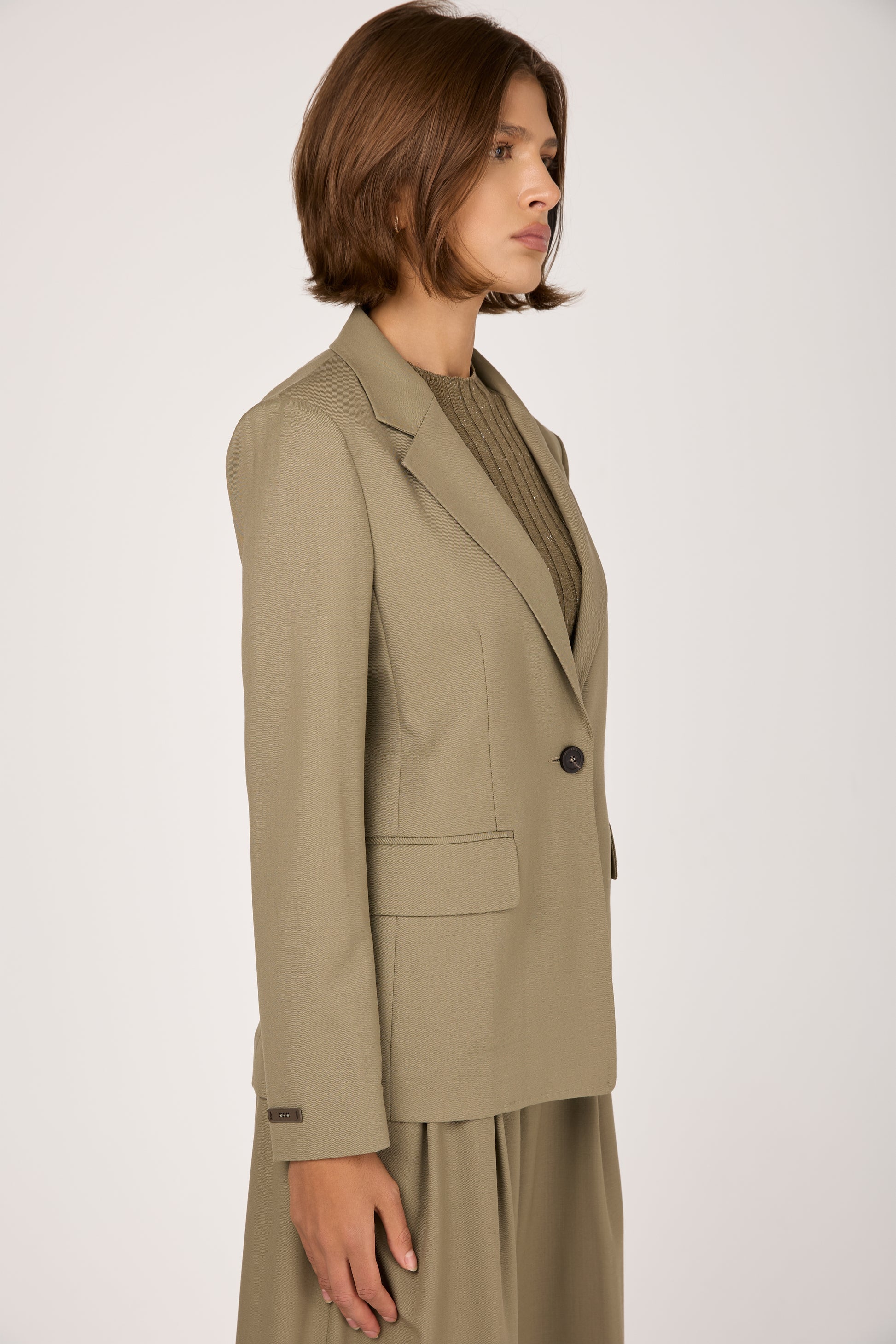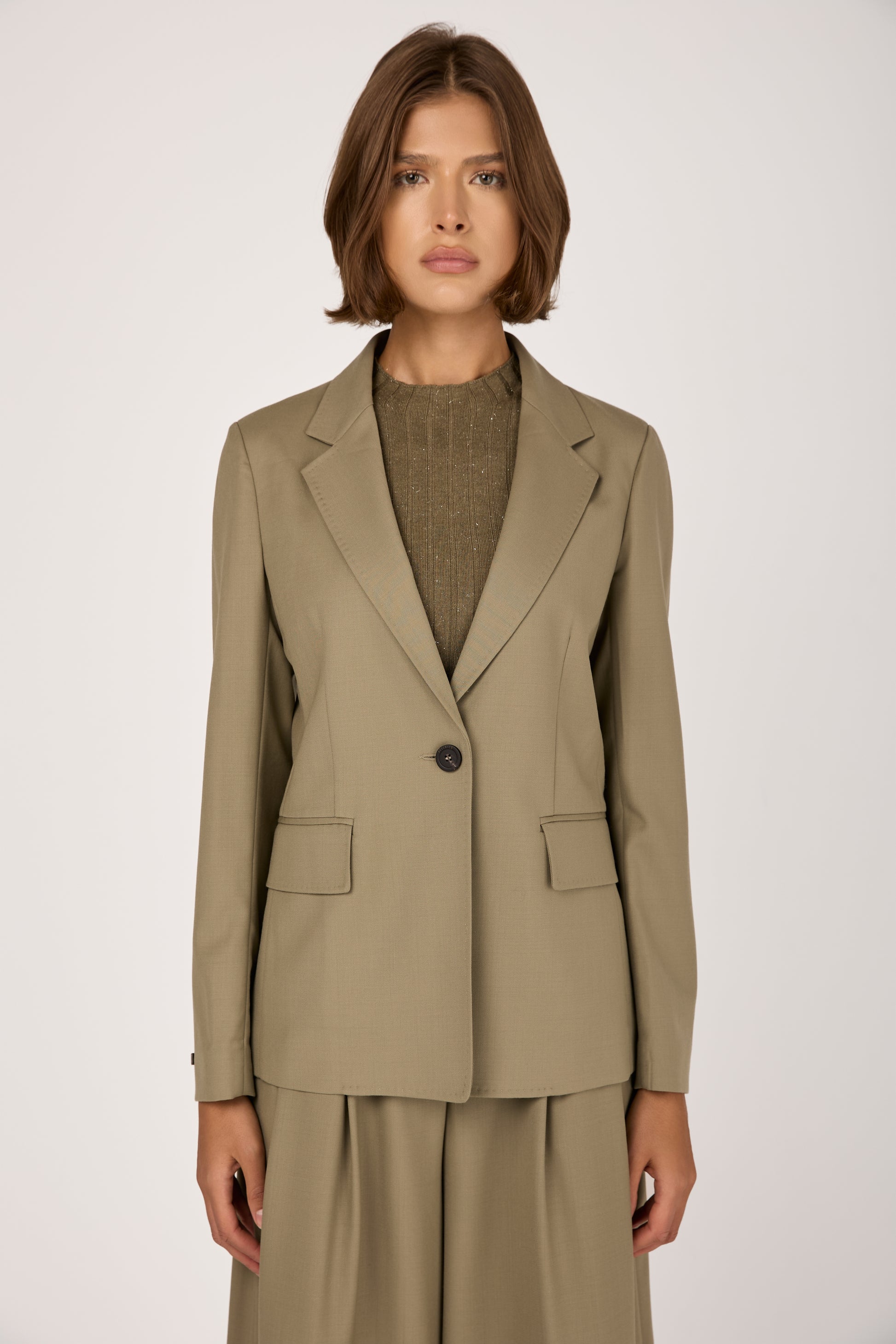 The PESERICO Fluid Wool Twill Blazer Jacket in Clay Green is crafted in Italy from luxurious silky twill and wool. Designed to drape gracefully, it flatters the silhouette with soft, feminine lines. The single-button closure and tailored cut create a timeless, versatile shape. Soft yet structured, it transitions effortlessly from day to evening. A modern essential that embodies quiet luxury and impeccable craftsmanship.