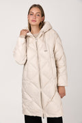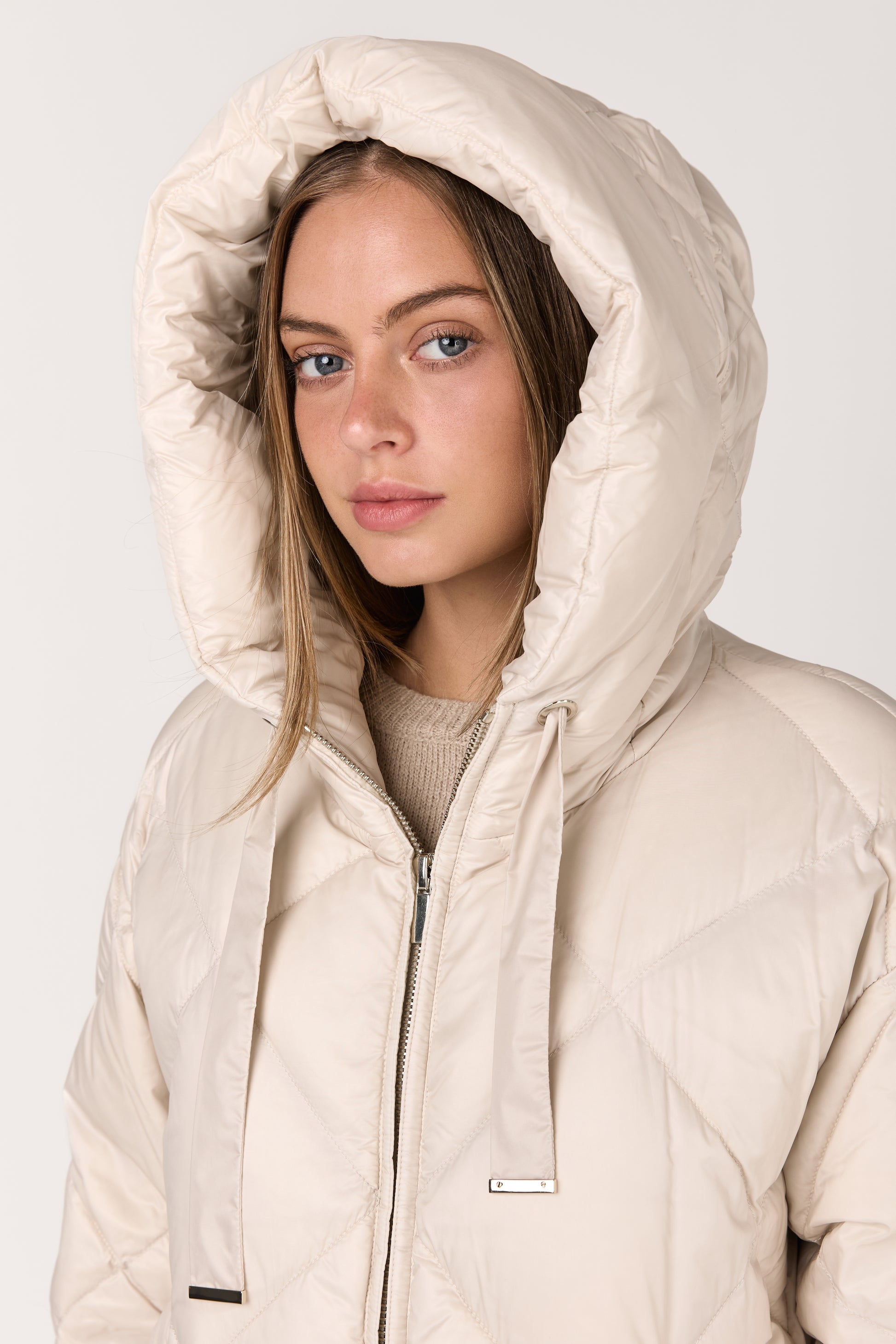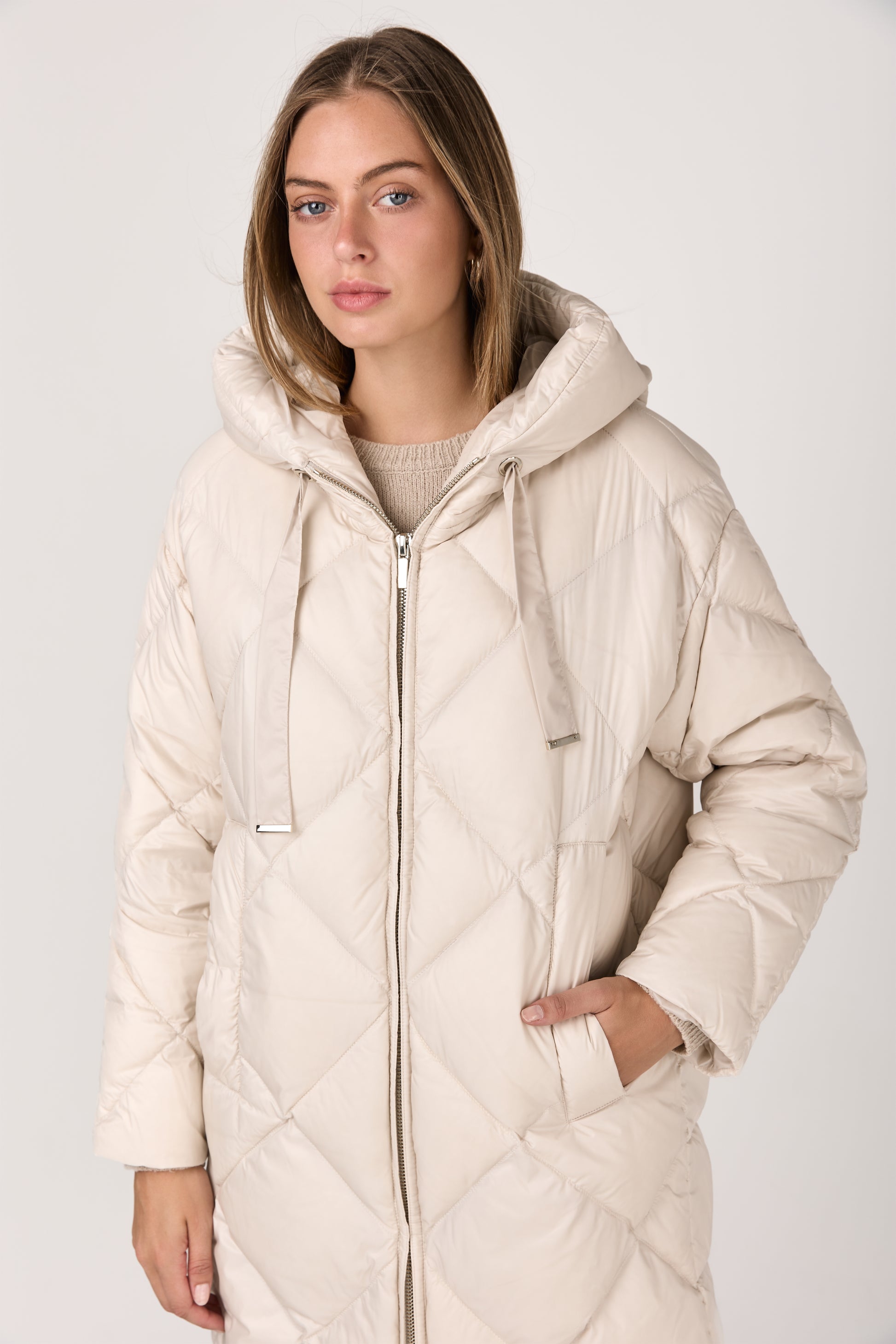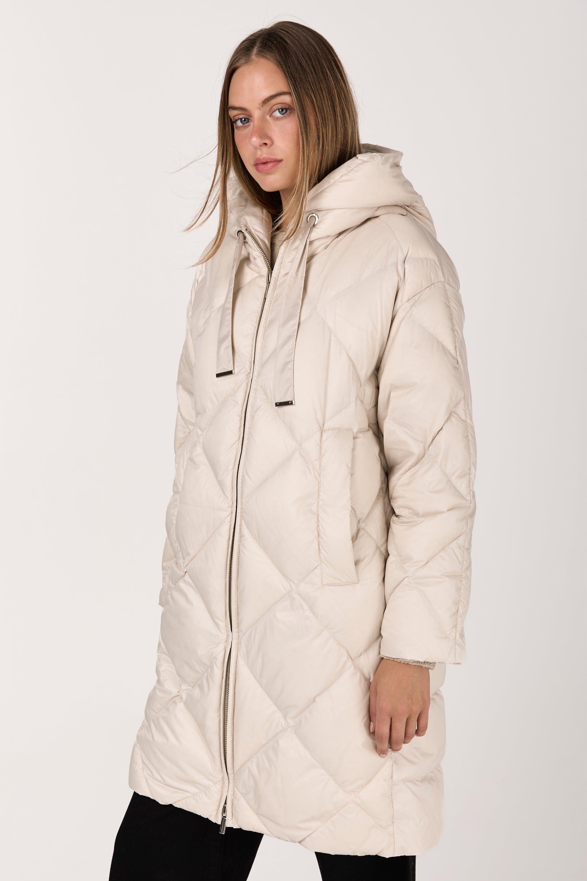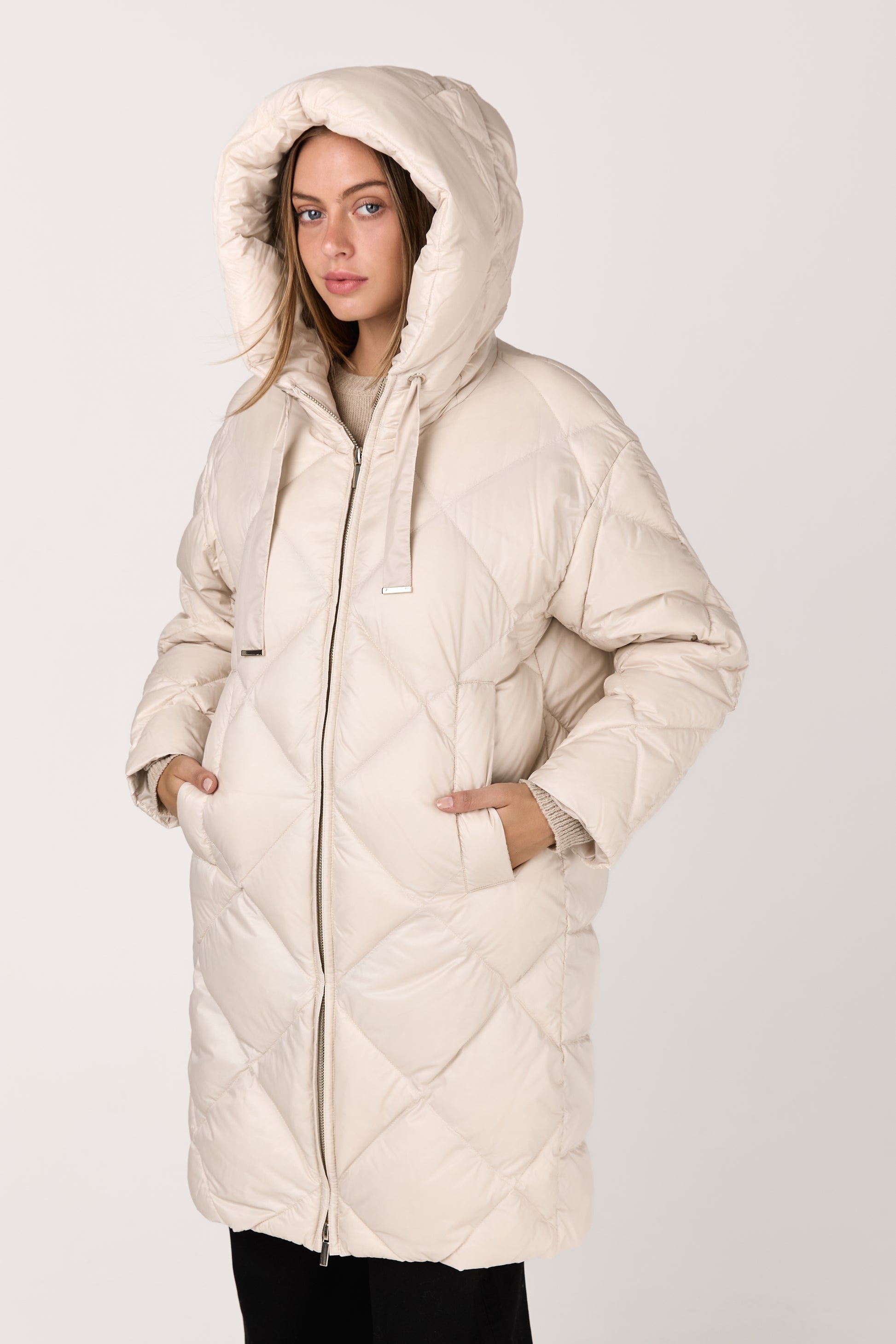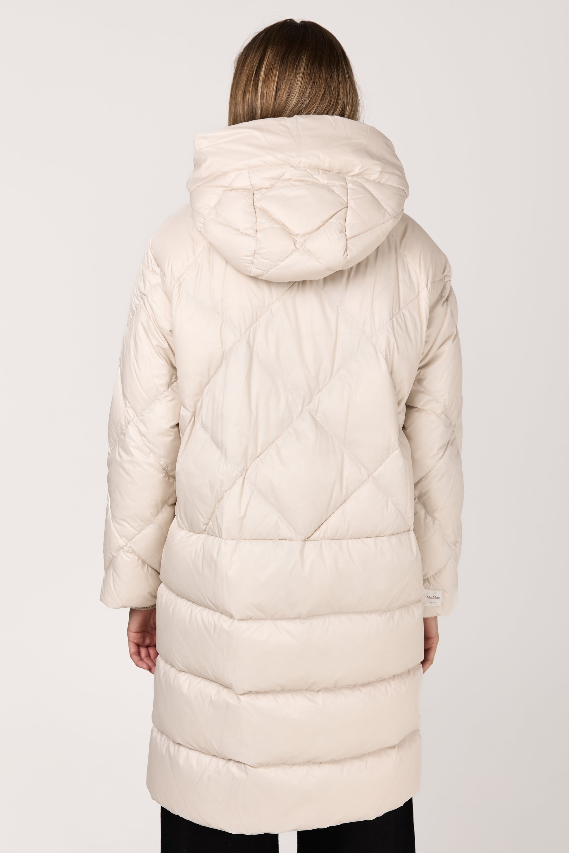 The MAX MARA THE CUBE Trefe Puffer Coat in Milk is crafted from water-repellent iridescent nylon canvas. This straight midi jacket features an all-over quilted diamond pattern and a subtle horizontal stripe detail at the back hem for a contemporary finish. Filled with premium virgin goose down, it provides exceptional insulation while maintaining a sleek silhouette. Desgined with a double-slider front zip, low set sleeves, welt side pockets and a drawstring hood, this coat combines practicality with refined style, perfect for city dressing or weekend layering.