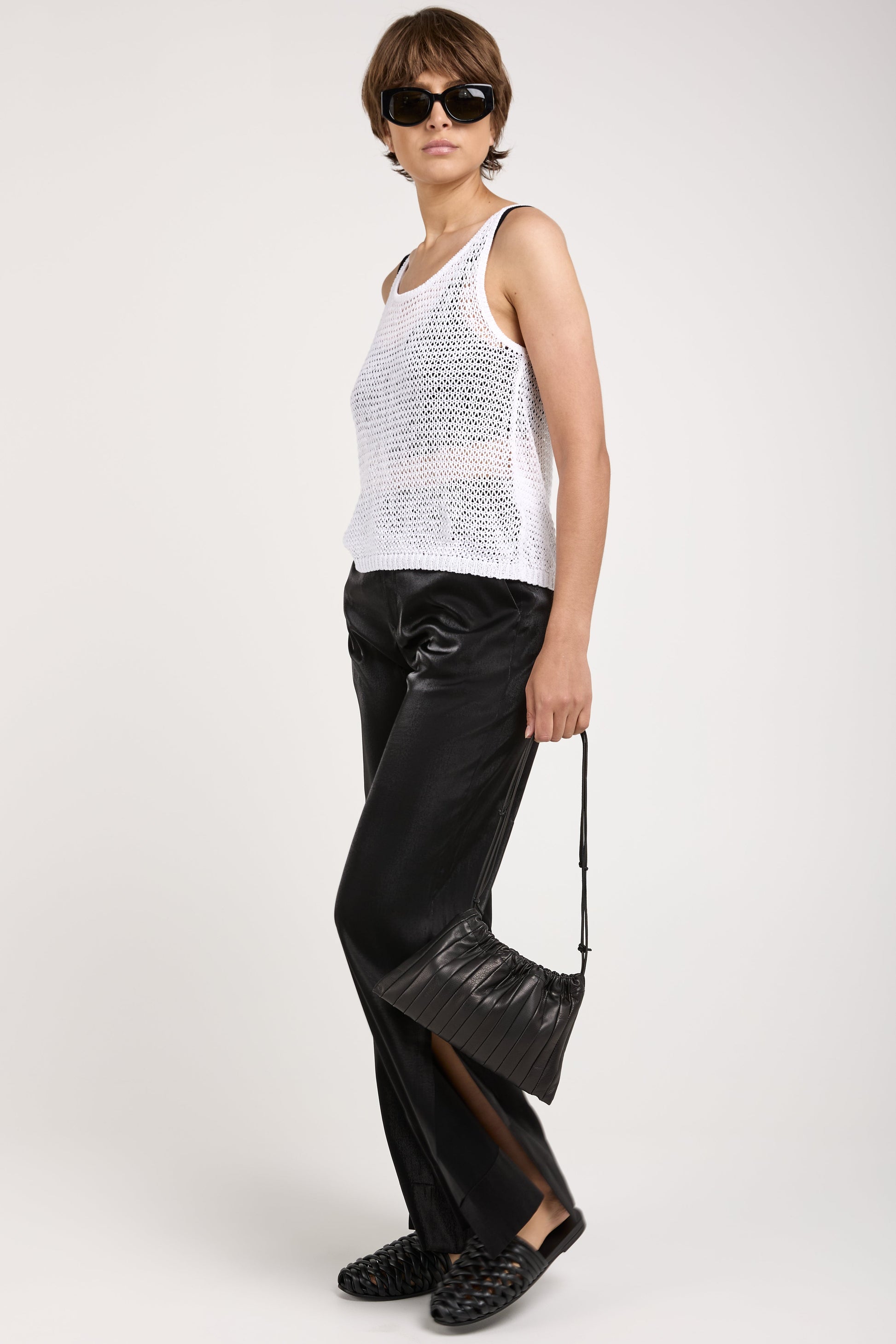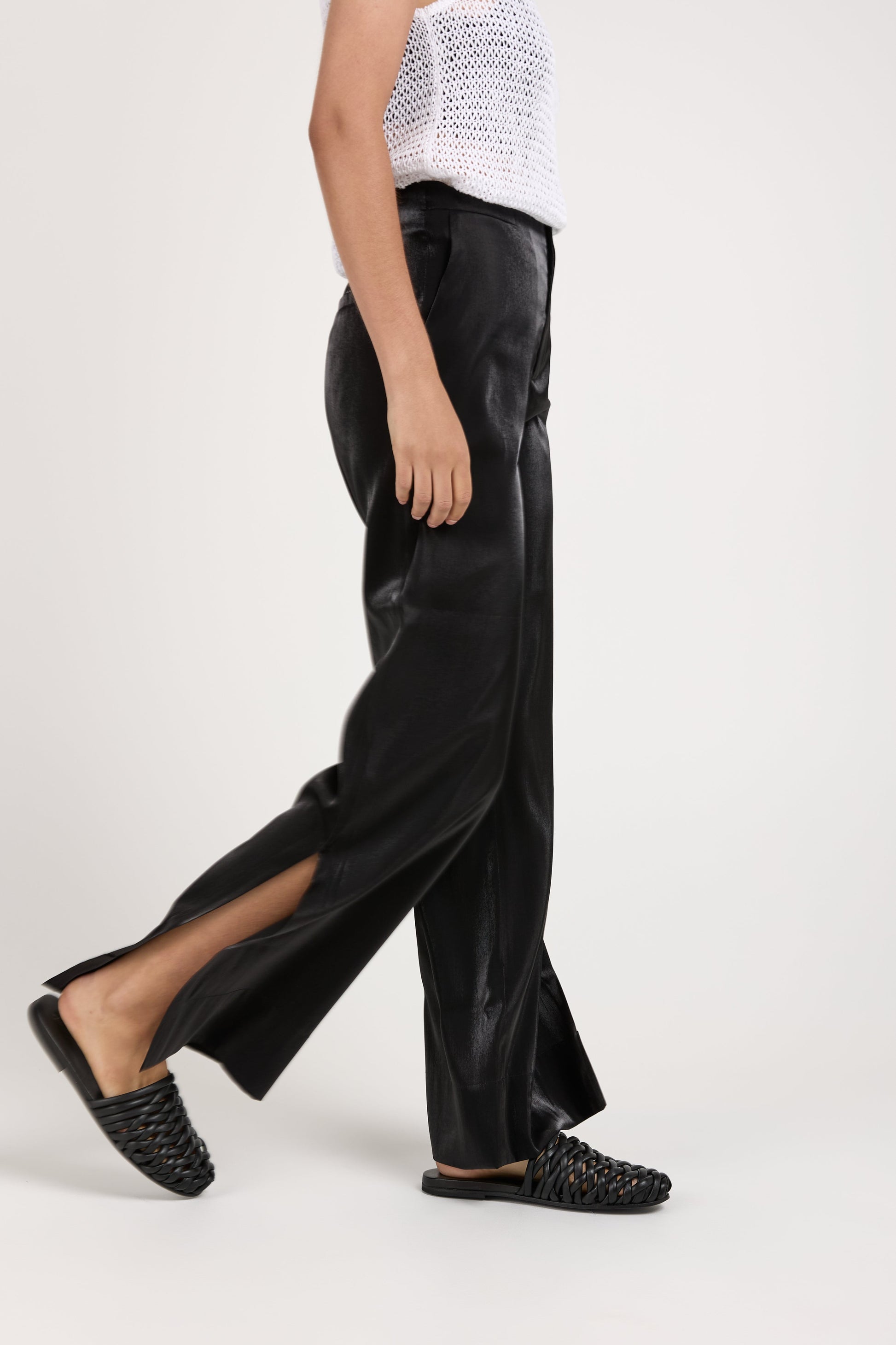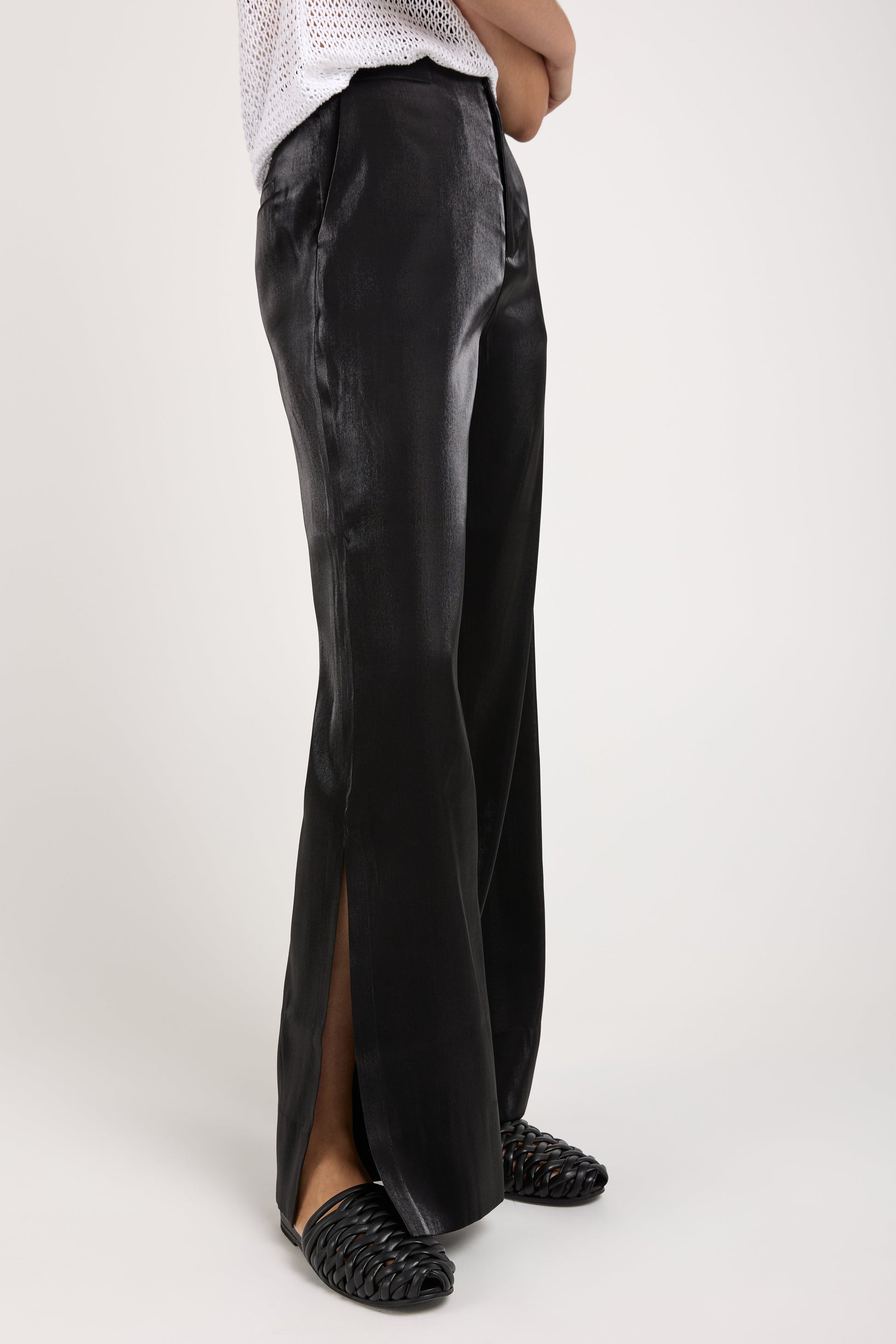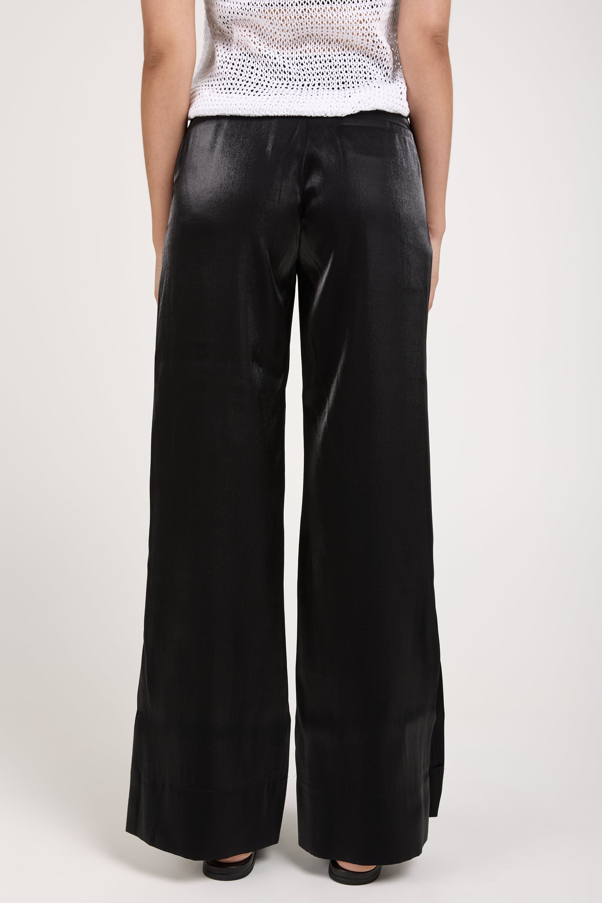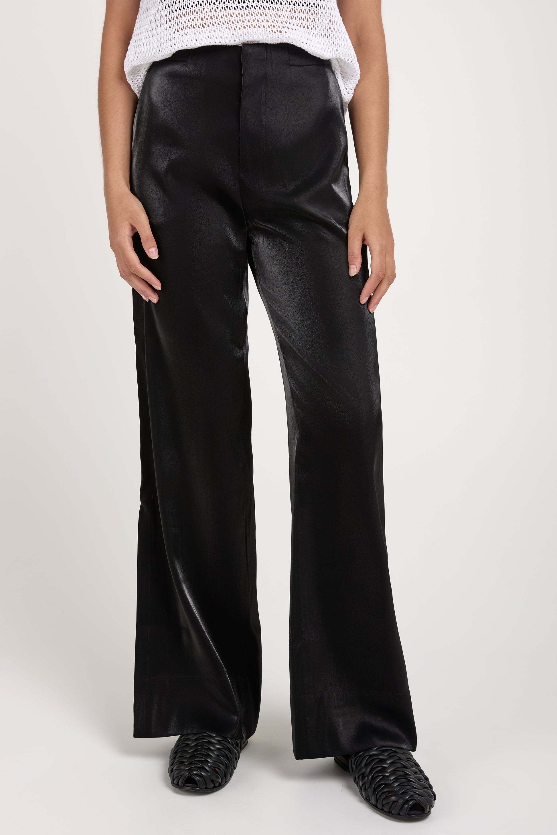 The AERON Vapor Viscose Pant in Black offers refined elegance with a relaxed fit and a luxurious satin sheen. Perfect for day-to-night transitions, these high-waisted, wide-leg pants add a touch of sophistication to any outfit, combining comfort and style effortlessly.