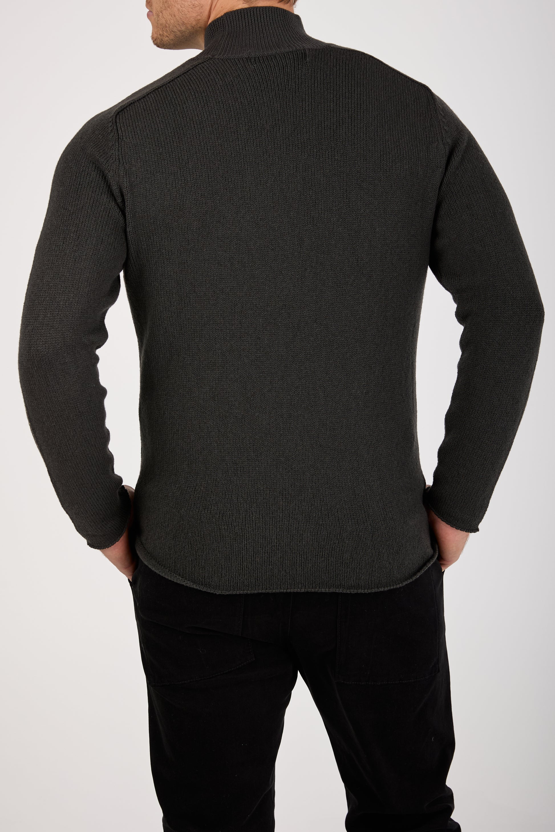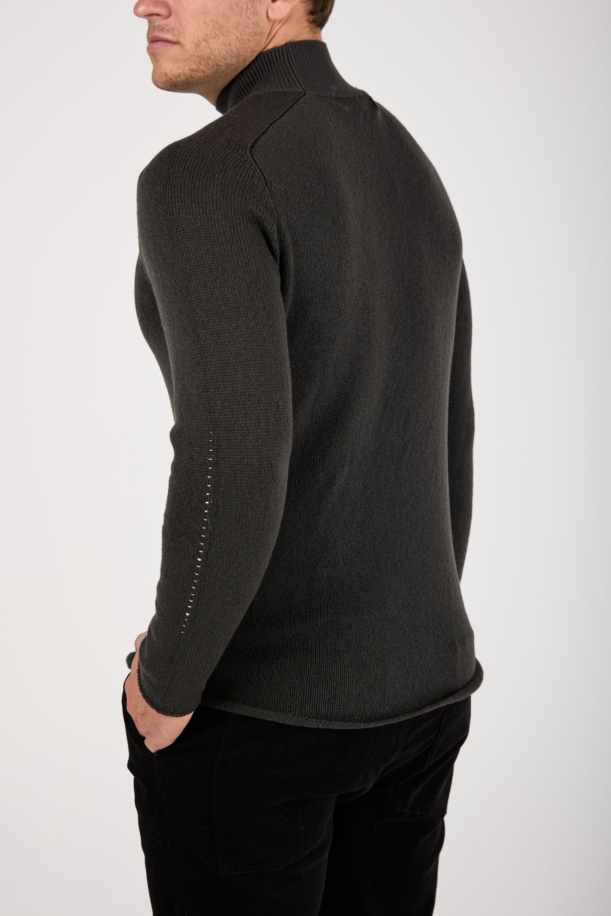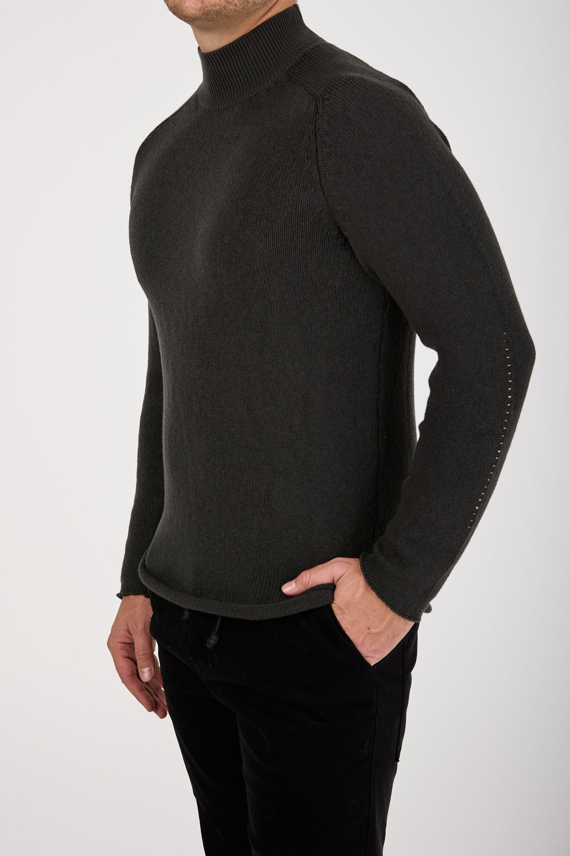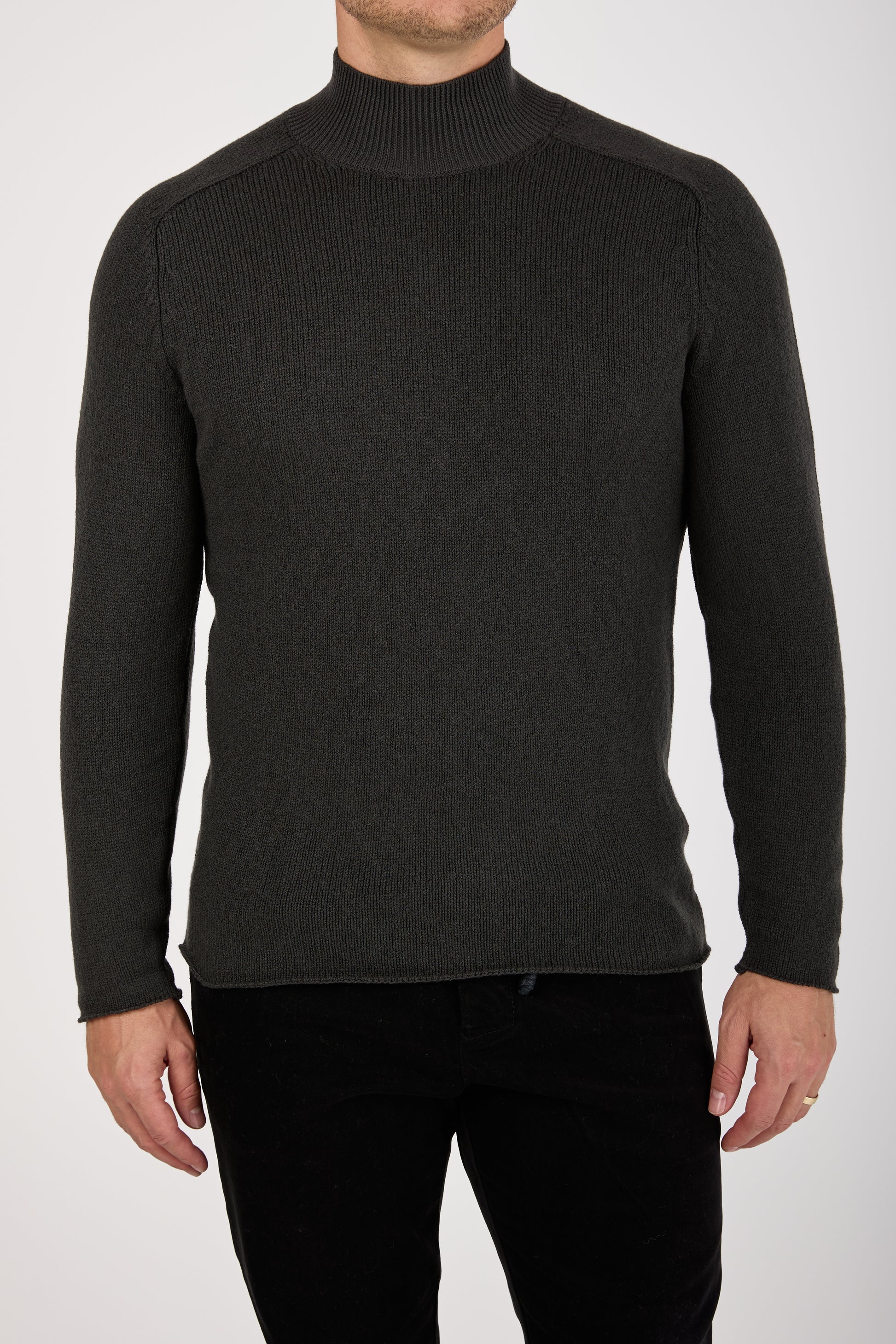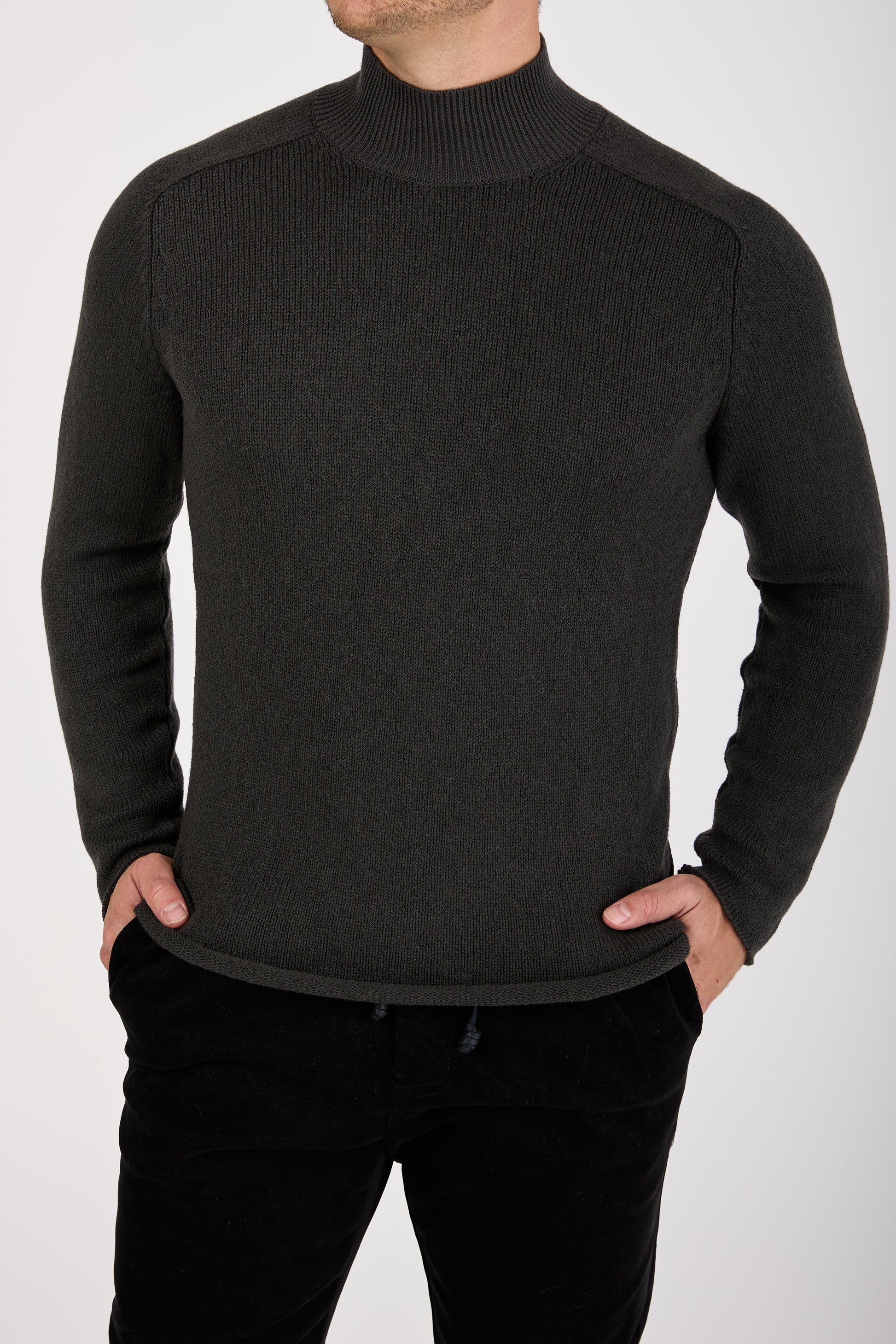 TRANSIT Virgin Wool Turtleneck Sweater in Mud. Turtleneck sweater crafted from super-soft virgin wool. Featuring contrasting cotton and linen yarn accents inspired by hand-stitched detailing. Designed with a ribbed collar, saddle shoulders and rolled hem and cuffs for a relaxed and refined look. Made in Italy.