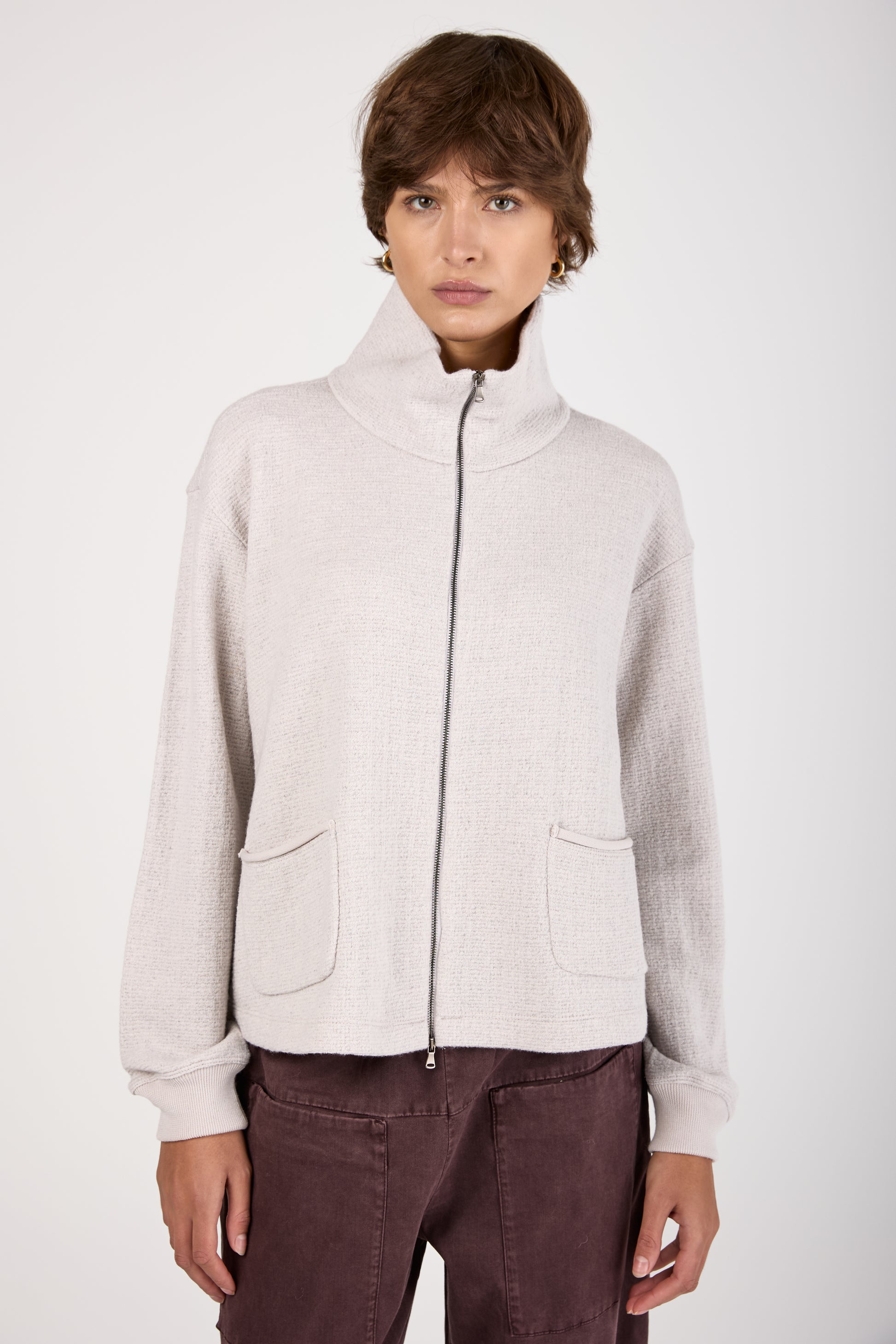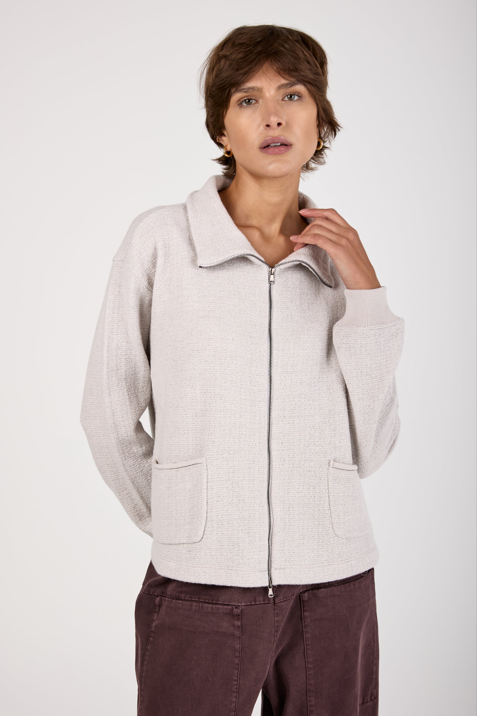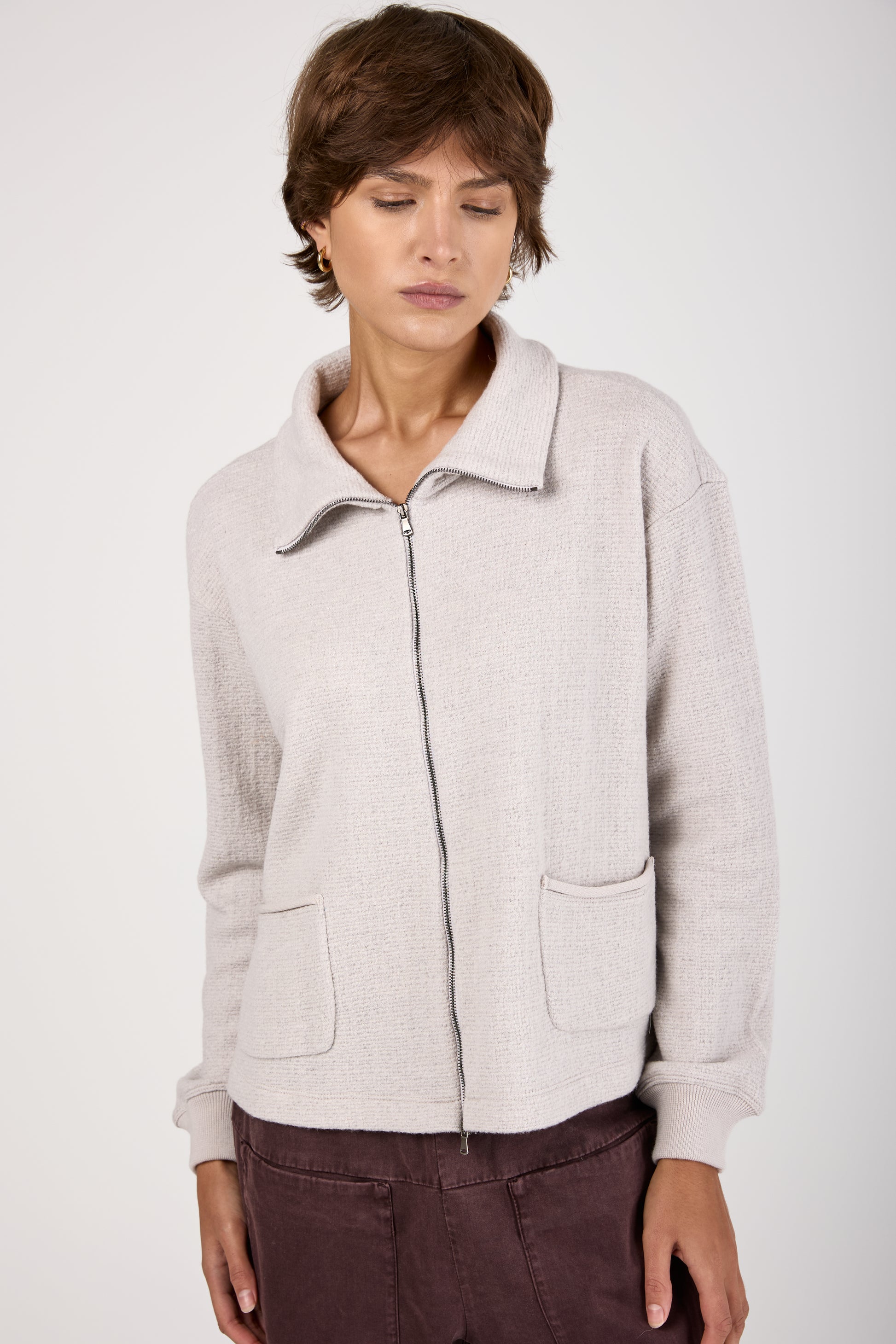 TRANSIT Wool Viscose Zipped Jacket in Ice. Wide jacket made of wool and viscose knit with jacquard micro-pattern. With a dropped shoulder style, patch pockets and wide sleeves closed by rib knit cuffs. Made in Italy.