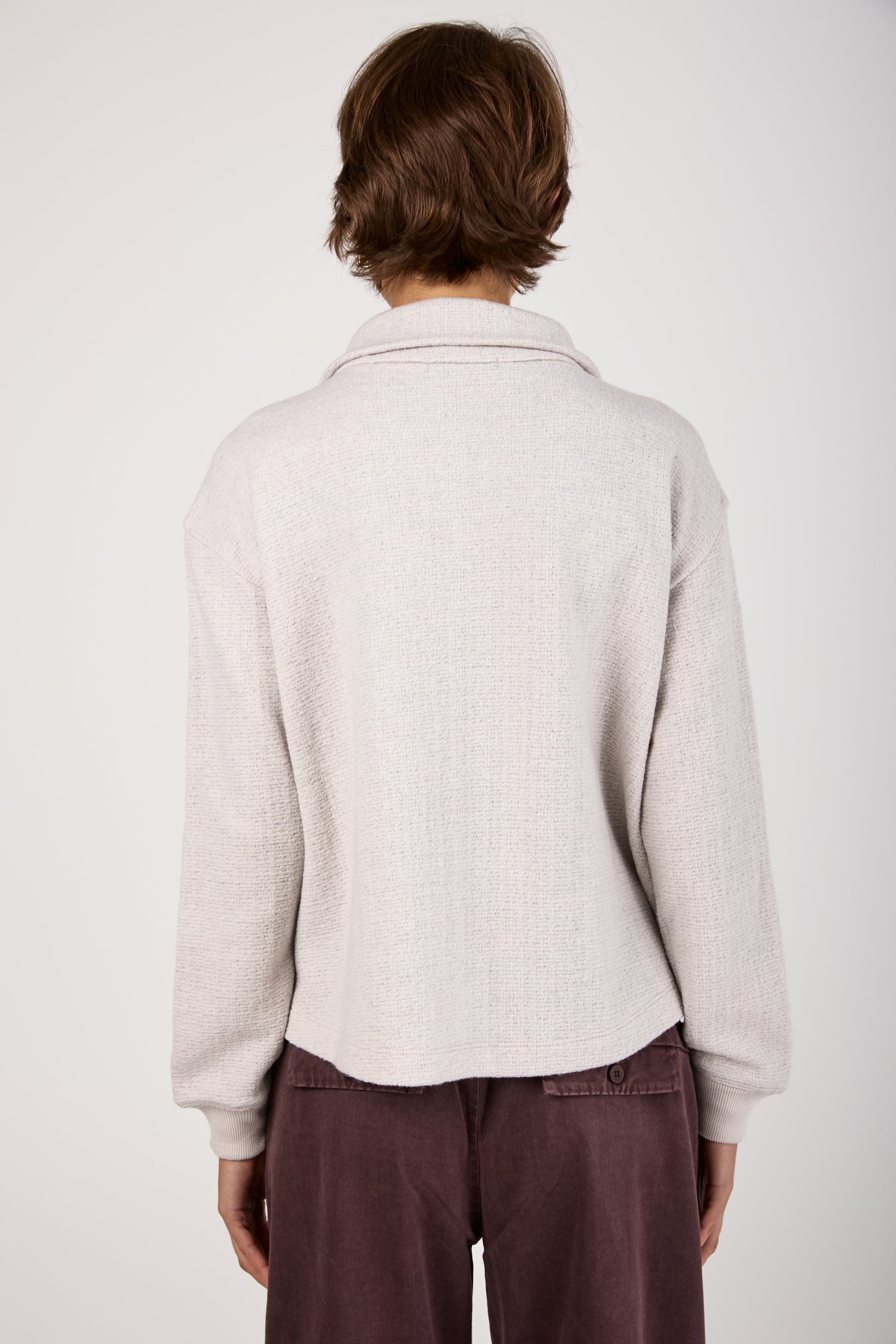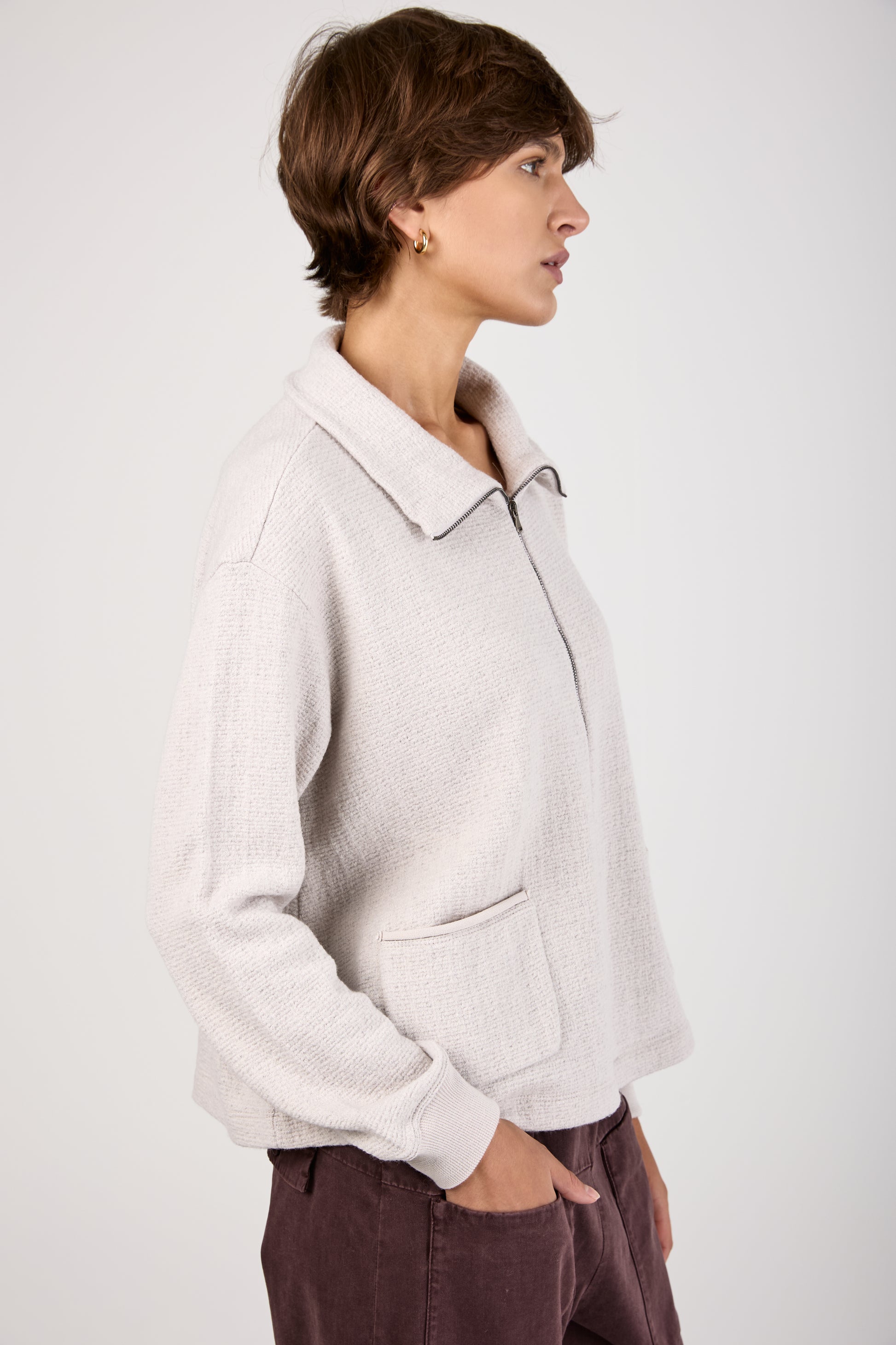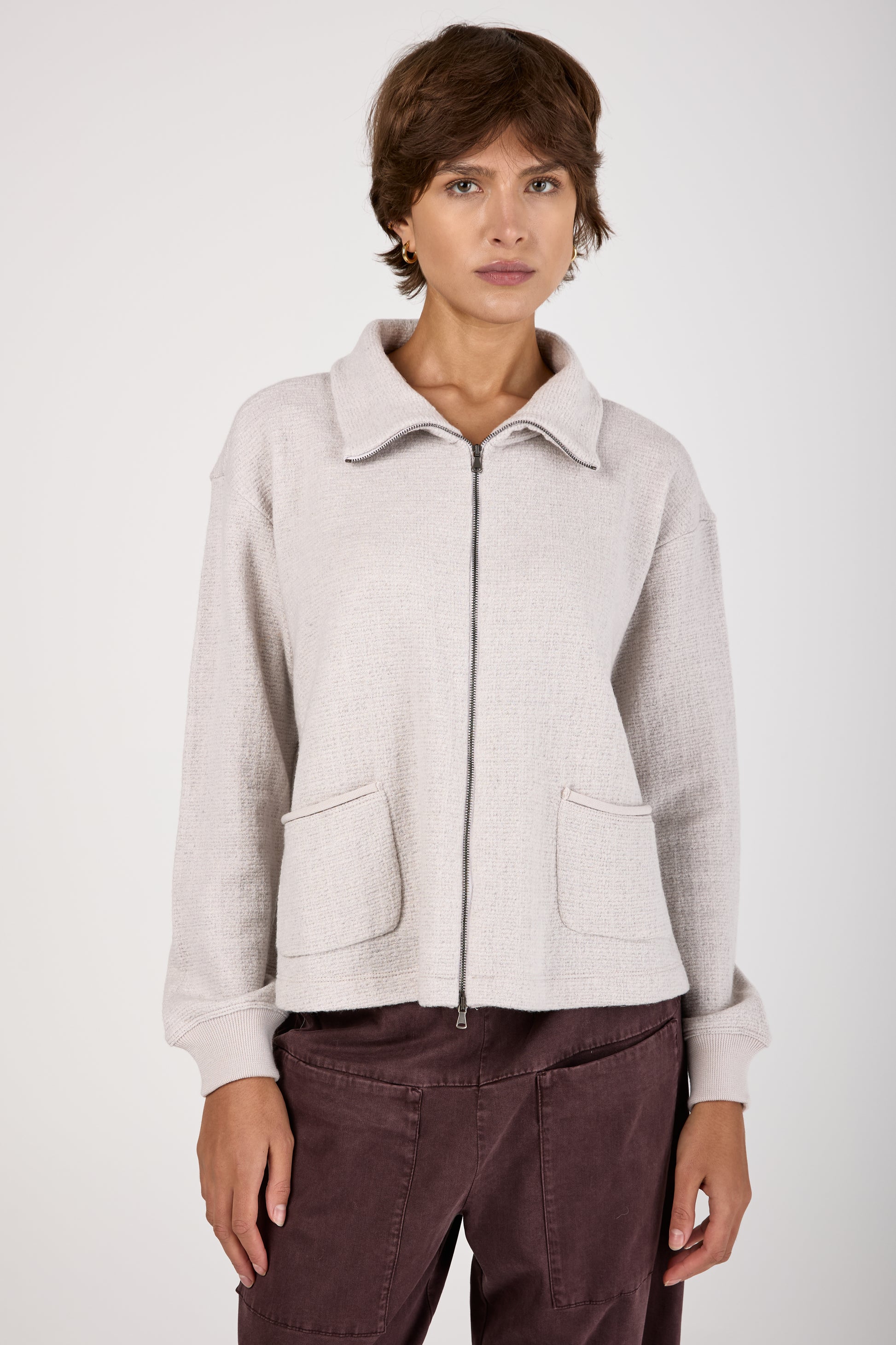 TRANSIT Wool Viscose Zipped Jacket in Ice. Wide jacket made of wool and viscose knit with jacquard micro-pattern. With a dropped shoulder style, patch pockets and wide sleeves closed by rib knit cuffs. Made in Italy.