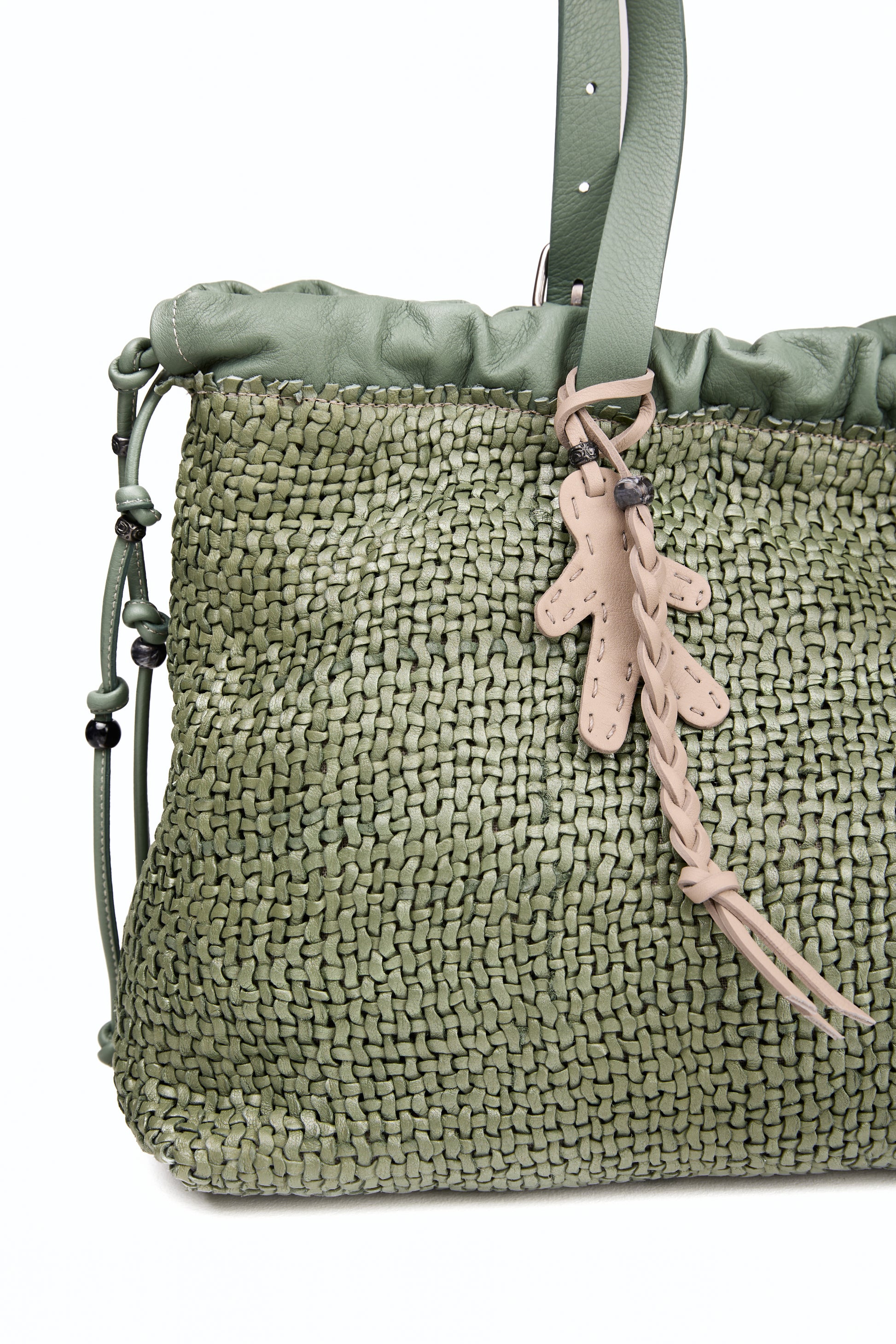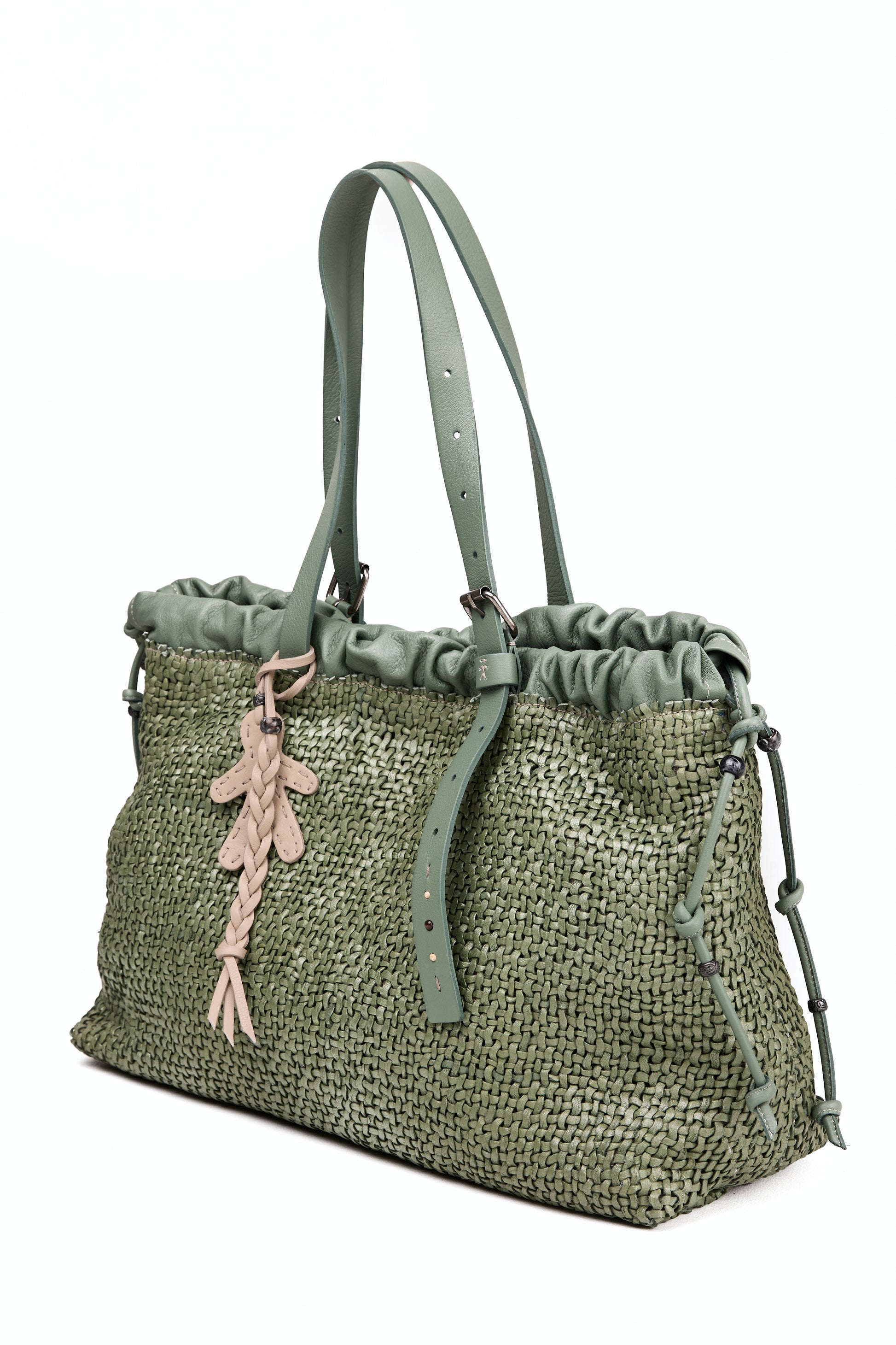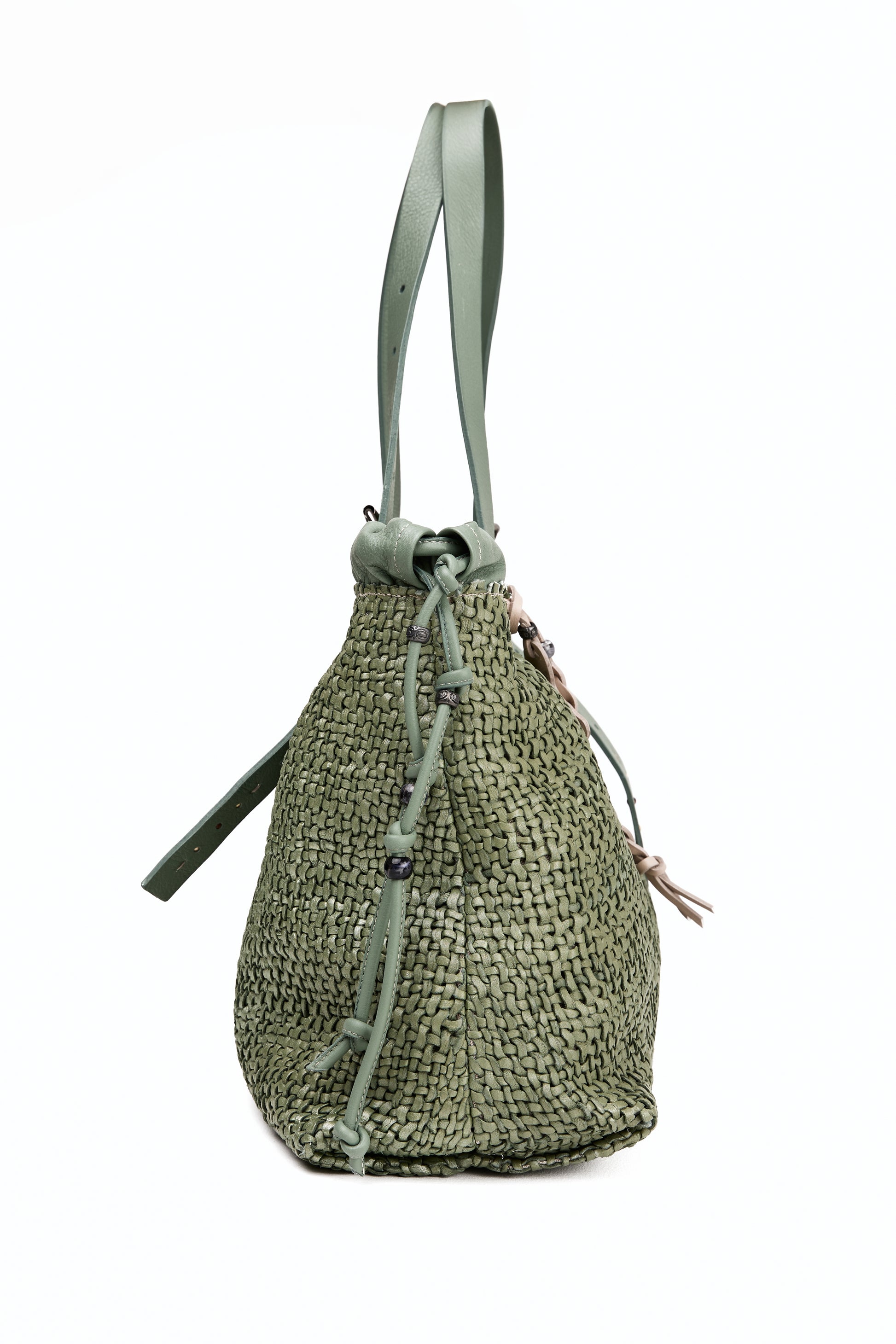 HENRY BEGUELIN Woven Intreccio Leather Arricciata Bag in Madreperla Agave. Shopping shoulder bag design with buckle and gathered detailing. Featuring a decorative top coulisse closure with leather laces. Made of superior quality woven calfskin leather with a pearlized effect.