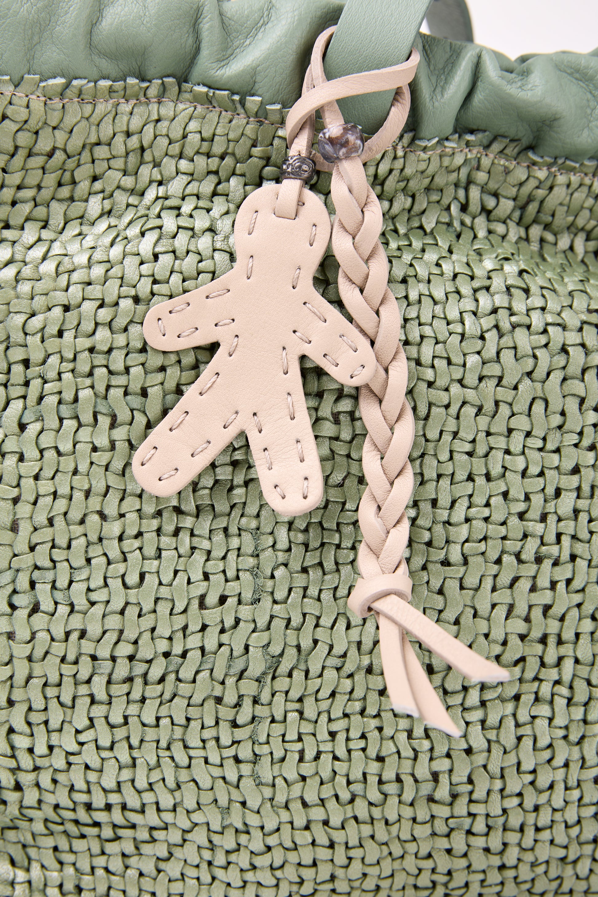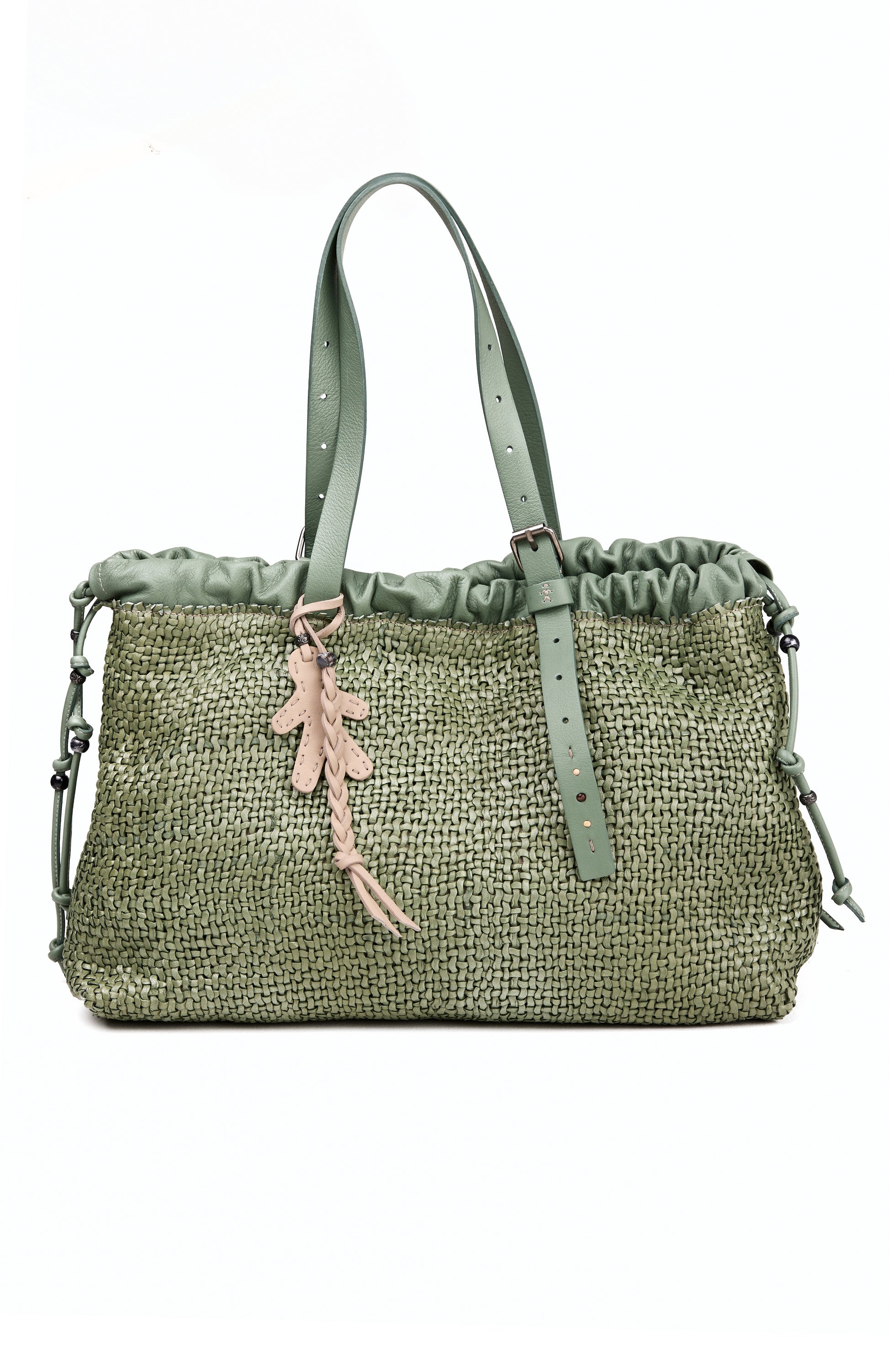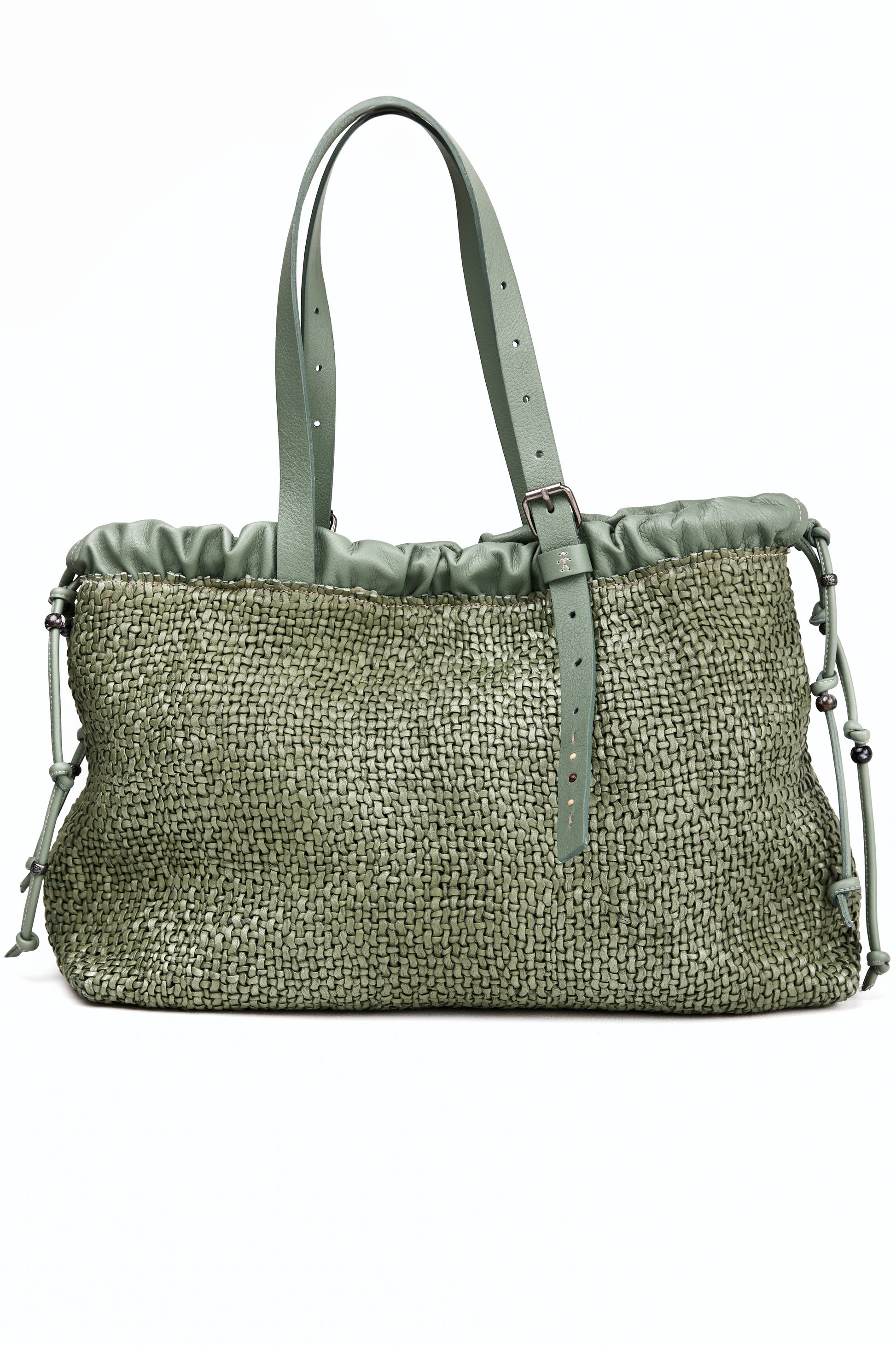 HENRY BEGUELIN Woven Intreccio Leather Arricciata Bag in Madreperla Agave. Shopping shoulder bag design with buckle and gathered detailing. Featuring a decorative top coulisse closure with leather laces. Made of superior quality woven calfskin leather with a pearlized effect.
